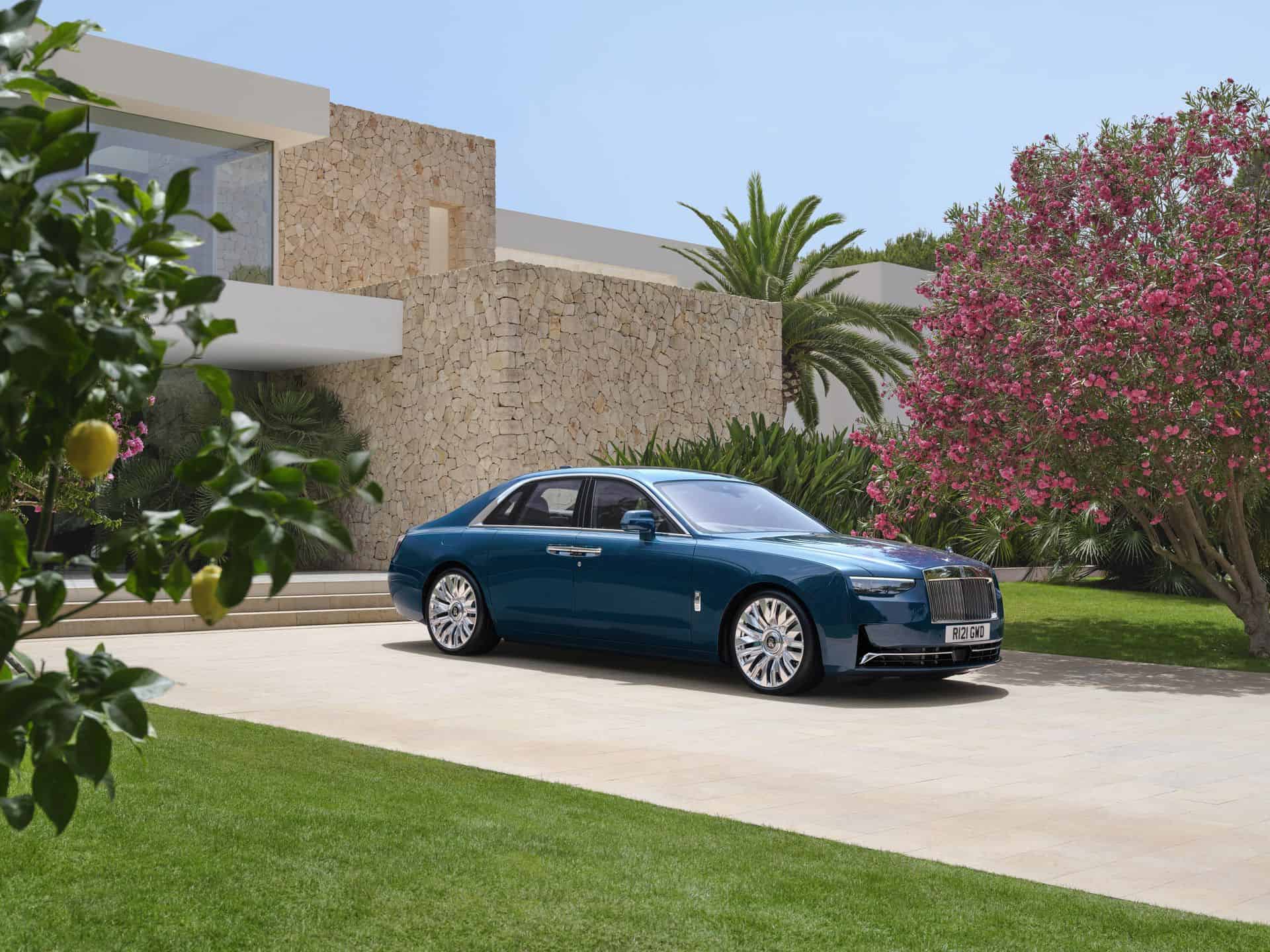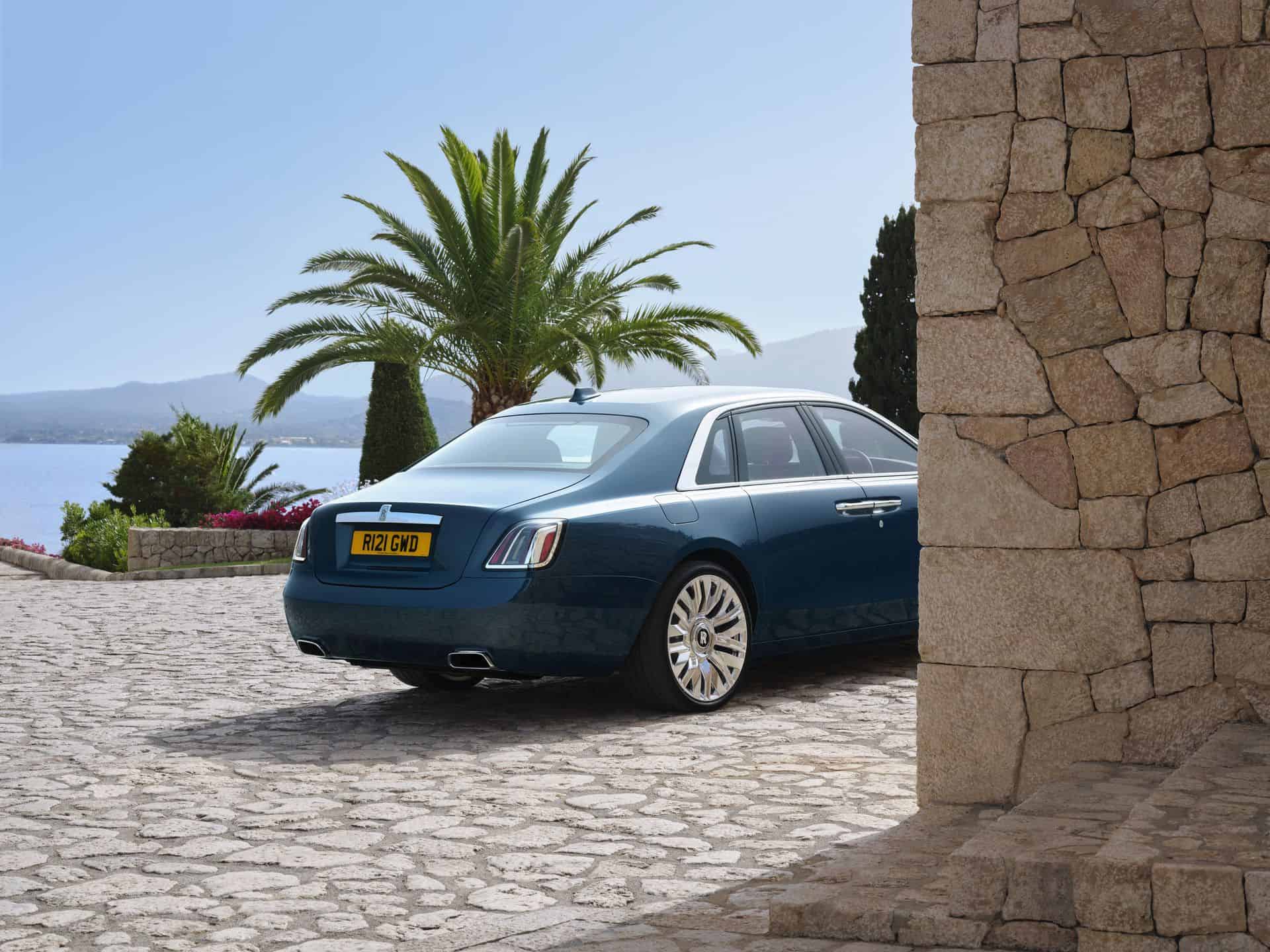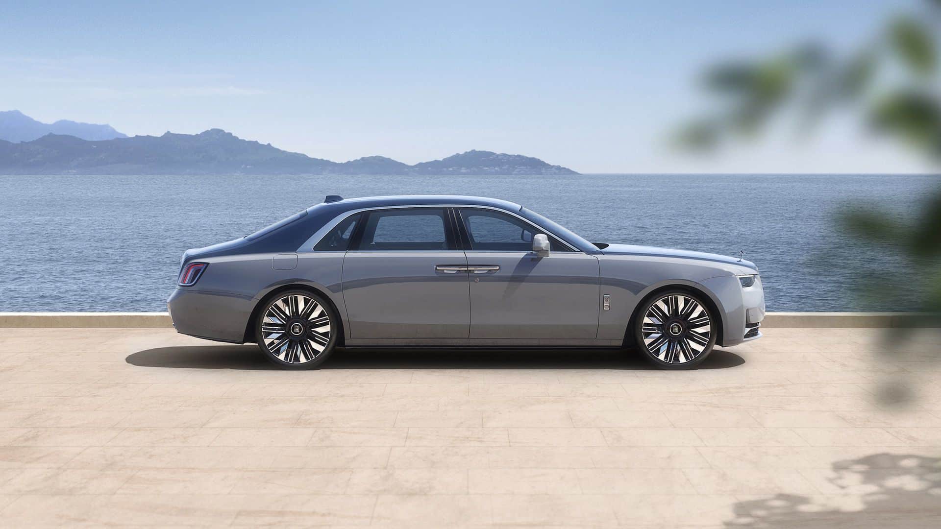 Since this is only a facelift, the profile hasn’t changed. However, there are a couple of new 22-inch wheels with a nine-spoke design. One of them has a fully polished finish while the other is partially polished. At the rear, the taillights have new graphics derived from the Spectre, RR’s first electric coupe. Because more than 44,000 colors apparently weren’t enough already, the 2025 Ghost is also offered in this fresh Mustique Blue hue.