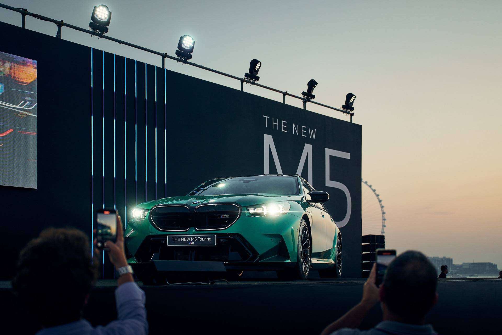 Cue the jokes about the helicopter struggling to carry the new M5’s weight. With that out of the way, the G99 Touring made a splash at its premiere in Dubai. The local BMW dealer put the super wagon on a platform that was hoisted by a helicopter. That’s certainly a way to make an entrance. For maximum effect, the fast estate was dressed to impress in an Individual paint, Isle of Man Green.