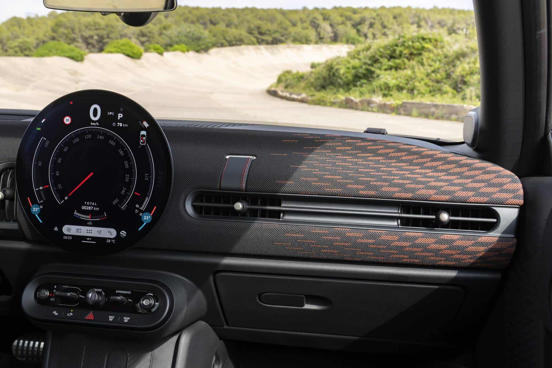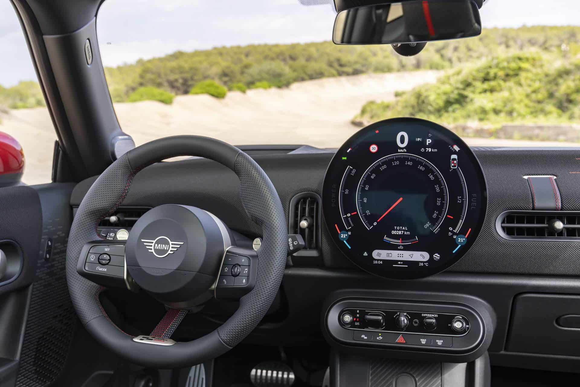 The interior should feel instantly familiar with its red and black theme and that circular OLED center screen. Having said goodbye to real leather, the seats come wrapped in synthetic leather combined with a knitted fabric and red stitching. The dashboard features a knitted surface with a black and red pattern, bringing the racing heritage of MINI John Cooper Works directly into the cockpit.