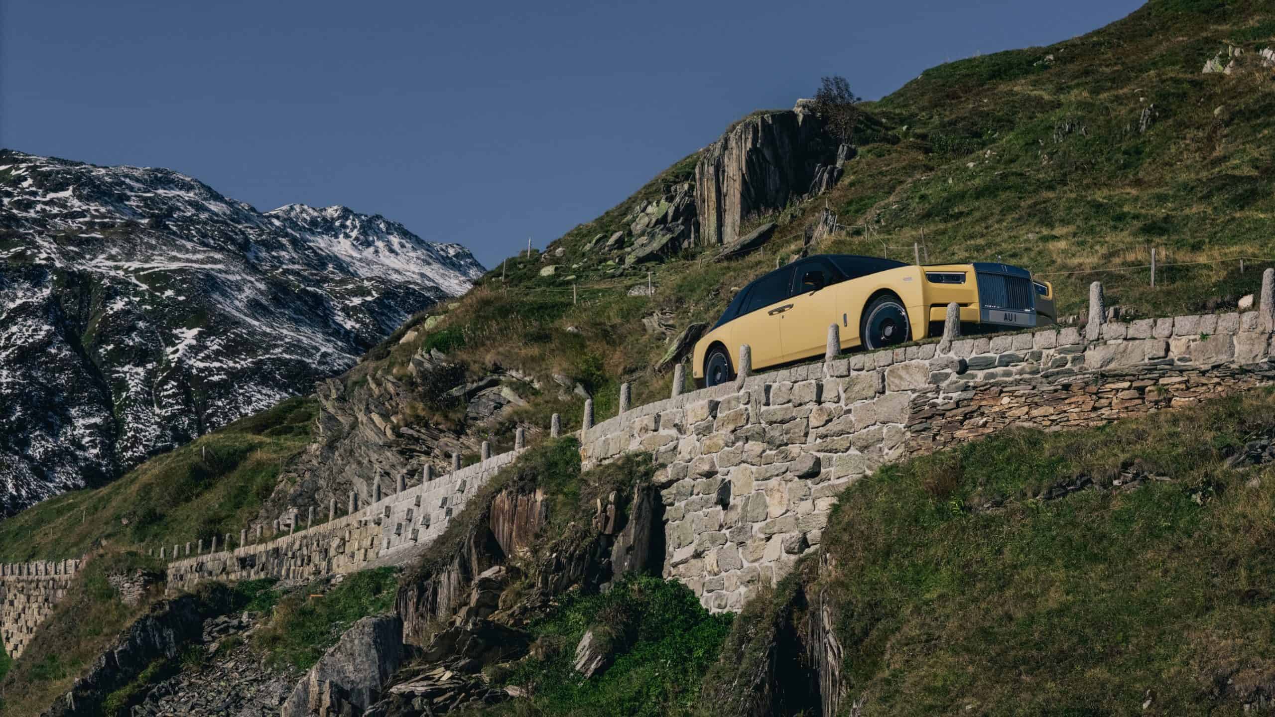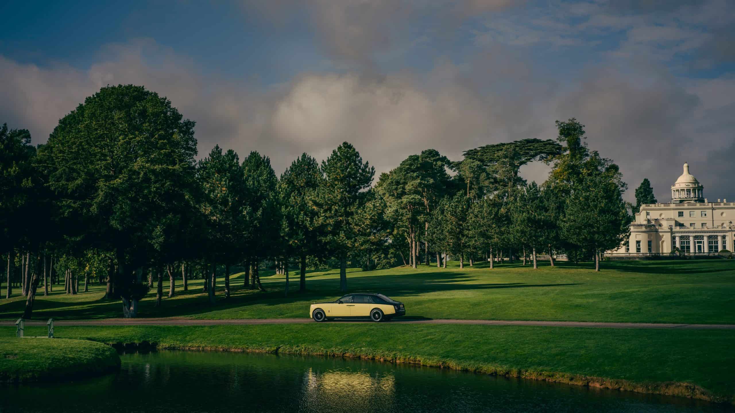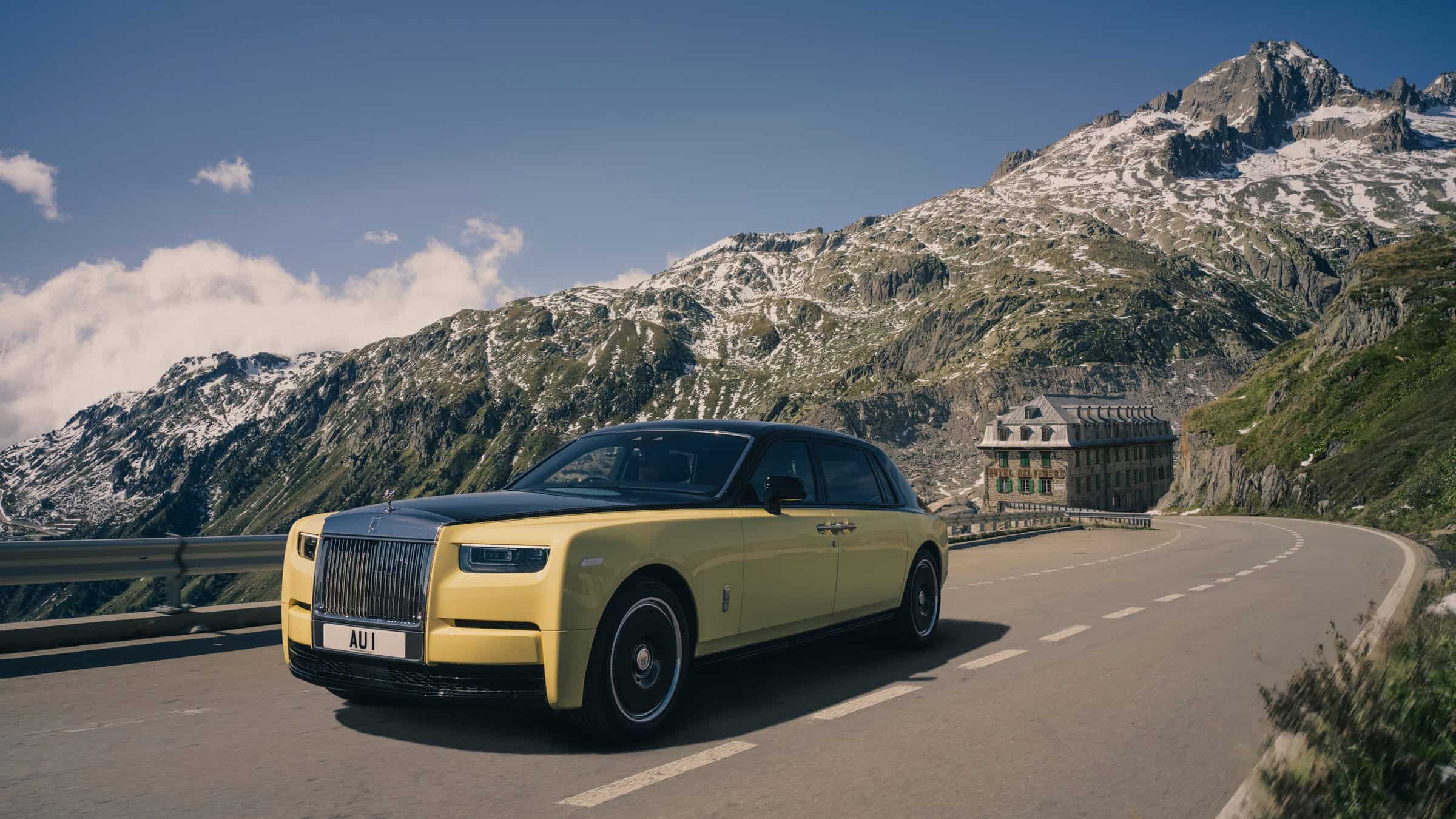 Starting with a Phantom Extended, Rolls-Royce made a one-off with exactly the same yellow shade as the movie car. They achieved the two-tone finish by painting the upper body, above the signature coachline, in black. The 21-inch black wheels with a disc-like design and silver accents are also a throwback to Phantom III. A further visual nod to the classic car is noticeable at the front where the Spirit of Ecstasy figurine has solid gold inserts combined with a silver coat.