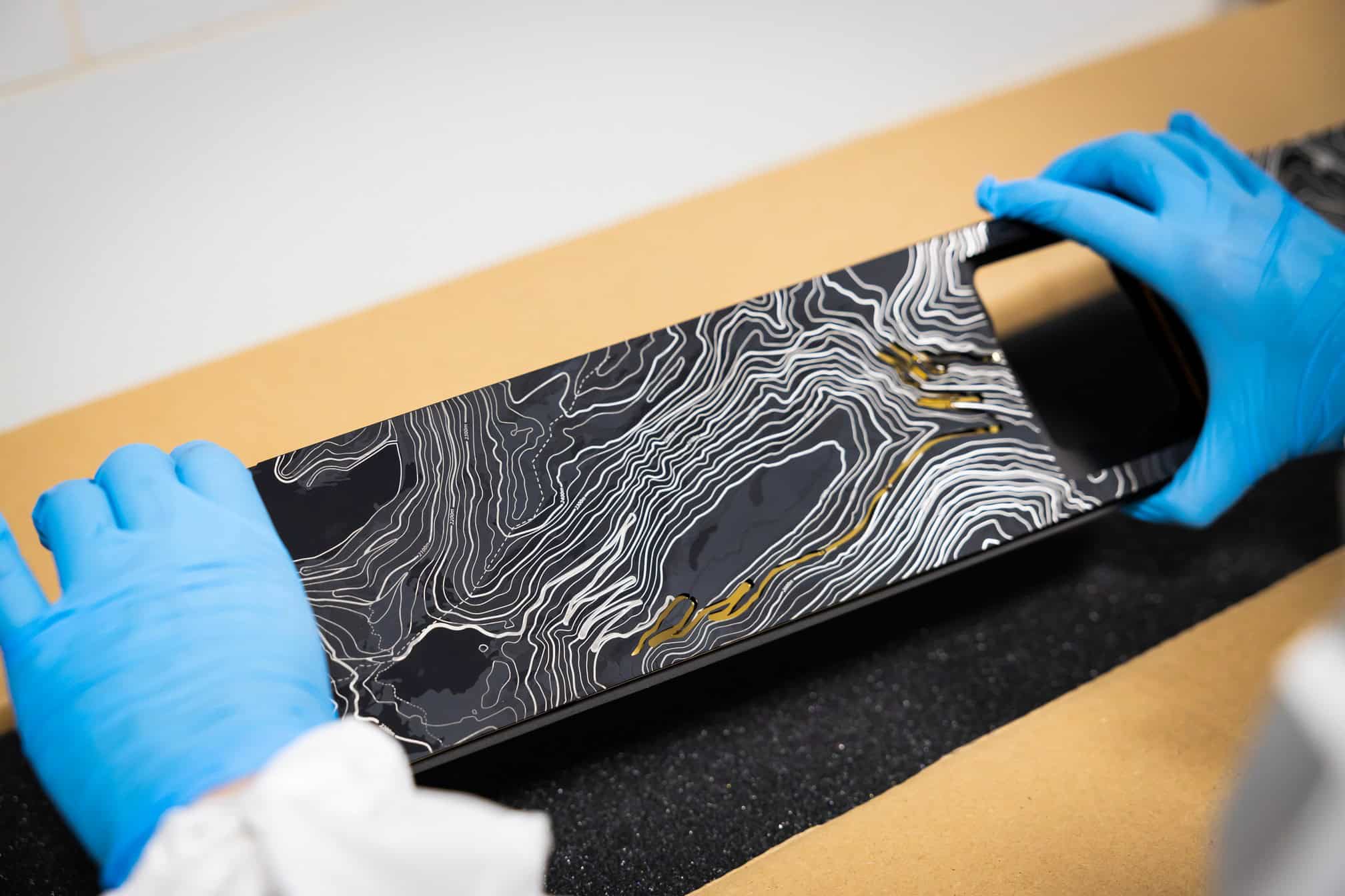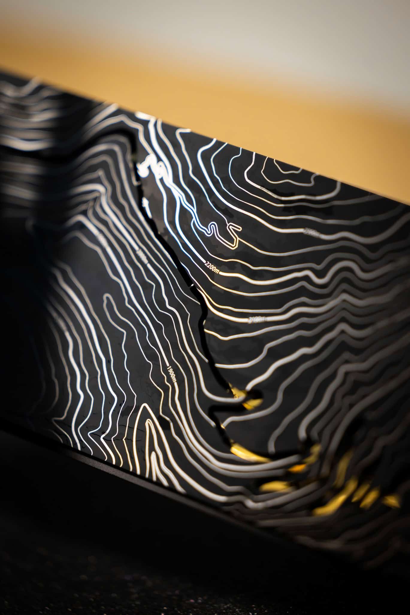 In the back, the picnic tables made from walnut have 22-carat gold inlays that are only 0.1 mm deep. It took RR six months and three prototypes to finalize the design. A closer look reveals a fictional map of Fort Knox with all the locations where Goldfinger plans to attack. Look up and the glitzy 719-star headliner shows the constellation as seen over the Furka Pass on July 11, 1964. That’s where and when filming wrapped up in Switzerland.