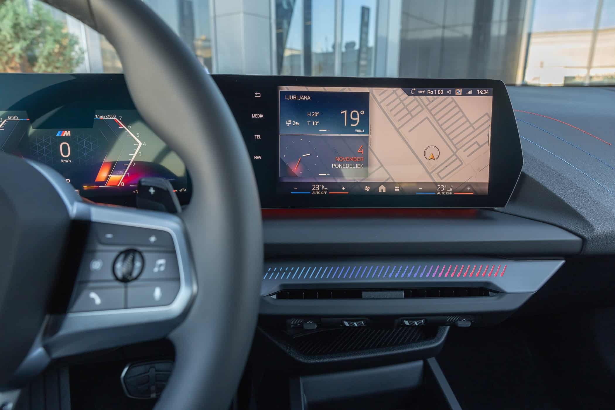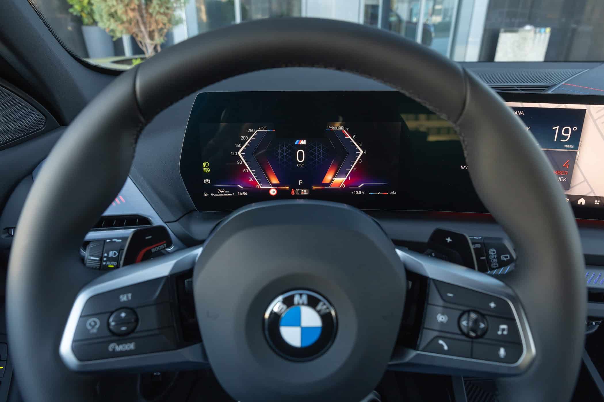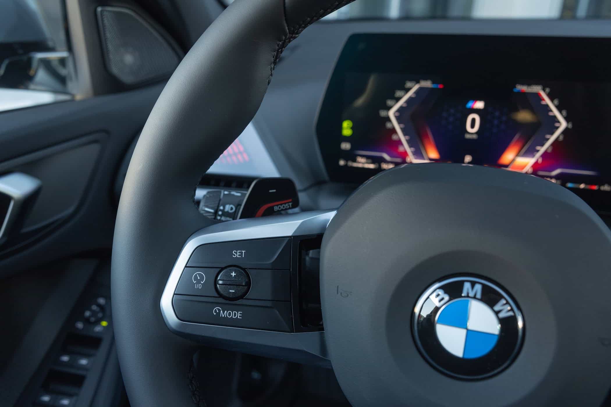 Hopping inside, it has the regular seats instead of the optional M Sport seats with integrated headrests and backlit M logos. BMW built this 120 press car with the Harman Kardon sound system, so it spared no expense while playing with the configurator. Even so, deleting the iDrive rotary knob and moving the climate controls into the touchscreen seems like a step back. This obsession with minimalism will be taken to a new level next year with the introduction of iDrive X.