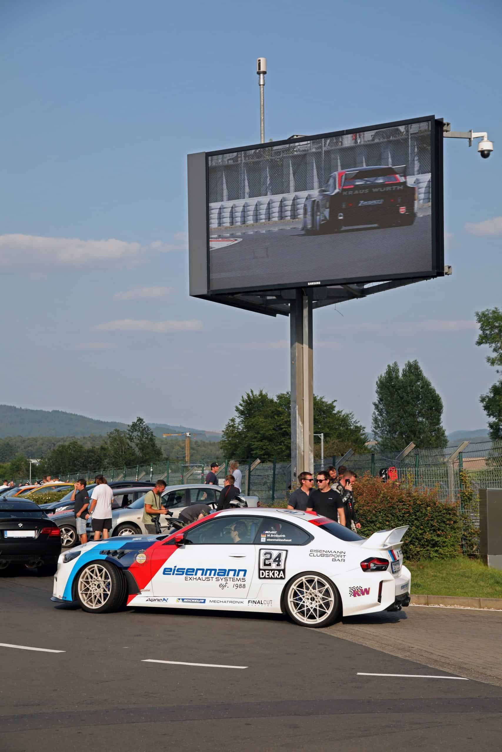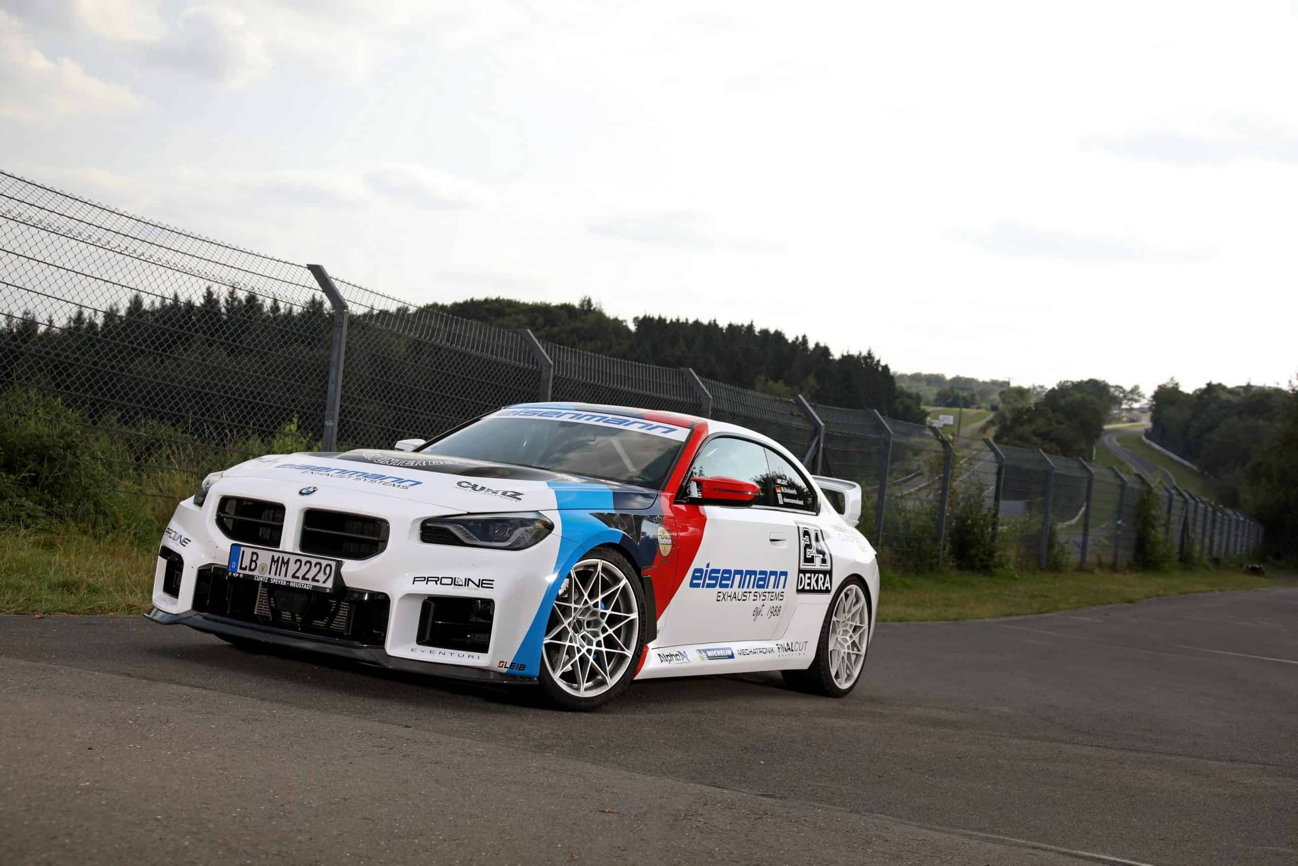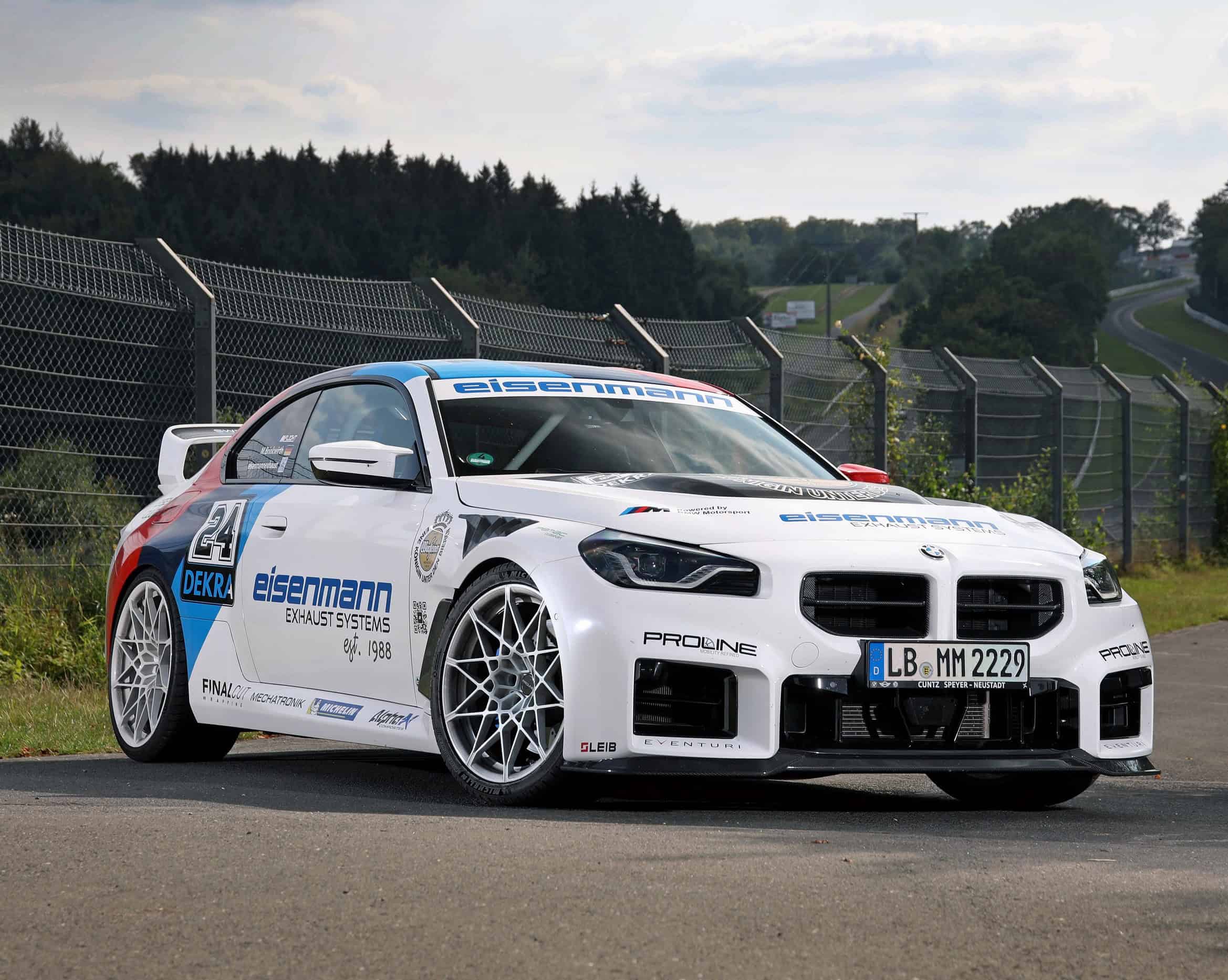 Featuring a wrap that harkens back to the M3 E30’s glory days in DTM, the M2 has been extensively modified. Of course, priority number one was to fit an Eisenmann exhaust, featuring flap control and a slip-on rear muffler. The new setup boasts quad 110-mm tips covered in carbon fiber and adorned by the company’s lettering. Alternatively, you can have the exhaust finishers in aluminum or black anodized chromium.