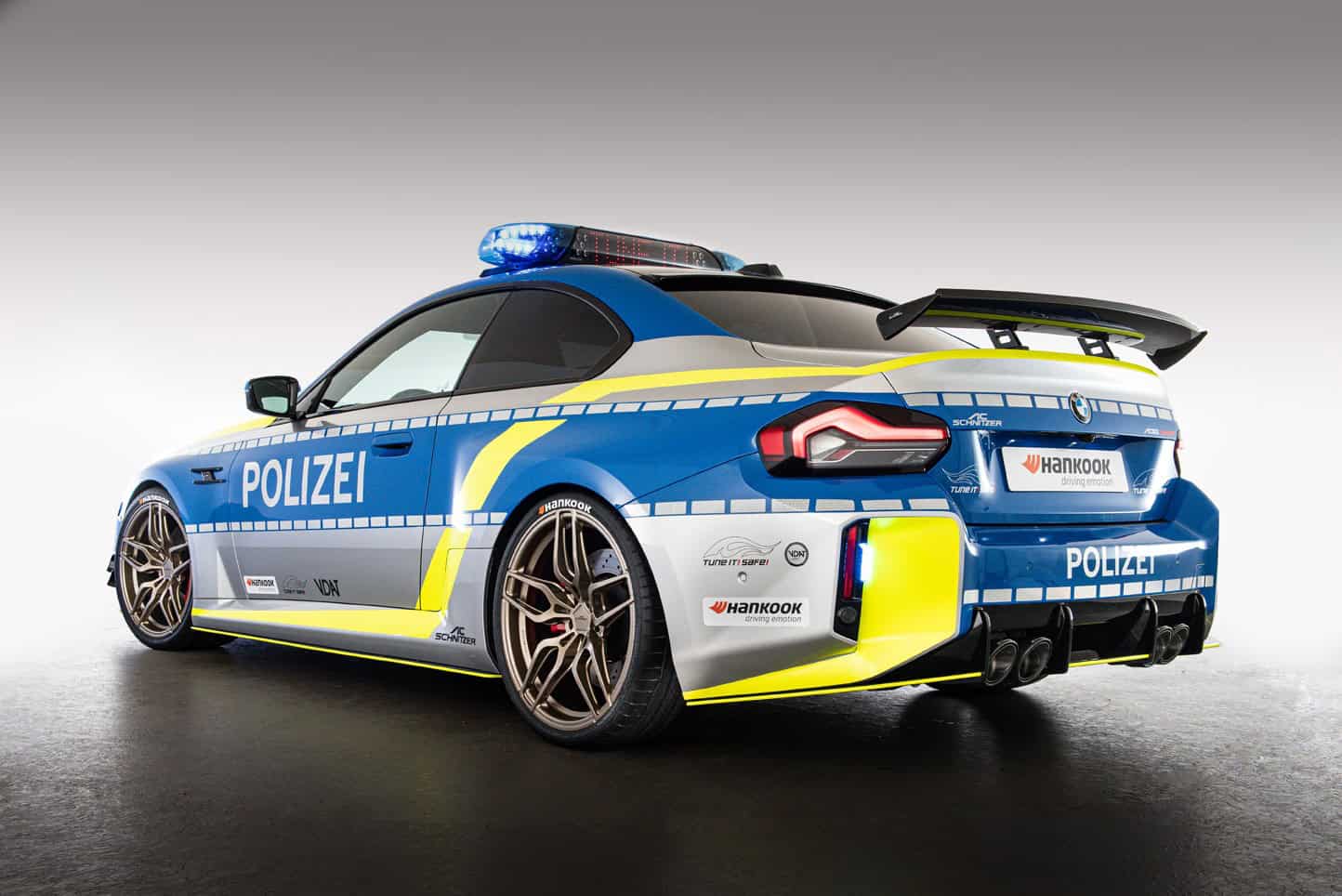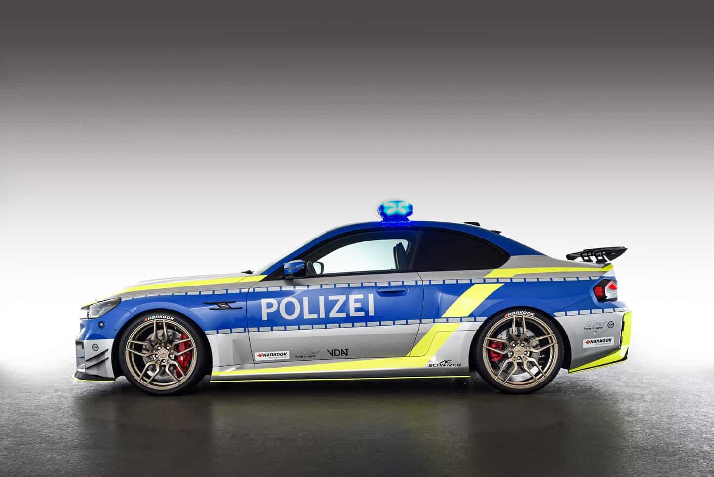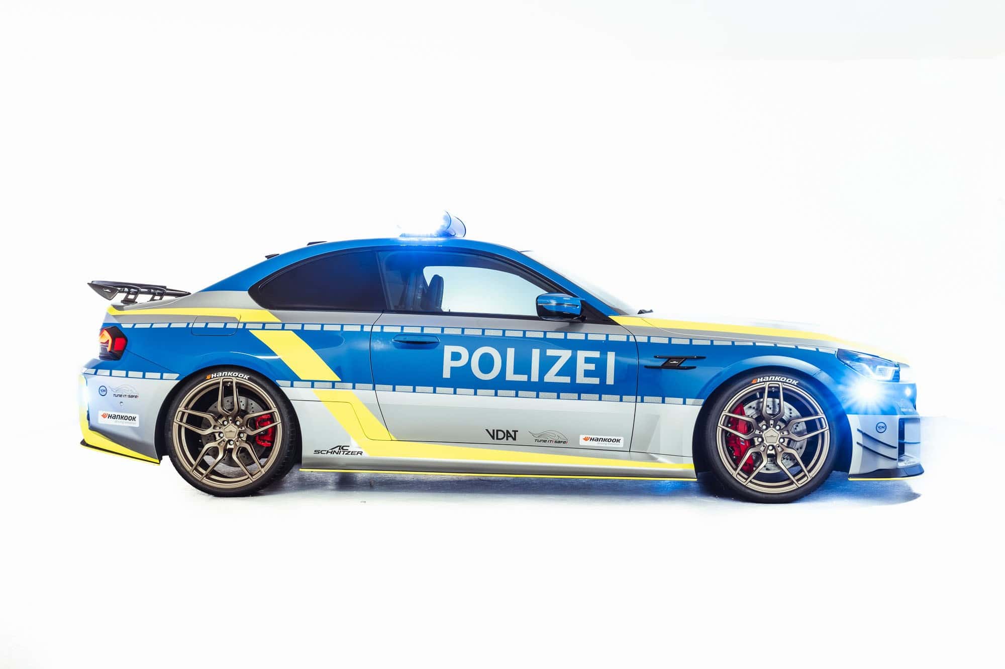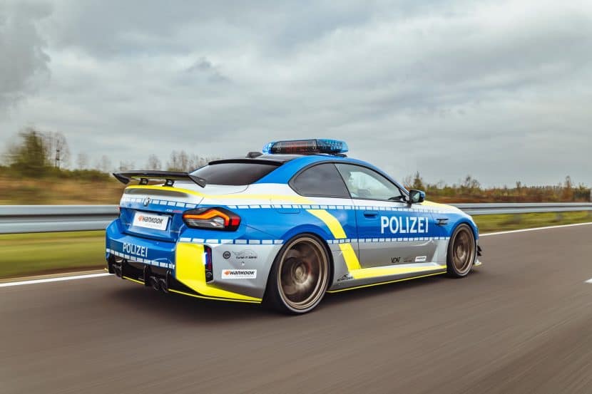 This G87 is essentially a typical BMW M2 by AC Schnitzer but with a full body wrap to mimic a police car. To drive the point home, a light bar is installed on the roof, and the tuner added LEDs within the kidney grille. There’s radio equipment and yet another light atop the dashboard as if the car wasn’t already flashy enough.