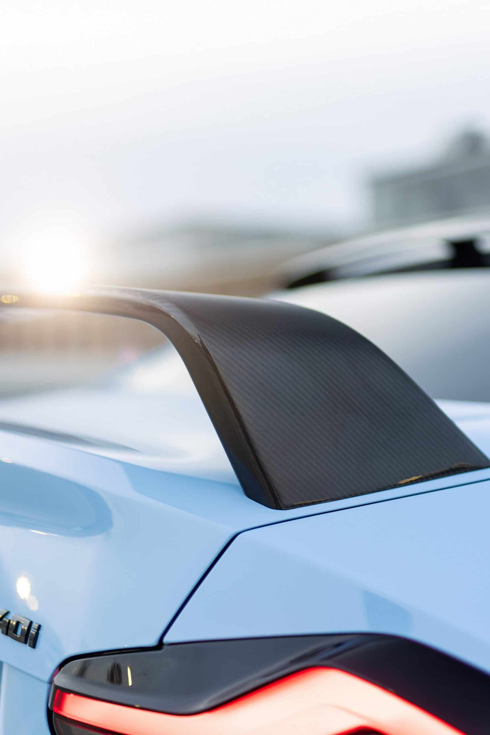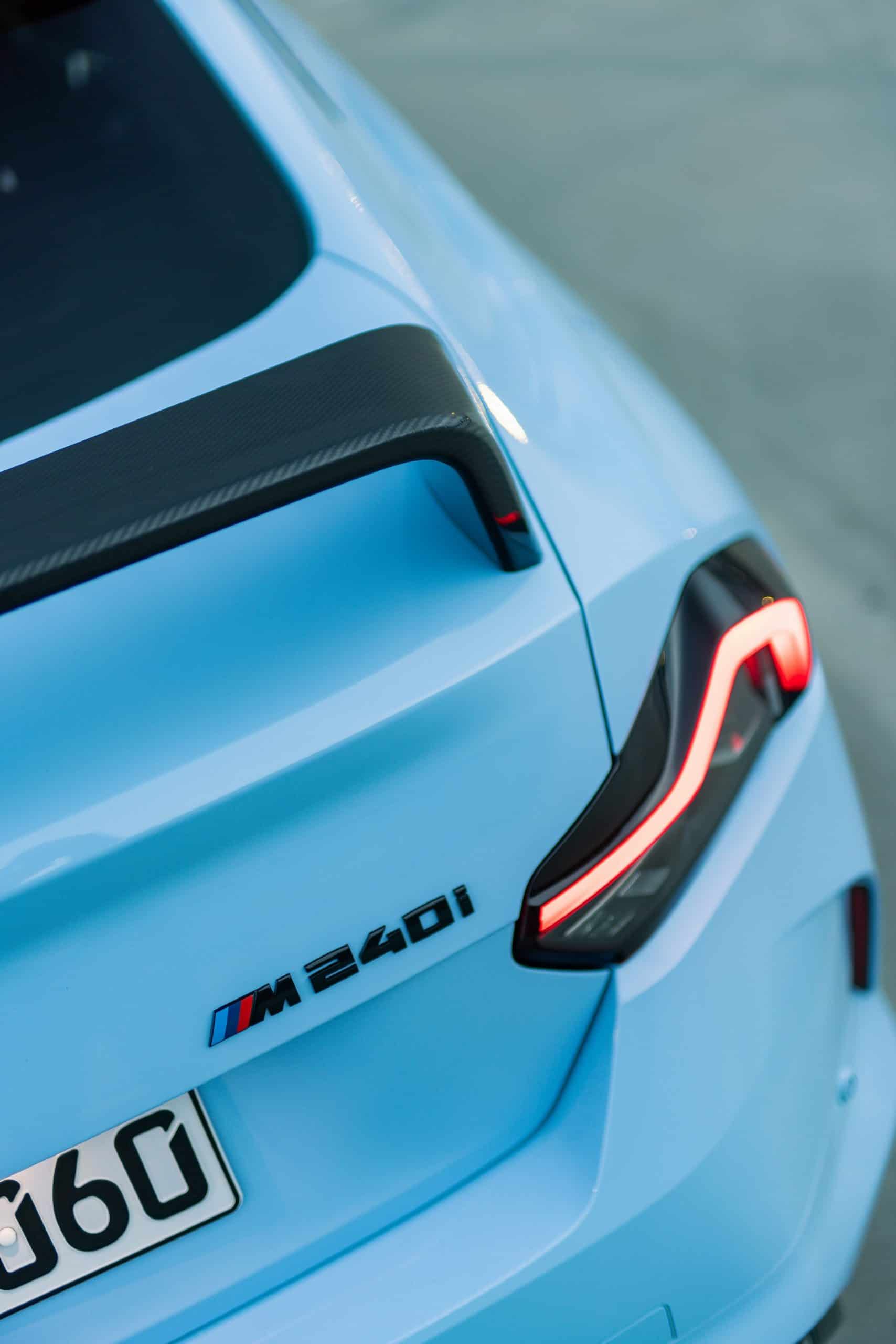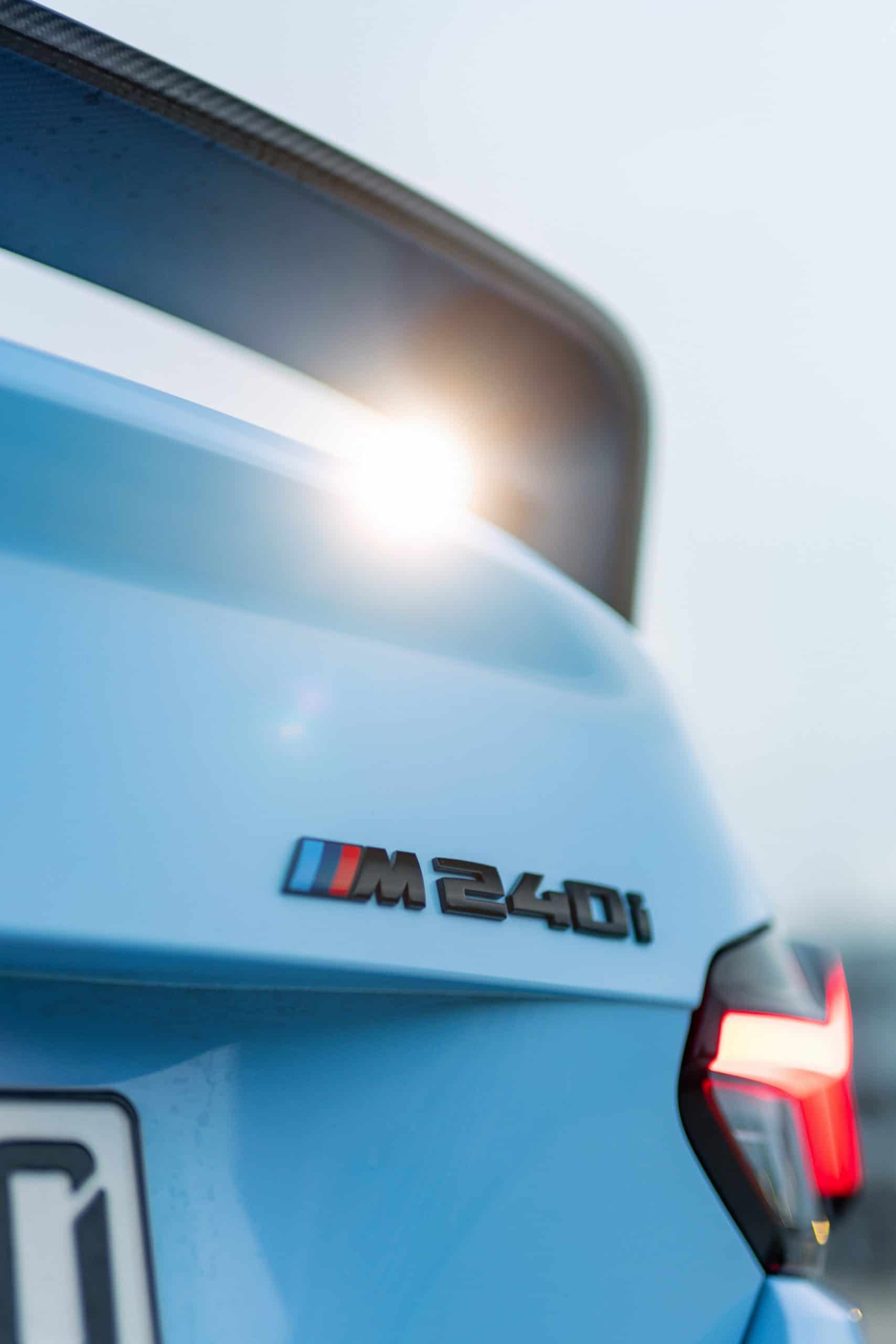 The facelifted M240i has body-colored side skirts instead of the pre-LCI model’s black look. BMW also paints the lower part of the rear apron to match the rest of the body. With M Performance Parts, it gets closer to the aggressive look of the full-fat M2. The aero body kit includes a front spoiler lip, a side skirt attachment, and a rear wing. There’s also a roof spoiler, a carbon diffuser, and a black M240i badge.