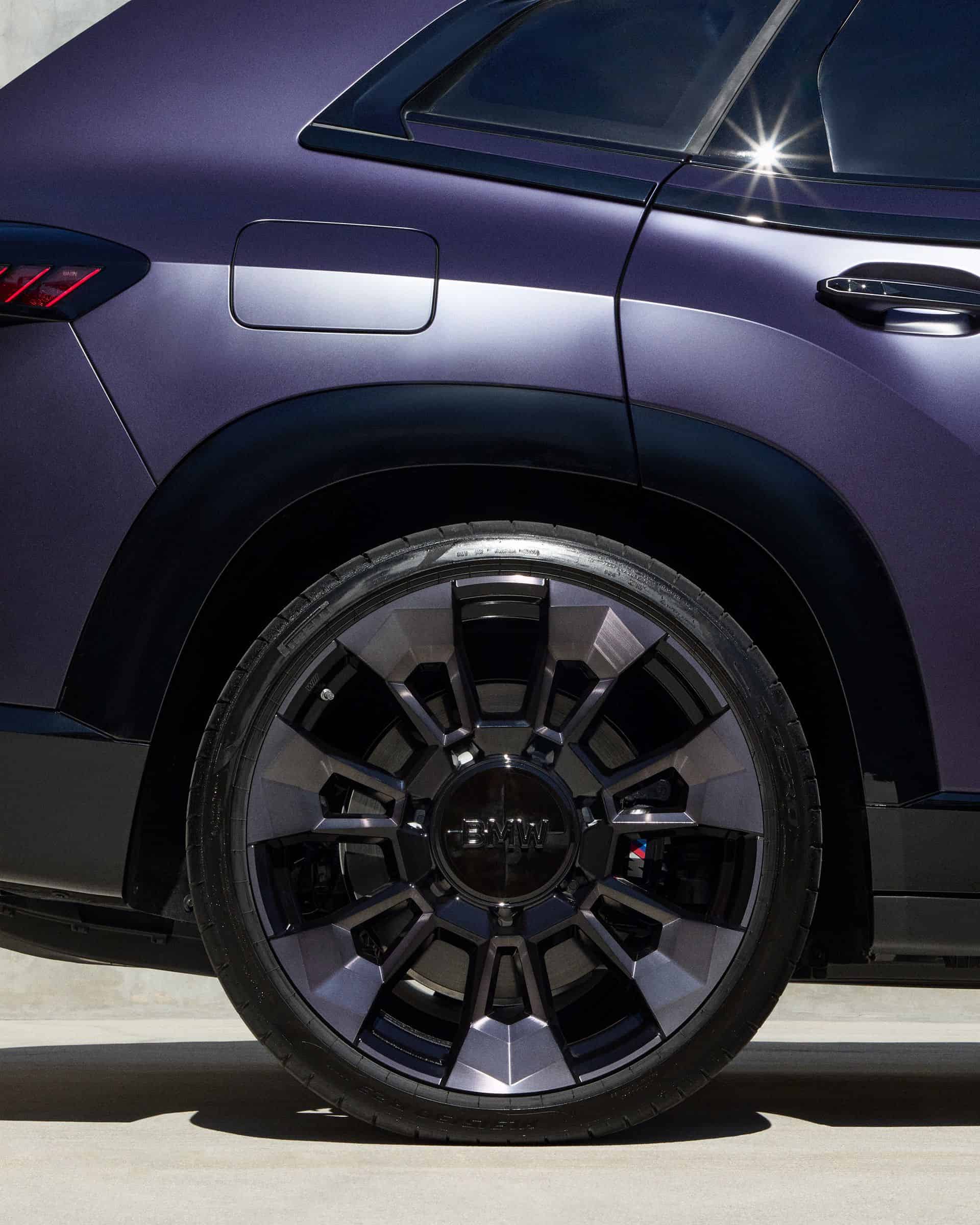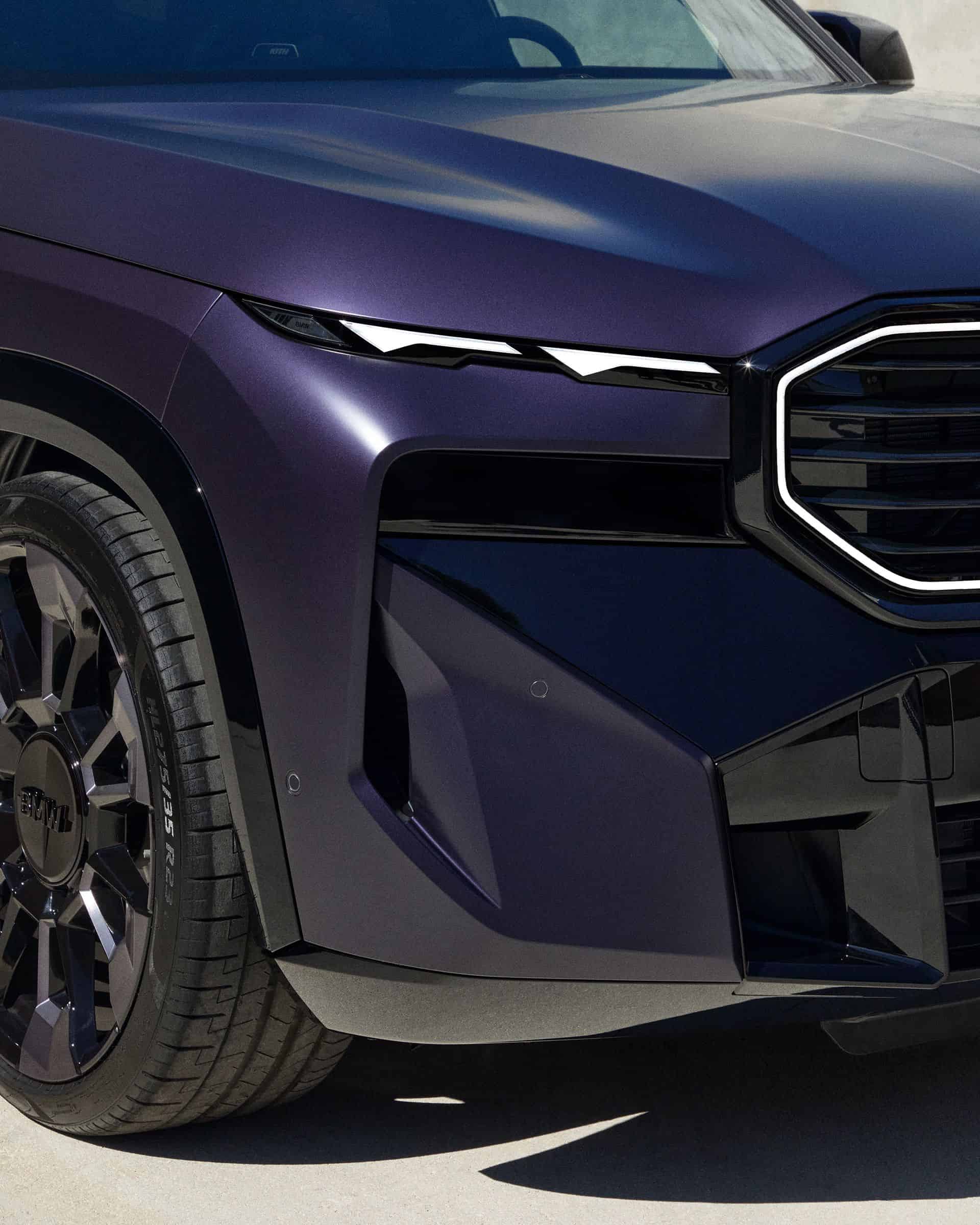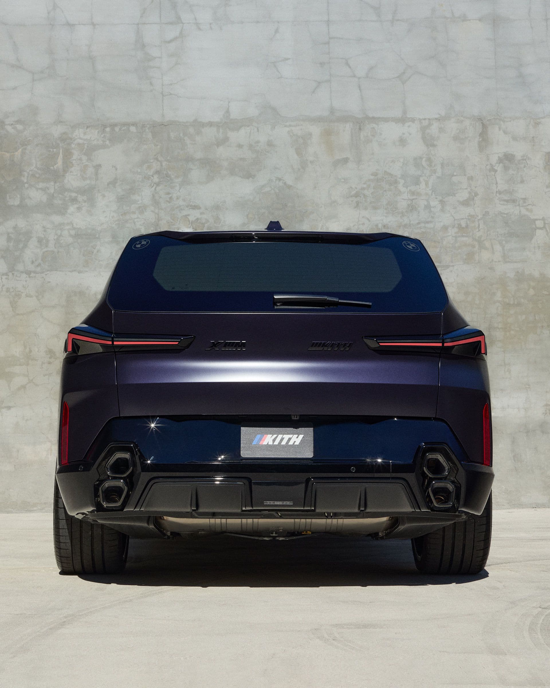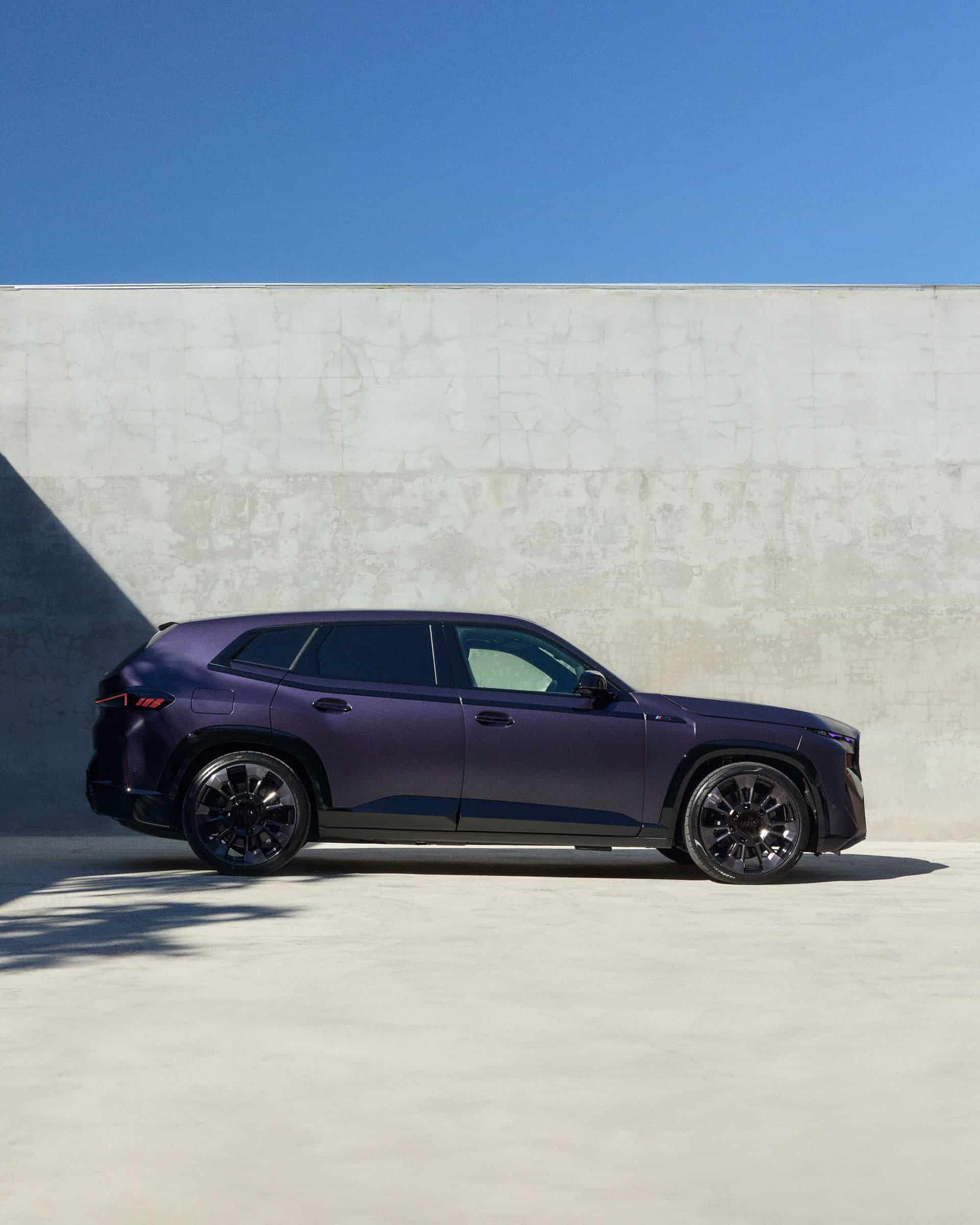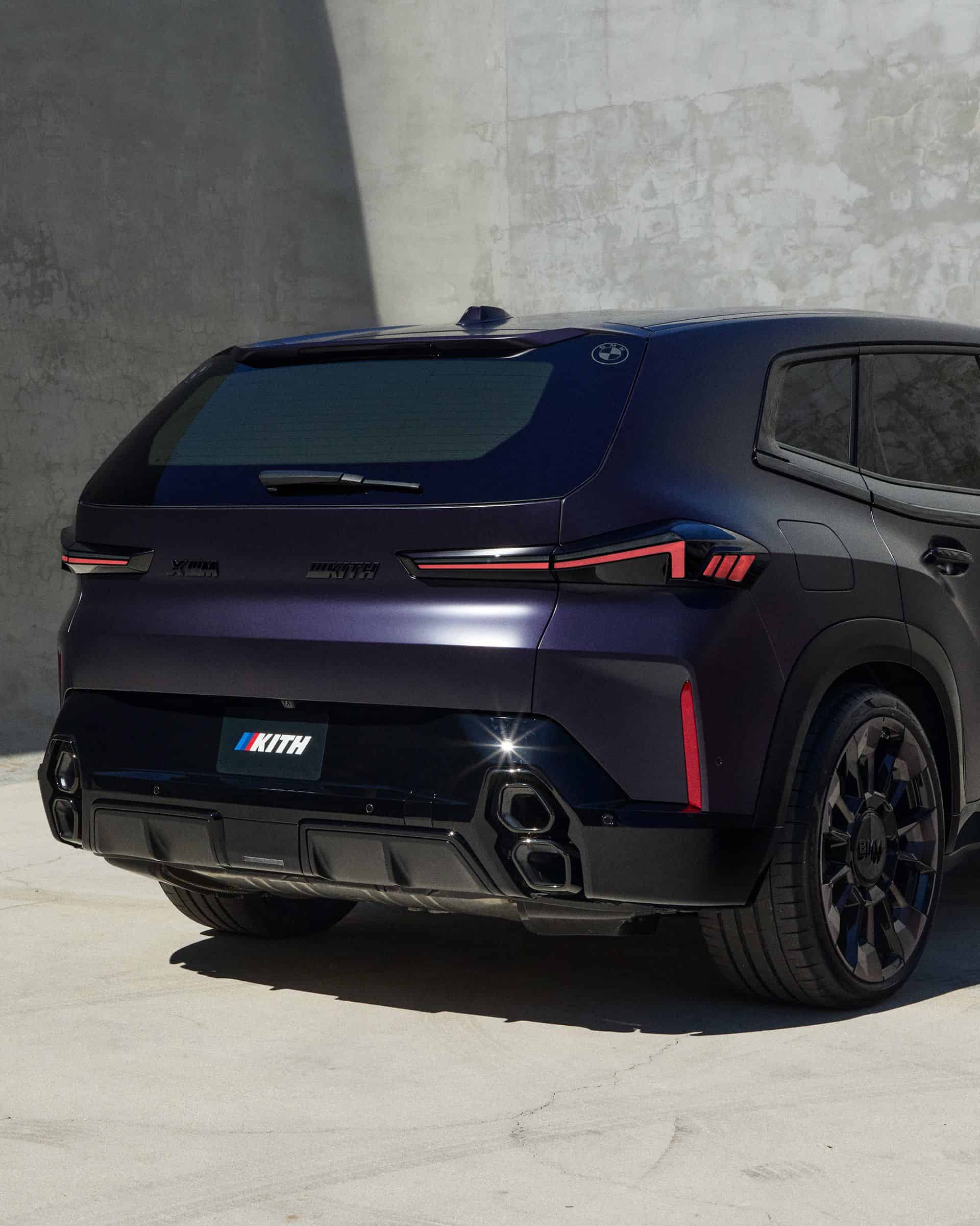 BMW widened the M behemoth by 1.57 inches (40 millimeters) at both axles after installing wheel spaces. In addition, the XM Kith concept sits closer to the road for a more aggressive stance. The ride height has dropped by 1.18 in (30 mm) at the front and 1.37 in (35 mm) at the rear. While the wheel design is familiar, the huge alloys are spruced up with purple color pigments to match the body.