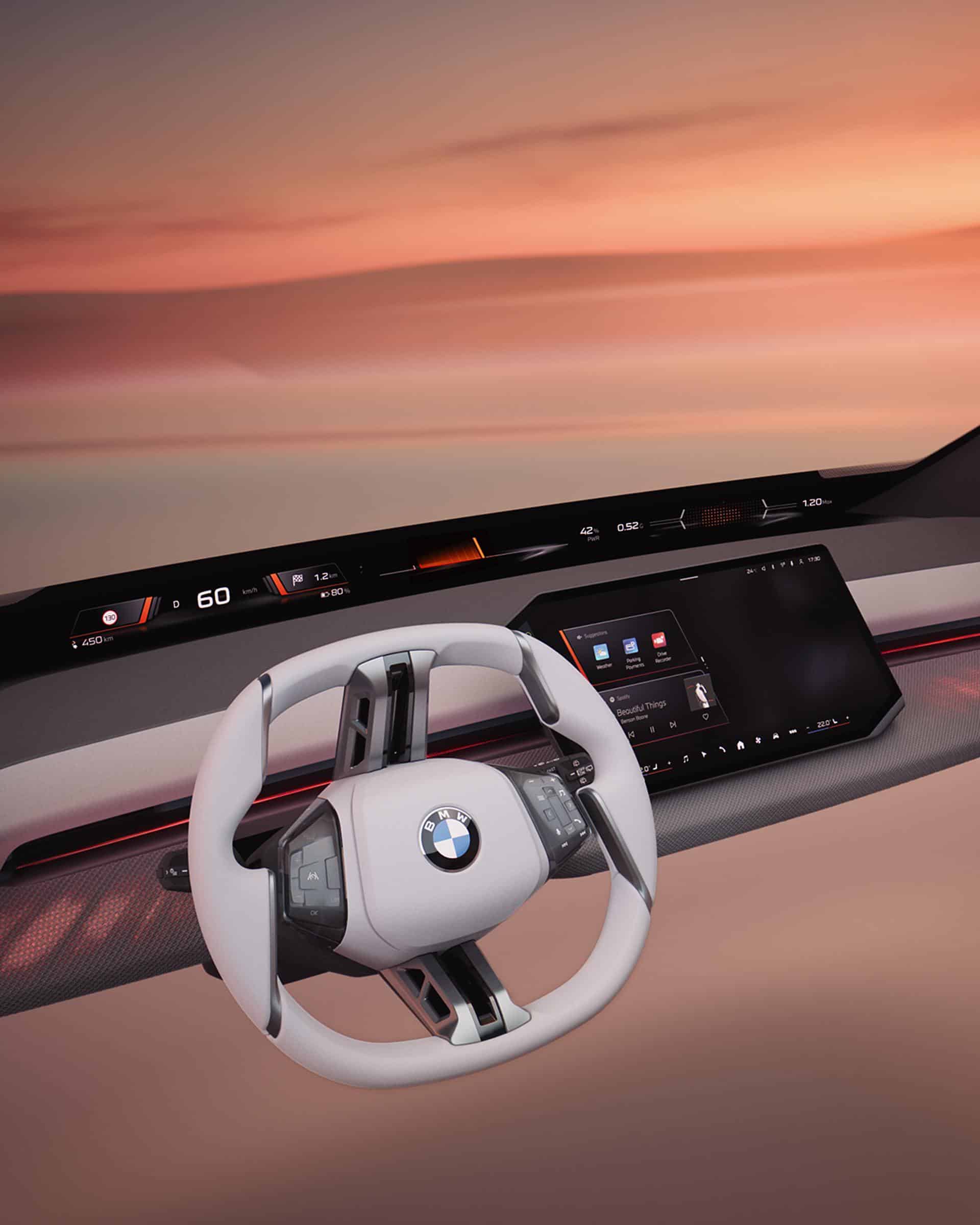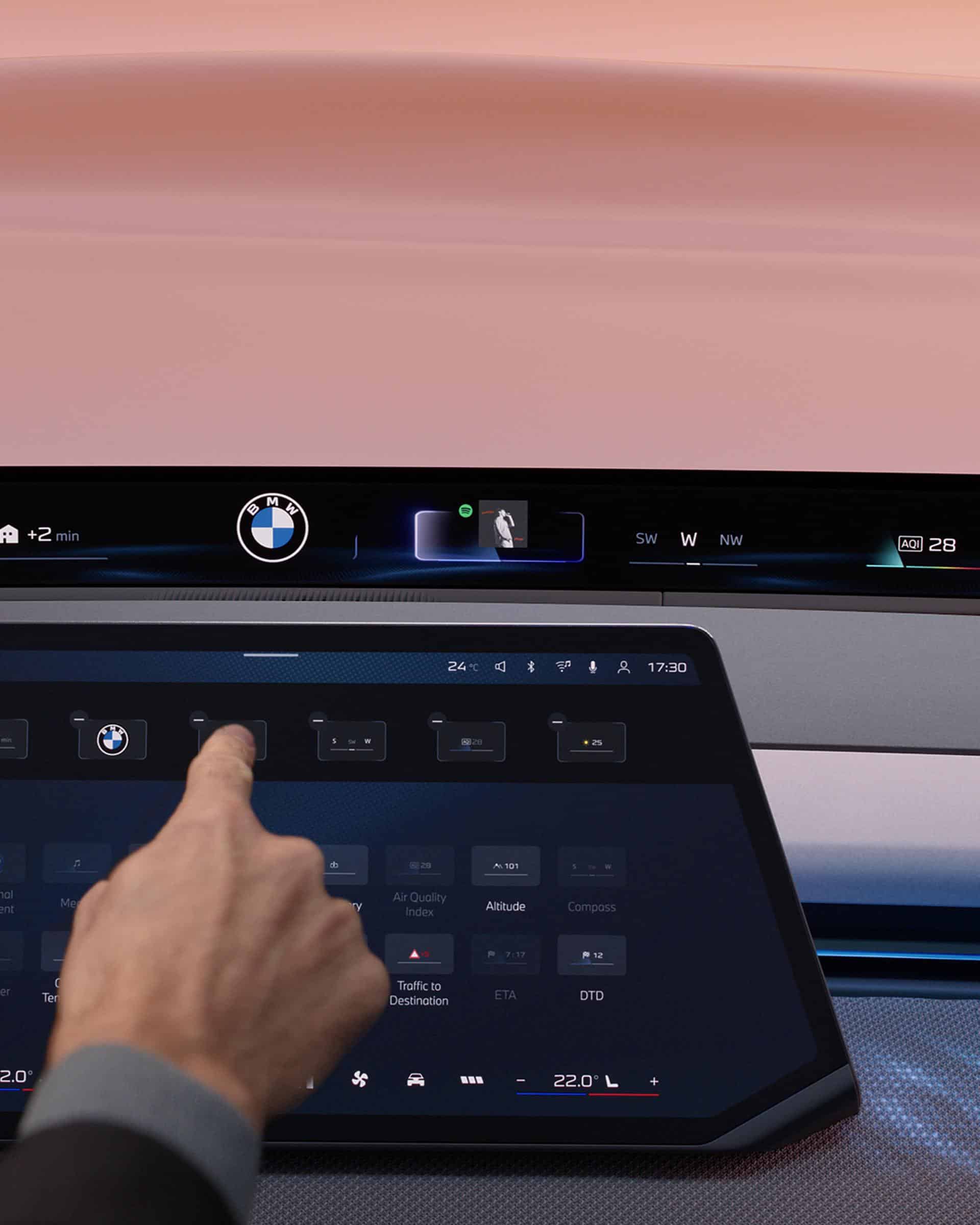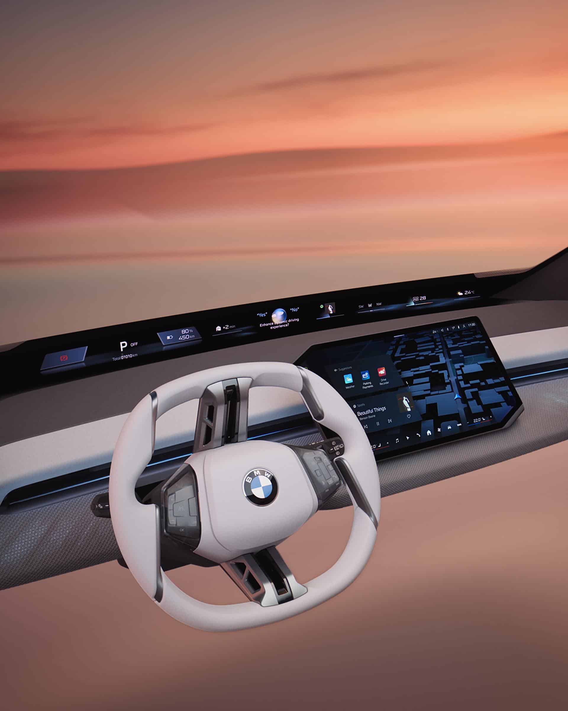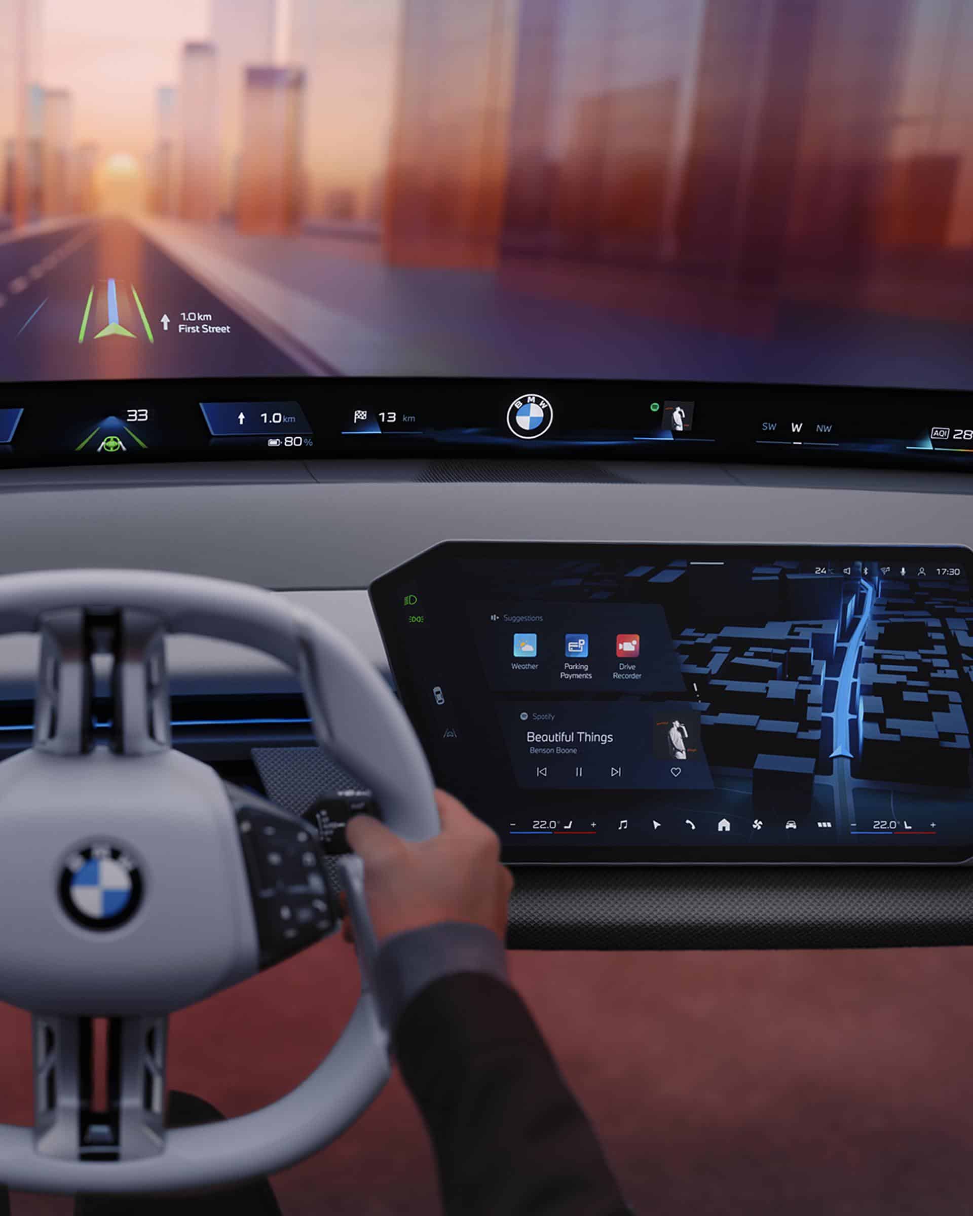 As the adjacent images show, cars with iDrive X will not be limited to the central screen. An upper-mounted projection stretching from pillar to pillar will be standard, and a 3D head-up display will also be offered in the driver’s line of sight. Despite the obvious focus on screens, not all controls will be integrated. Accessing some functions will be done through the usual stalks and haptic buttons/switches.