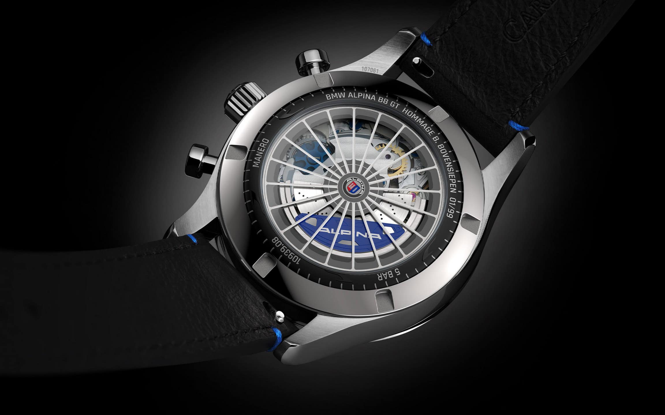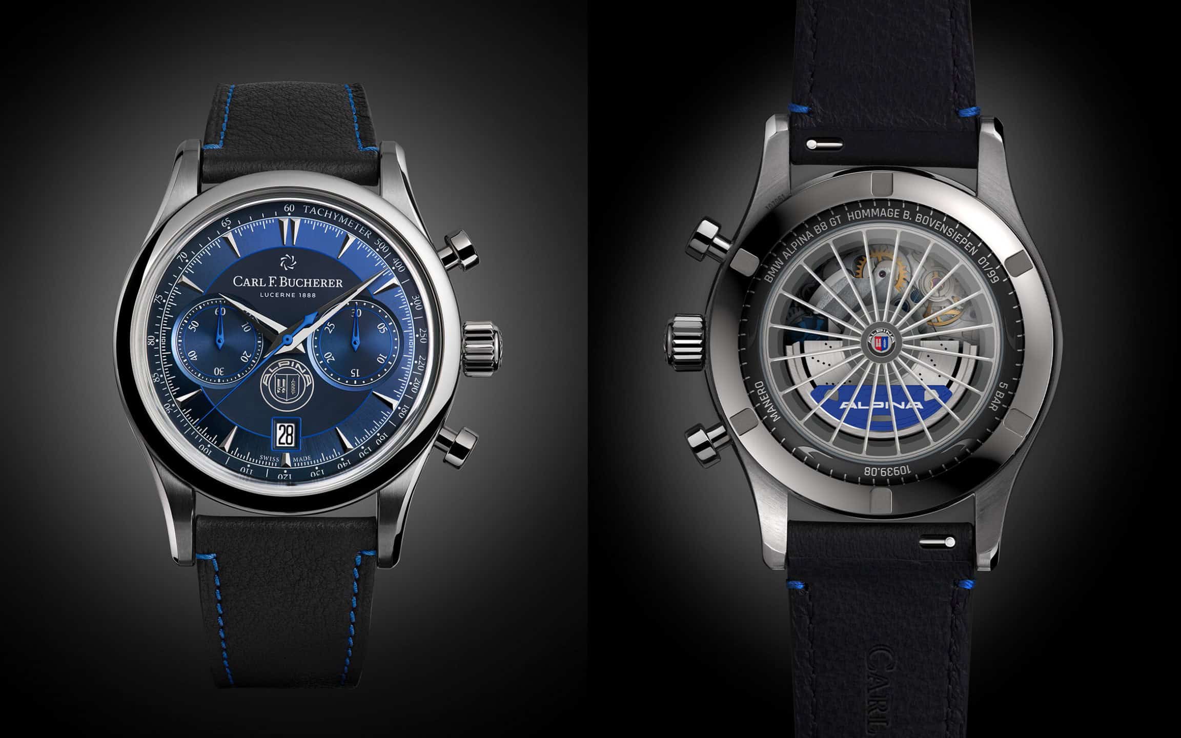Every buyer of a BMW ALPINA B8 GT will be given a special watch by Carl F. Bucherer 43mm with a blue dial and black leather strap. Additionally, two ALPINA-branded bags are included with the purchase.