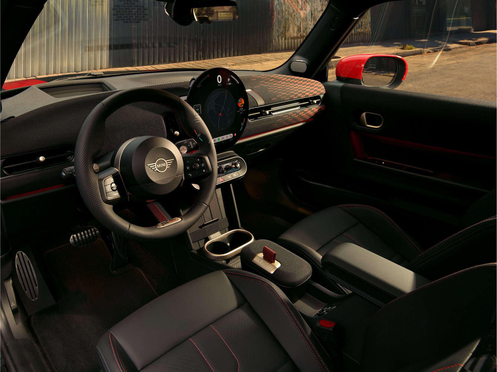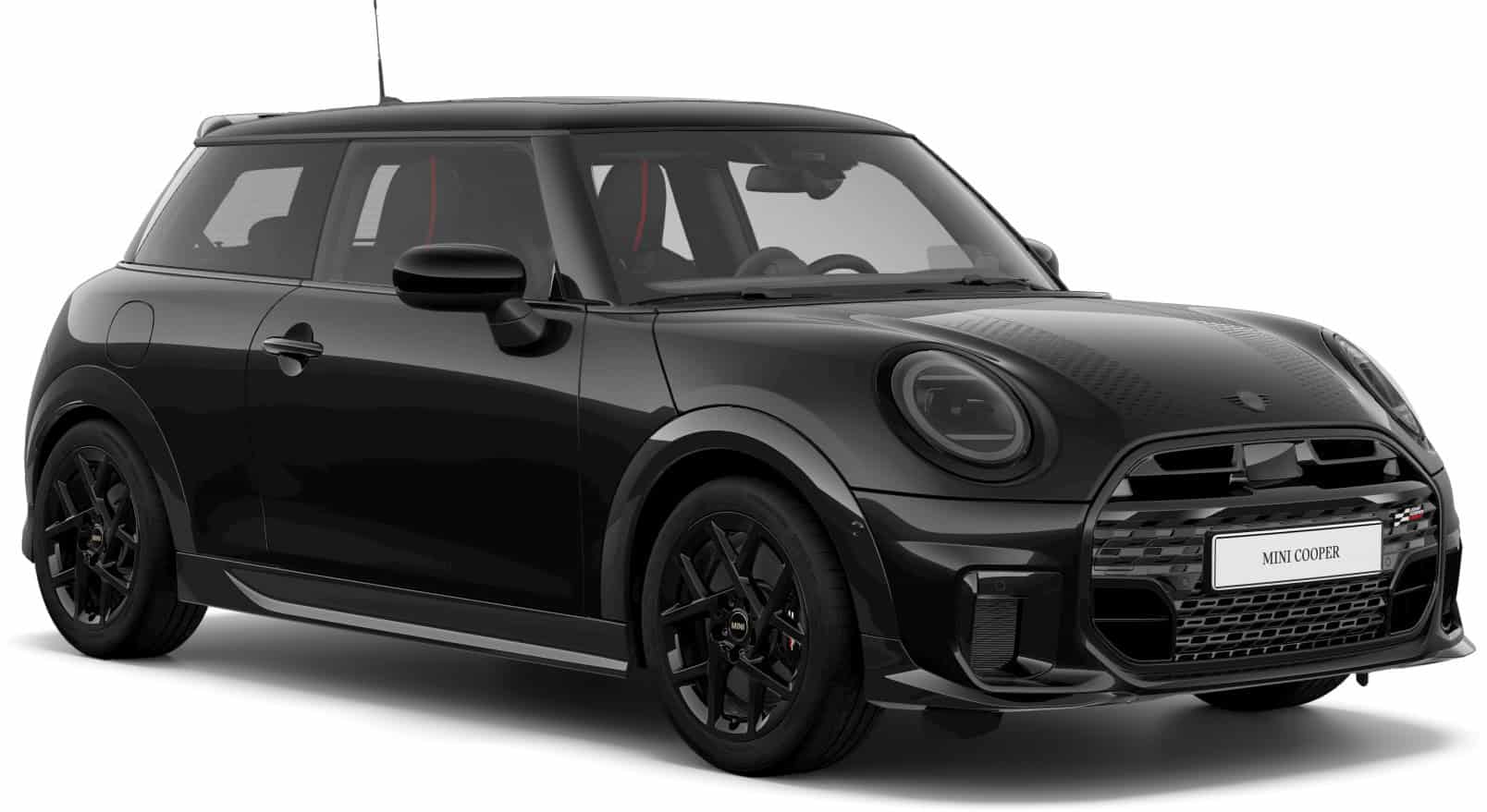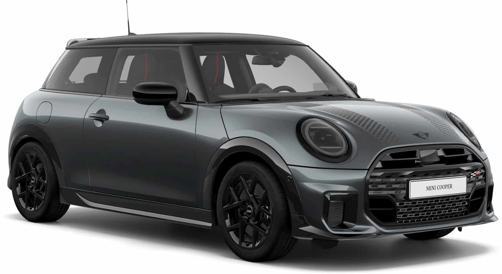 MINI intends to sell the feisty city car in either this Midnight Black paint or Legend Grey. Regardless of choice, the Cooper S with JCW Pack gets the side mirror caps and roof in black. Those 17-inch wheels also have a dark look, as does the vegan leather used inside the cabin. Despite the JCW branding, this is merely a cosmetic package since the car doesn’t have a more powerful engine.