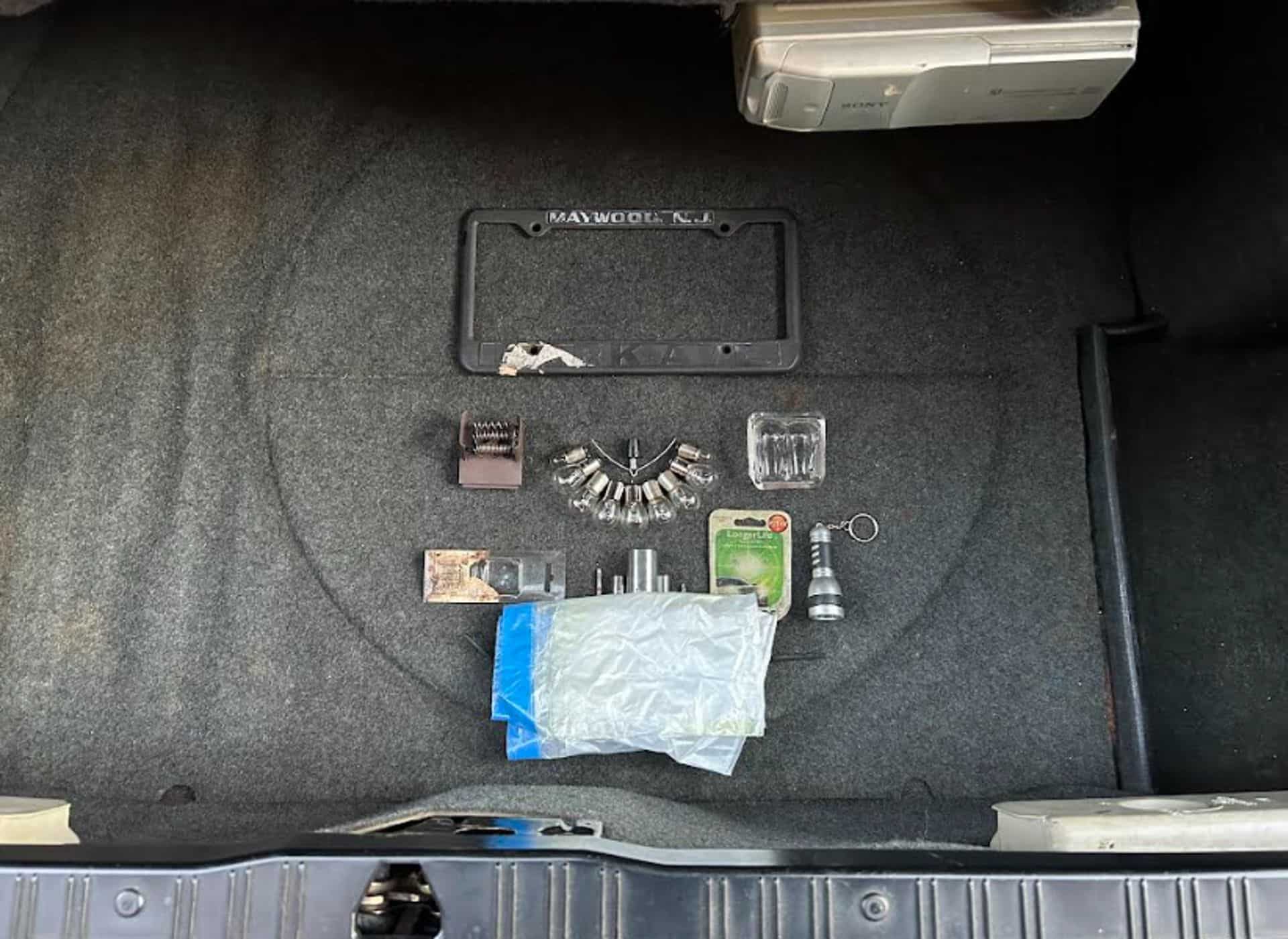 I sat on both sport seats, reconfiguring each operable adjustment, lifting/pressing each handle enabling longitudinal movement, inclination, reclination, thigh support, and the folding seatback/sliding cushion (for rear ingress/egress). In an interior-inspecting mood, I moved on to the trunk, and found the carpet floors and walls to be intact, unworn, and vitally dry. I’d planned to visit the car on this specific day, as it’d rained just heavily all throughout the entire day before, so my inspection would find any evidence of any in-car leaks. Though the port-side tire jack and wheel chock pocket, as well as the (complete!) toolkit were all slightly tinged with tangerine, indicating that moisture had seeped in somehow and somewhere, I searched rigorously and found no fresh presence of water in the cabin, boot, or areas underneath them. Lifting the trunk floor, and with gratitude, I unearthed a gleaming polished bottlecap spare wheel wearing an untouched mint-condition tire! Tucked to the right was a baggie of extra taillight bulbs, wrench sockets, and entertainingly unidentifiable pieces of random electronics. And holy smokes, am I looking at a trunk-mounted 10-track Sony CD player?! That nine-upped the cassette-tape and cleaner device I excavated from the glove compartment. The back-to-the-’80s evening just kept getting cooler.