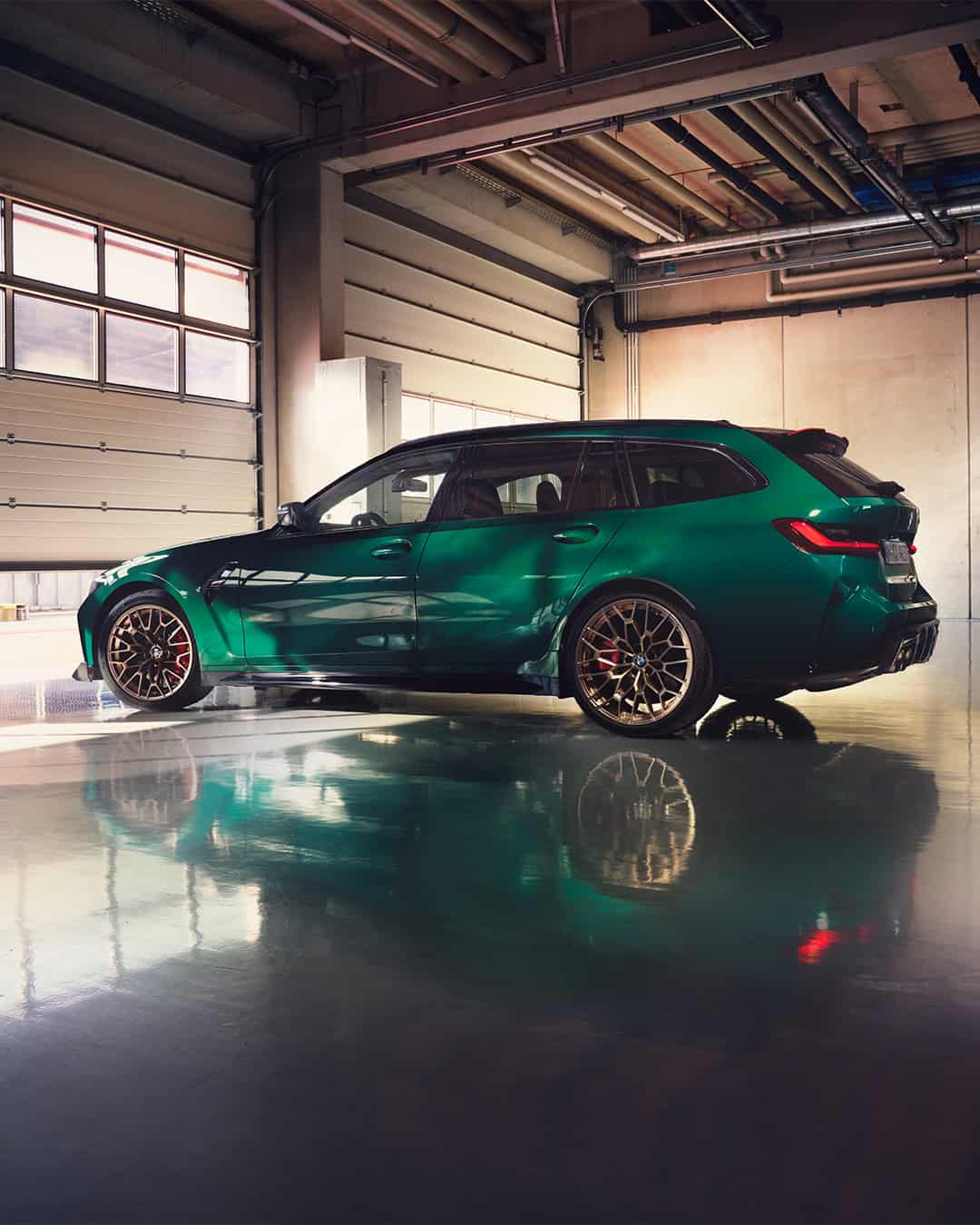 When the M3 CS Touring debuted last night, BMW showed the super wagon only in Laguna Seca Blue. However, that’s just one of four colors available for the hotter G81. Frozen Solid White and Sapphire Black are also listed, but we’d probably go for this – British Racing Green. New official images published on social media also show the car with the Gold Bronze wheels. They’re perhaps too much for our tastes, but customers willing to go all out will love them. If not, the matte black alloys will be the safe choice.