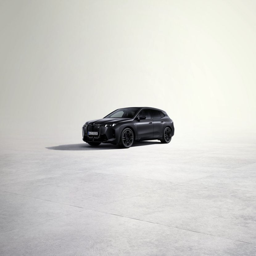 The M Performance model is illustrated here with stately 23-inch wheels—a first for the iX. It also has matte paint from the Individual catalog: Frozen Deep Grey. Combined with the darkened headlights and taillights, the M70 looks downright menacing. The lesser xDrive60 is shown in Arctic Race Blue, a new color available for the large electric SUV. Beyond these two exterior finishes, new shades include Dune Grey, Carbon Black, Tanzanite Blue, Space Silver, and Frozen Pure Grey.