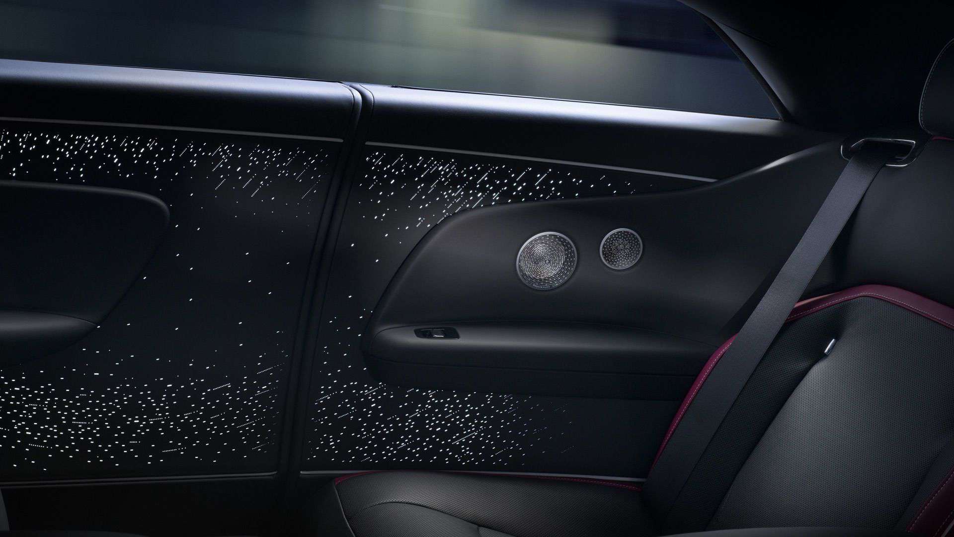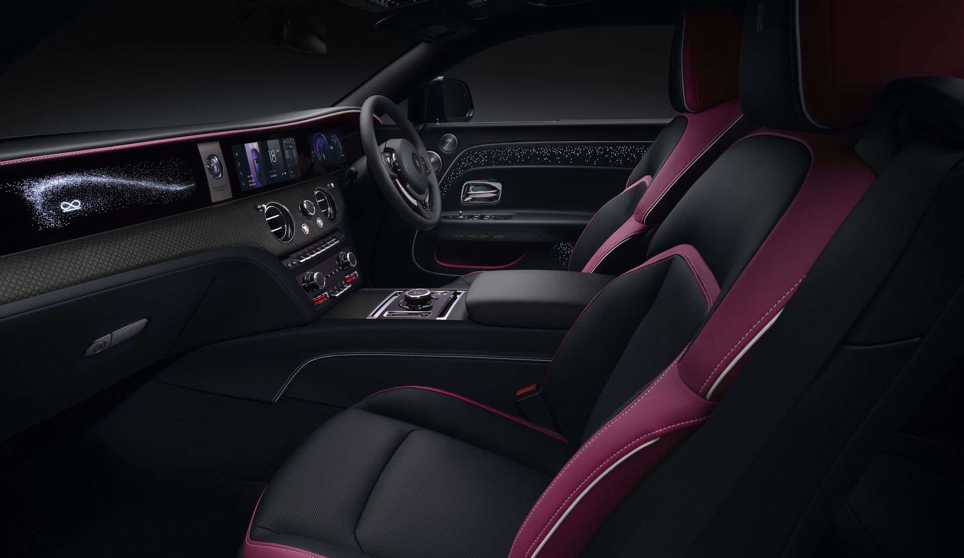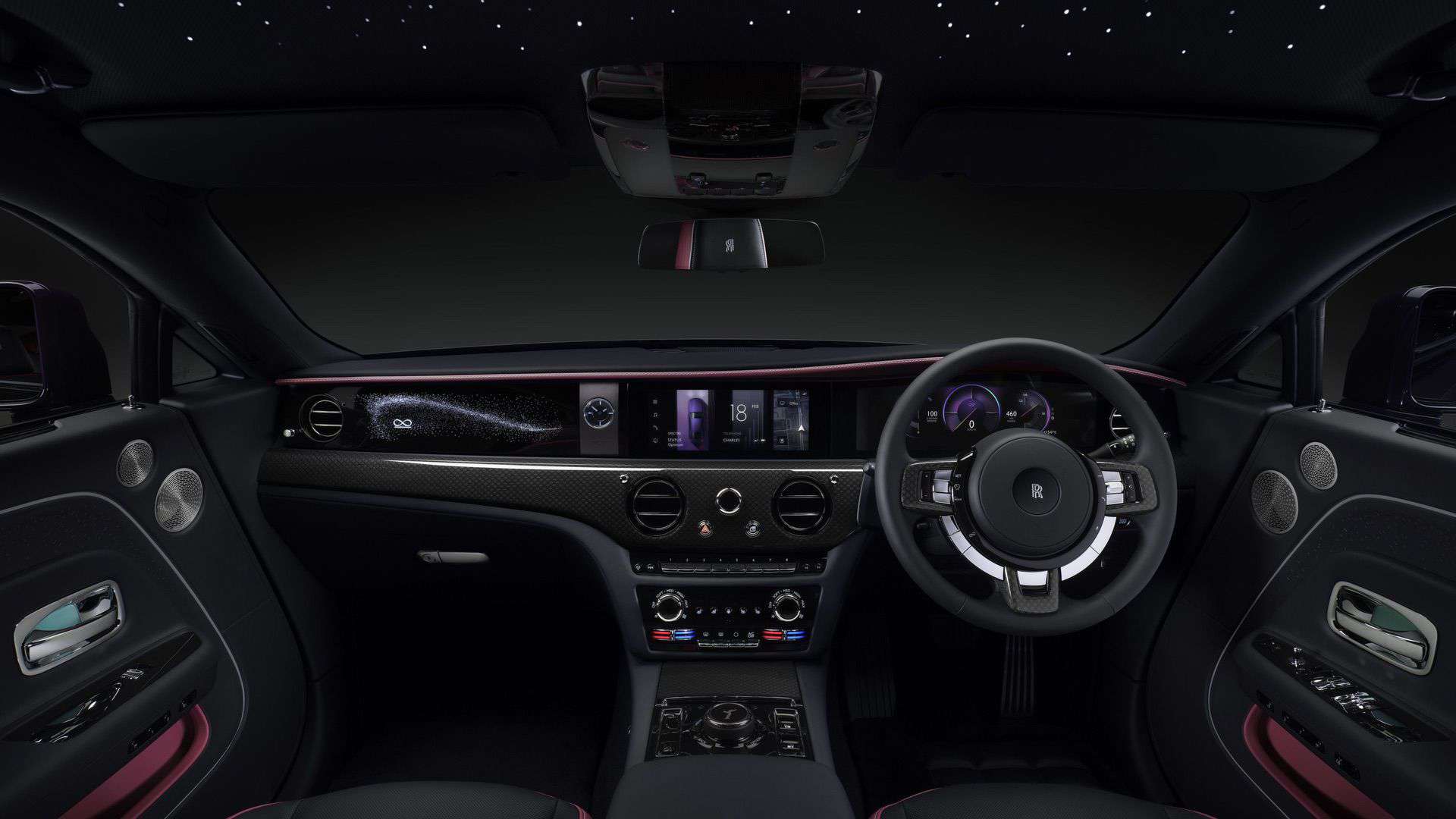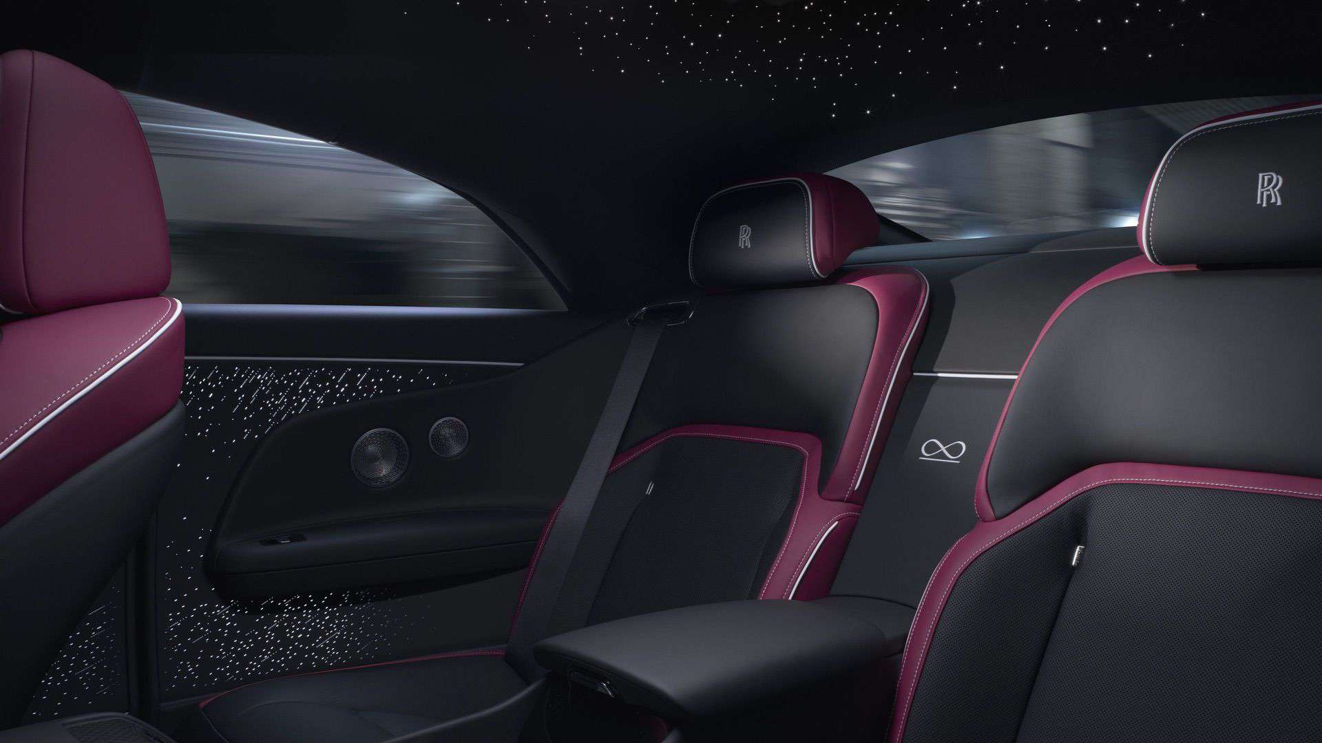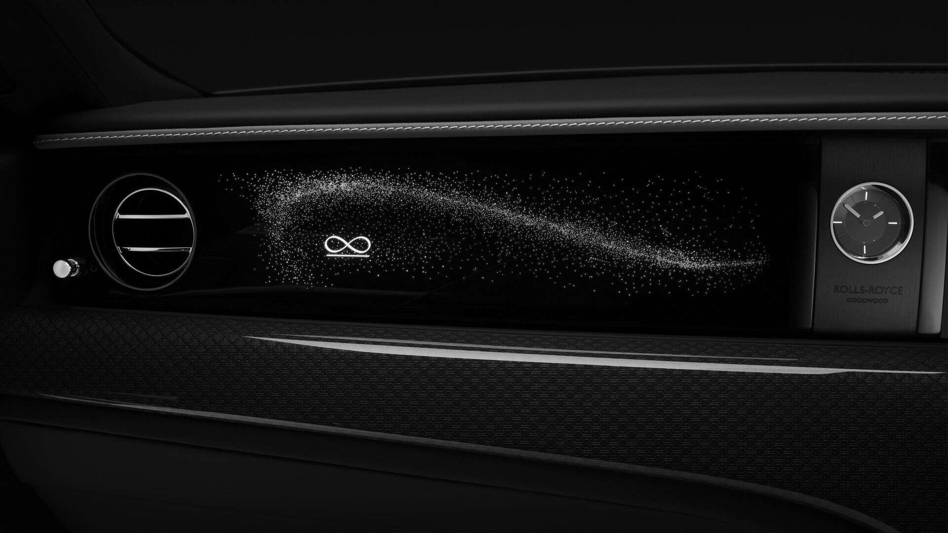 The interior is a mélange of high-quality metal, carbon fiber, and a touch of wood. As for the dashboard, known as the Illuminated Fascia in RR terminology, it adopts a glossy black look. Aside from having 5,500 stars that light up, it also boasts an illuminated infinity symbol. The motif is found elsewhere, including between the rear seats, where it’s been stitched into the leather.