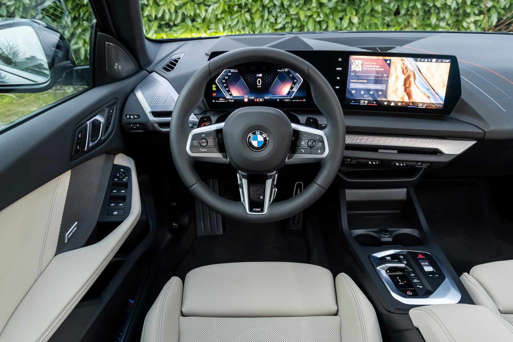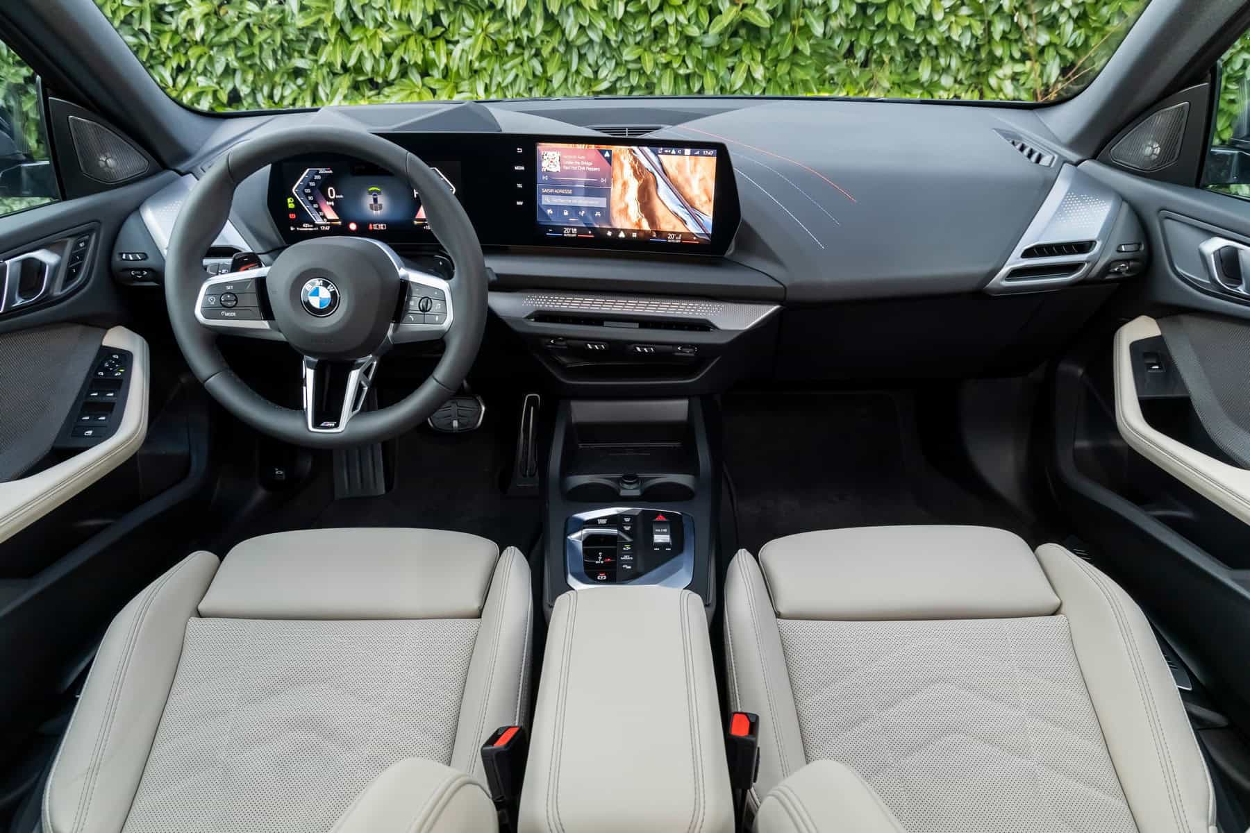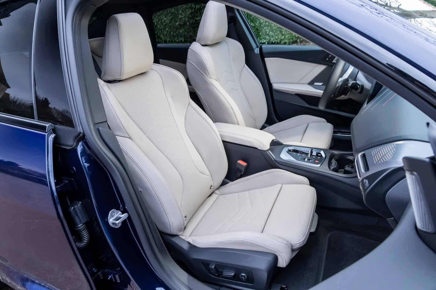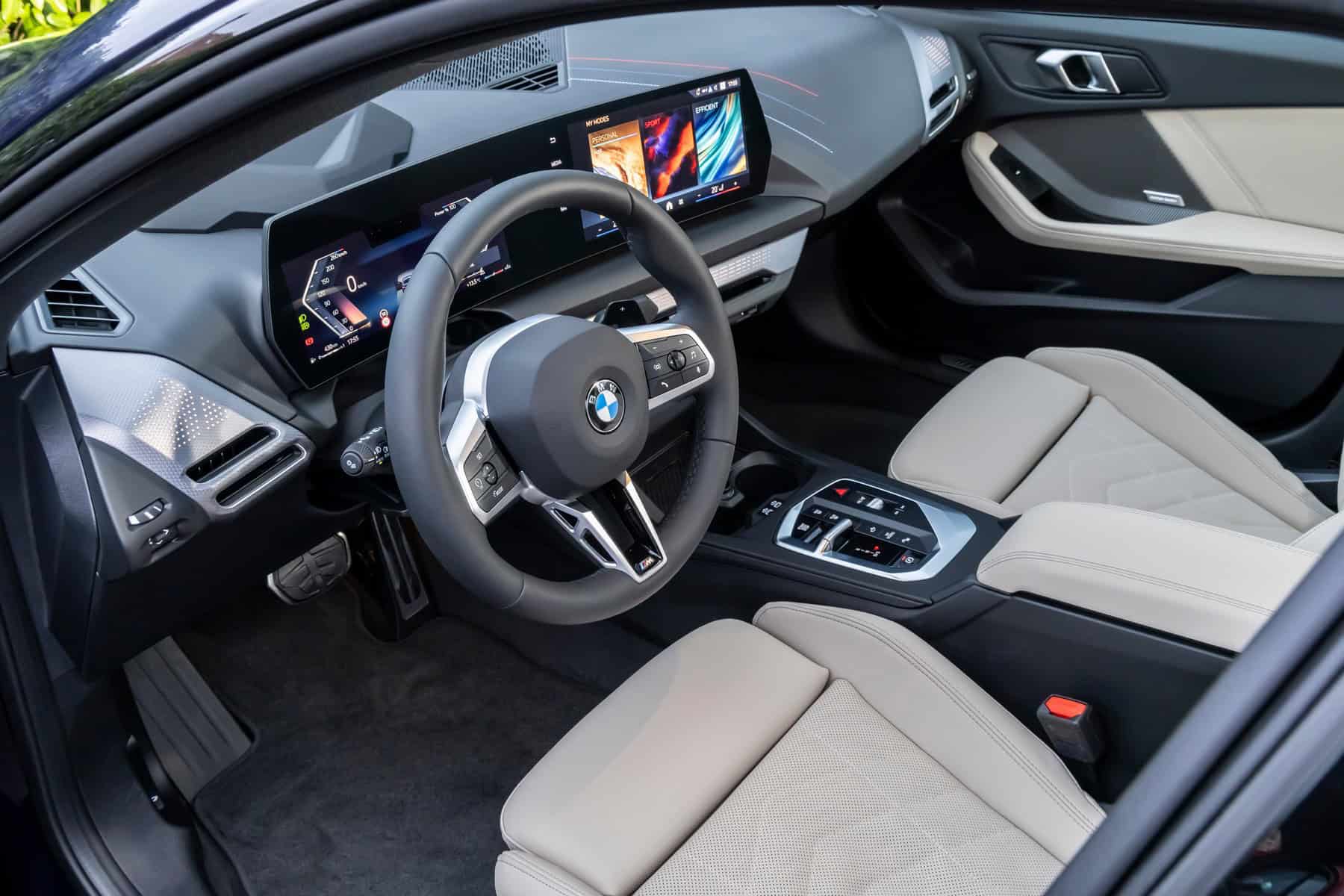 Stepping inside, one extra from the configurator becomes immediately apparent. BMW France built this four-door 2er press car with the perforated Veganza (vegan leather) in Oyster, marketing jargon for beige/cream. Beyond the seat upholstery and the center console, the door cards are also partially beige. The lighter theme is a breath of fresh air compared to most official images showing the compact Gran Coupe with predominantly dark interiors.