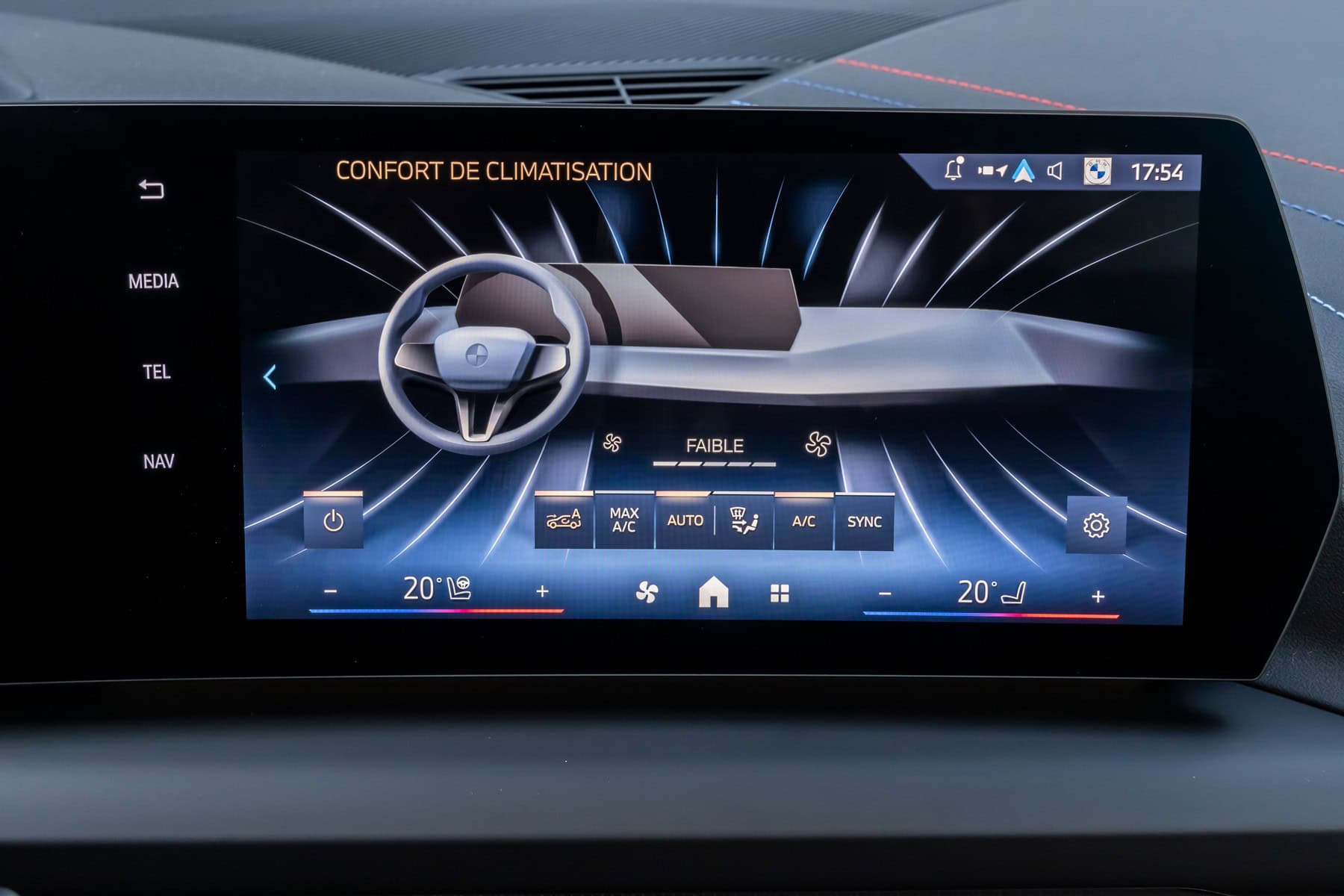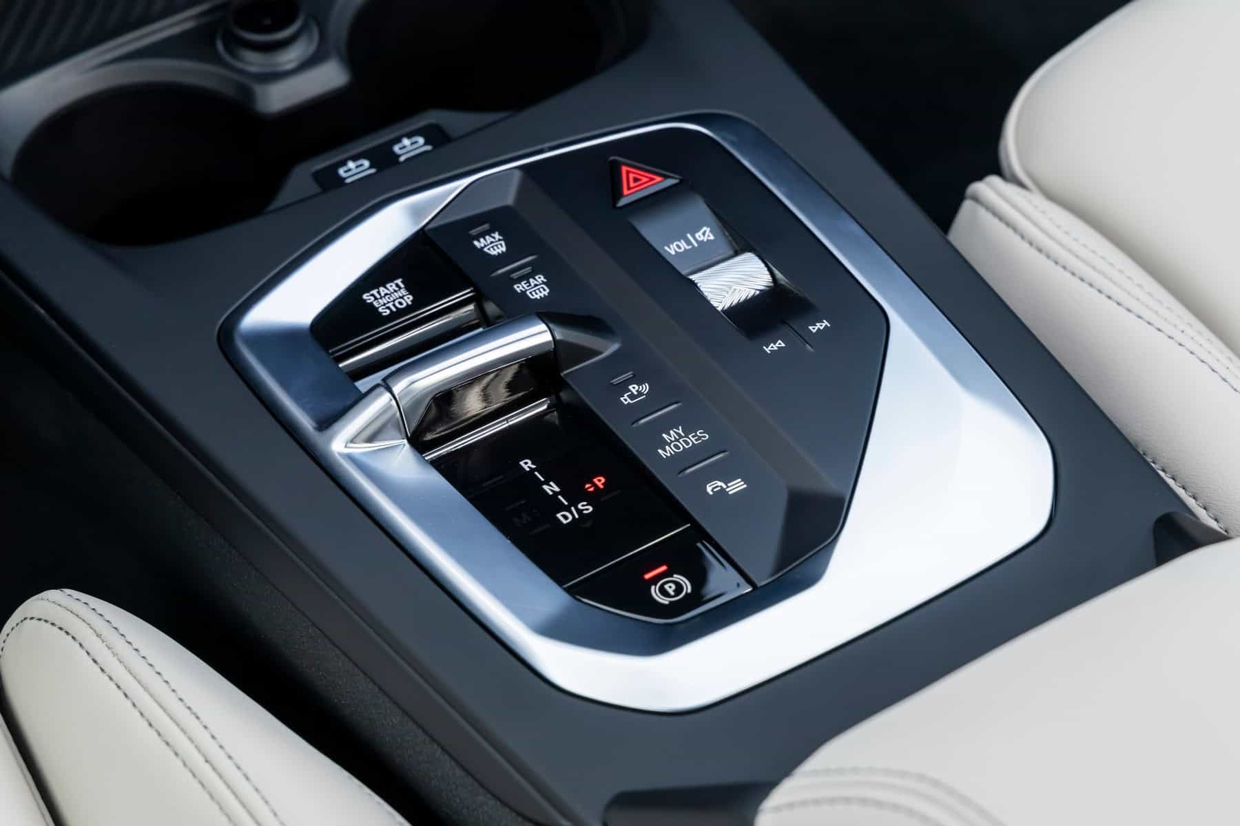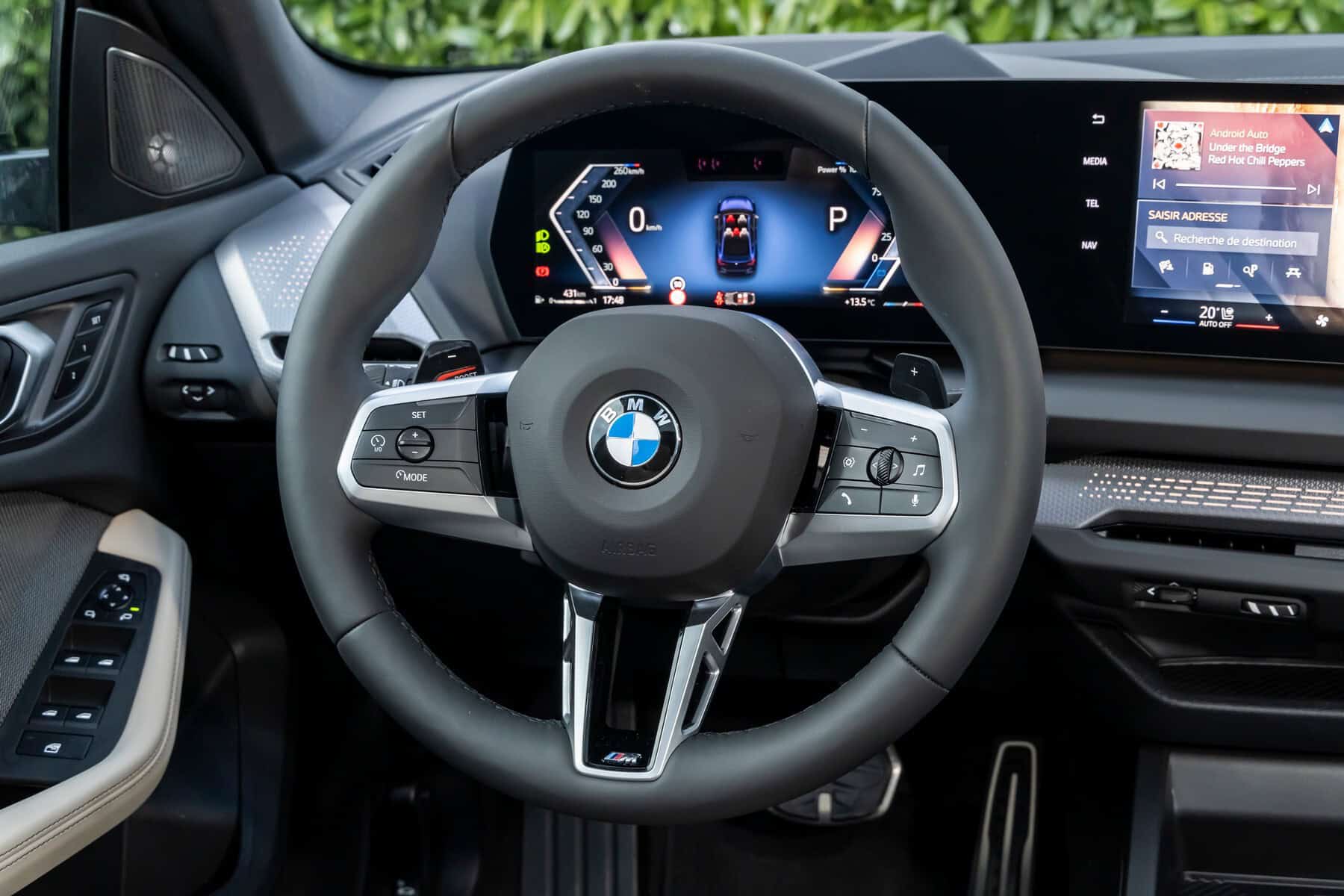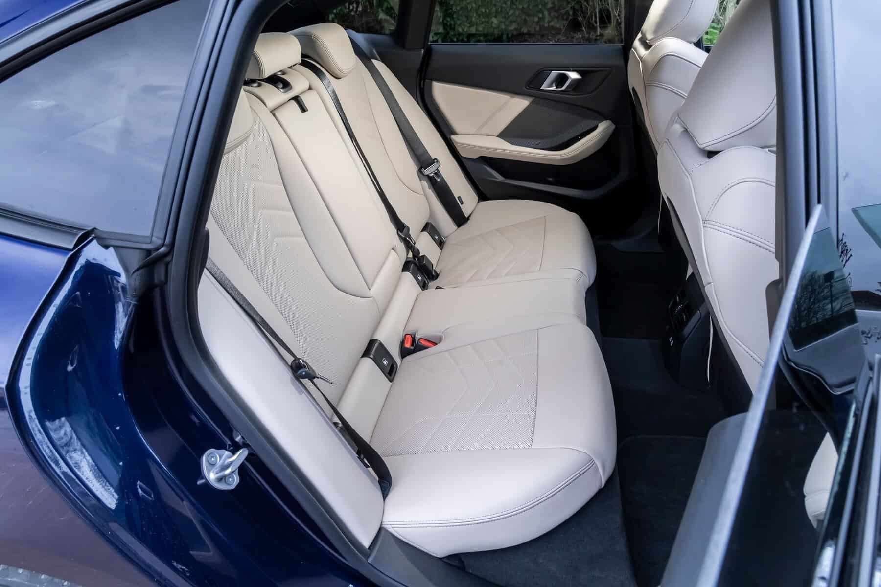 Stepping inside, one extra from the configurator becomes immediately apparent. BMW France built this four-door 2er press car with the perforated Veganza (vegan leather) in Oyster, marketing jargon for beige/cream. Beyond the seat upholstery and the center console, the door cards are also partially beige. The lighter theme is a breath of fresh air compared to most official images showing the compact Gran Coupe with predominantly dark interiors.