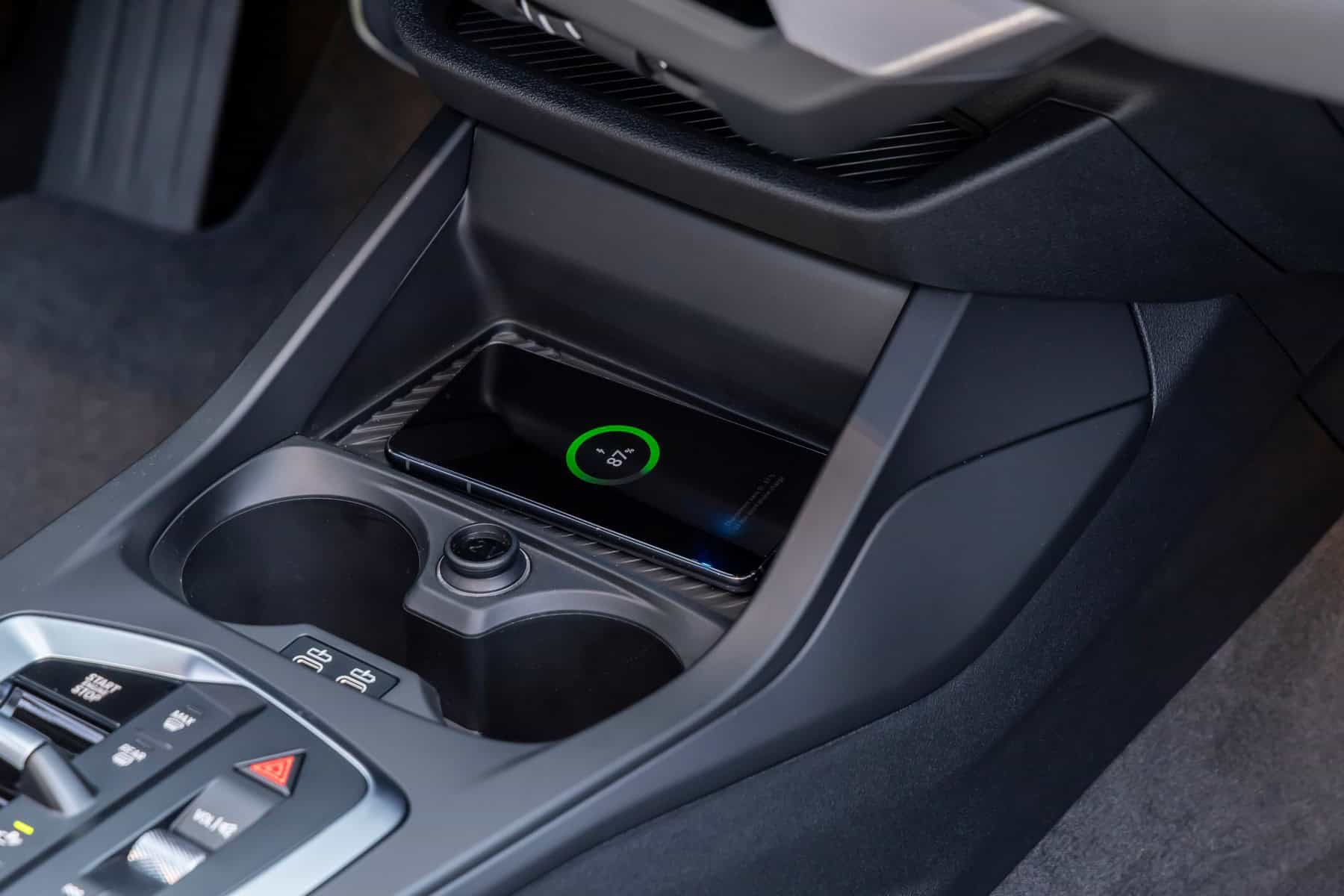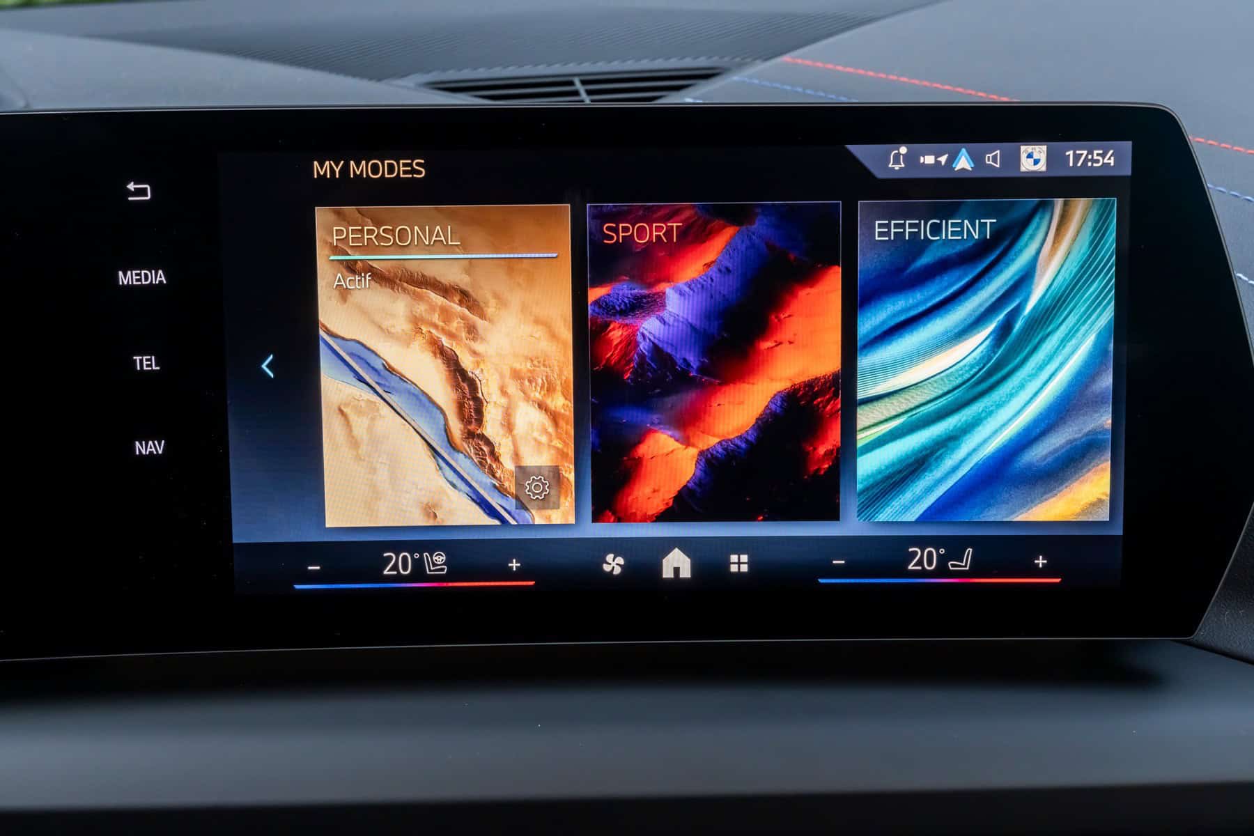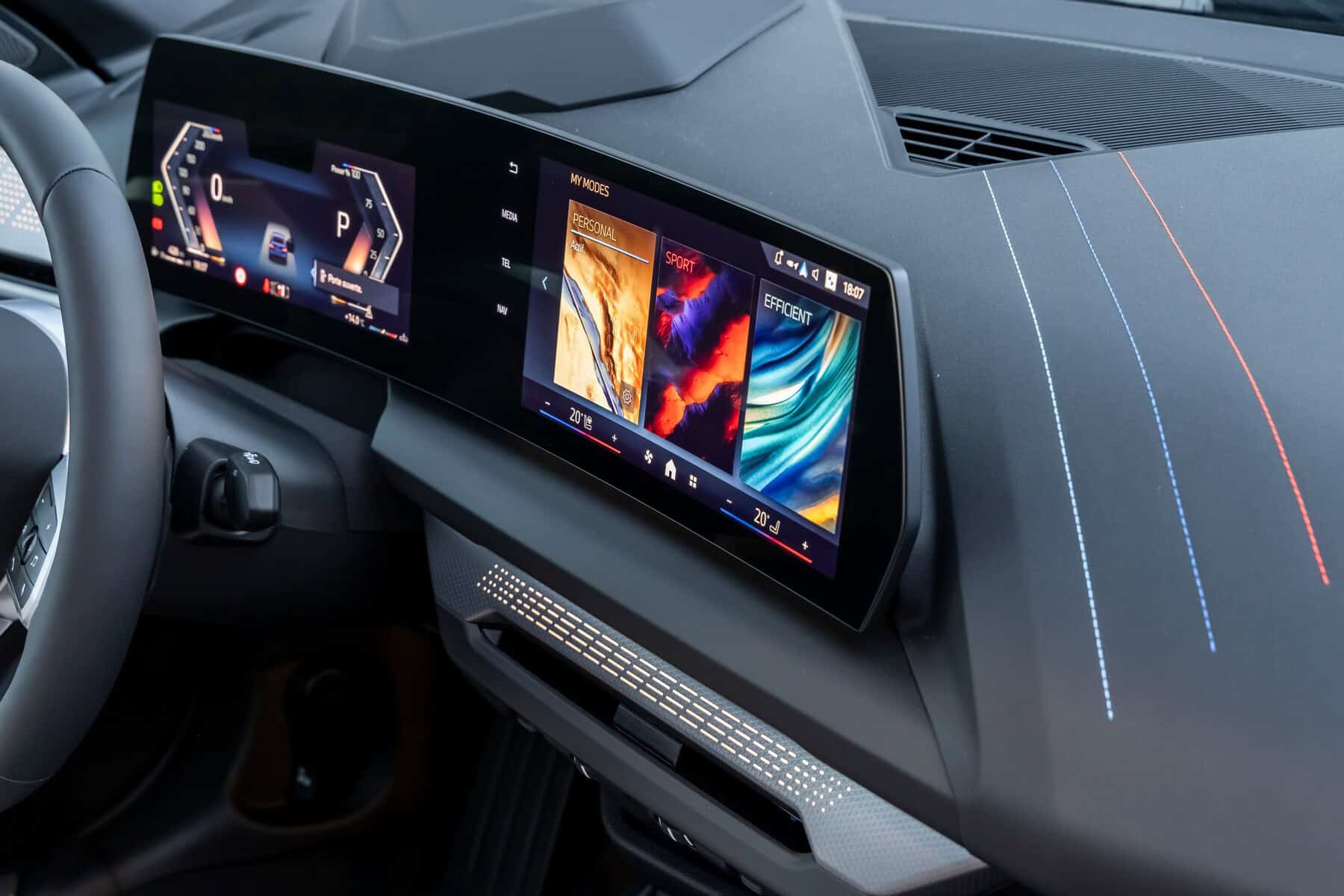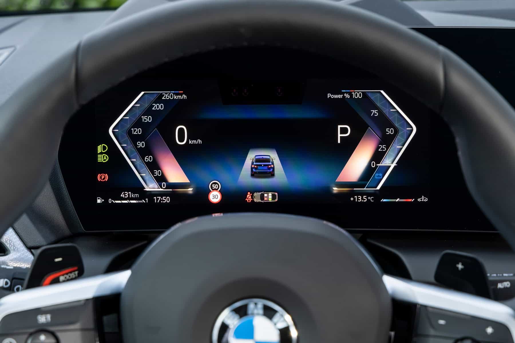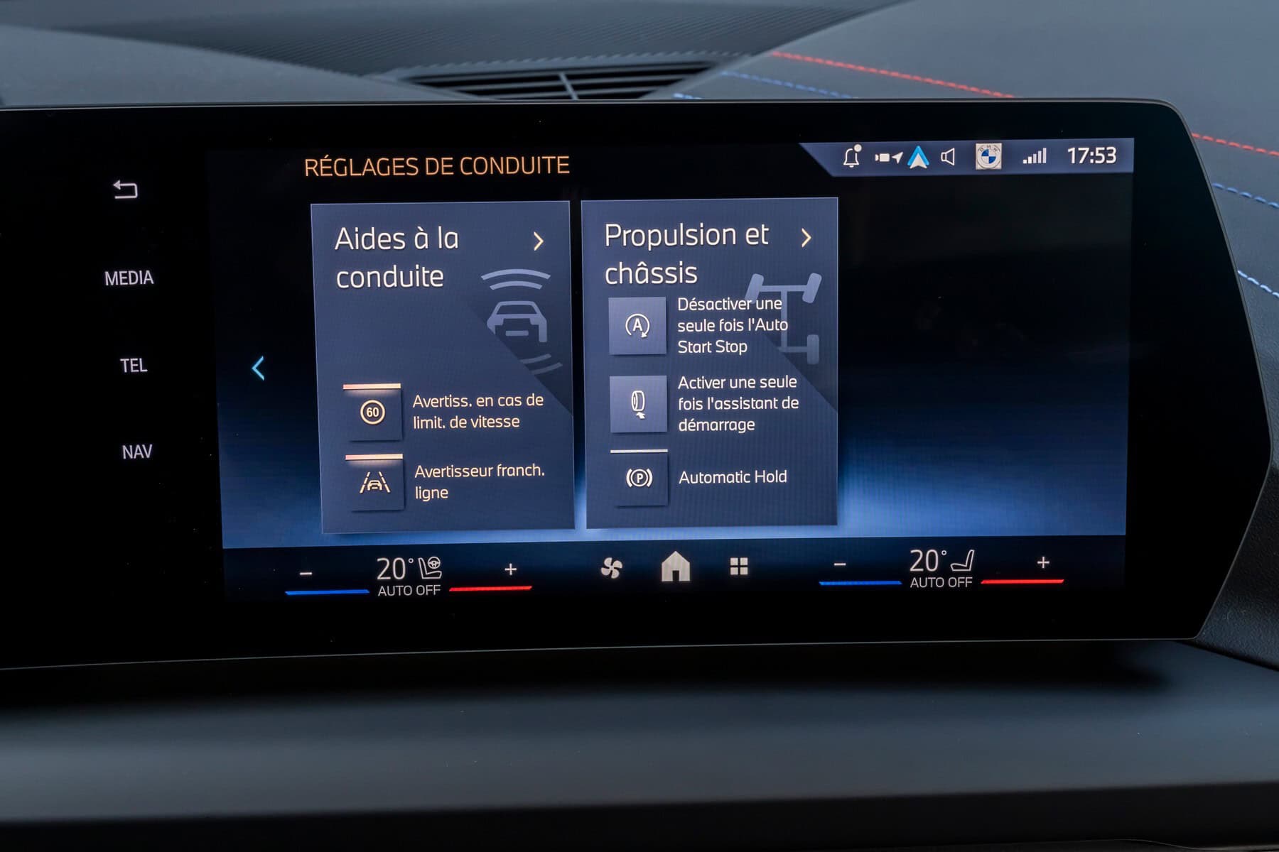 Stepping inside, one extra from the configurator becomes immediately apparent. BMW France built this four-door 2er press car with the perforated Veganza (vegan leather) in Oyster, marketing jargon for beige/cream. Beyond the seat upholstery and the center console, the door cards are also partially beige. The lighter theme is a breath of fresh air compared to most official images showing the compact Gran Coupe with predominantly dark interiors.