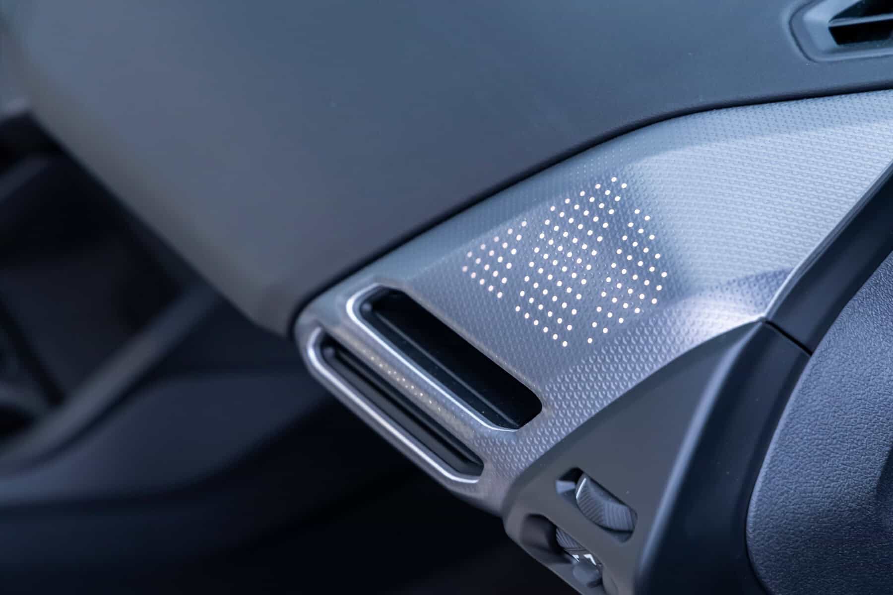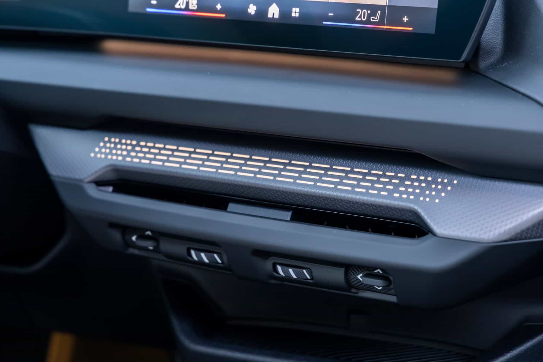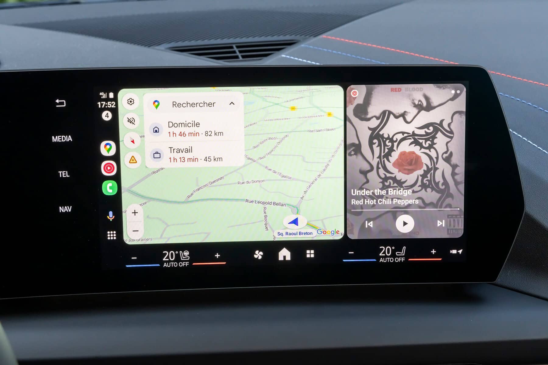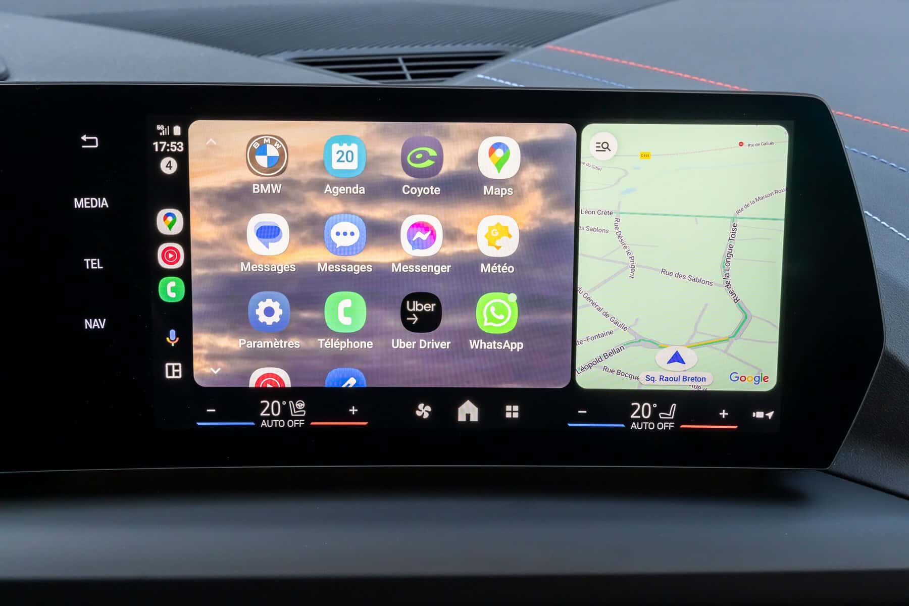 Stepping inside, one extra from the configurator becomes immediately apparent. BMW France built this four-door 2er press car with the perforated Veganza (vegan leather) in Oyster, marketing jargon for beige/cream. Beyond the seat upholstery and the center console, the door cards are also partially beige. The lighter theme is a breath of fresh air compared to most official images showing the compact Gran Coupe with predominantly dark interiors.
