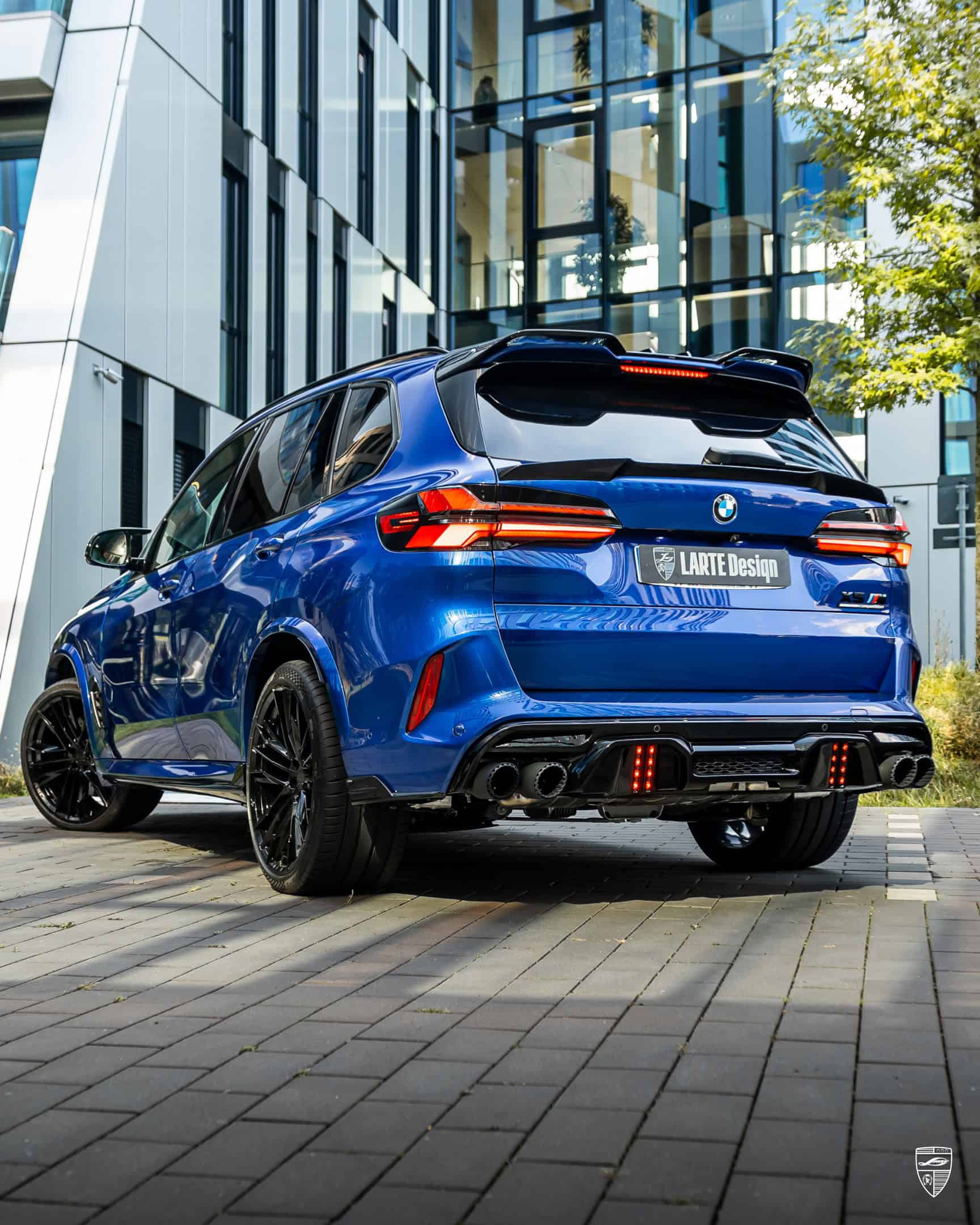The bold look continues with the profile, where Larte Design widened the fenders and installed different carbon mirror caps. Massive 22-inch forged wheels with a black finish add to the X5 M Competition’s meaner stance. We’re also noticing the chunkier side skirts, emphasizing the SUV’s angrier attitude.