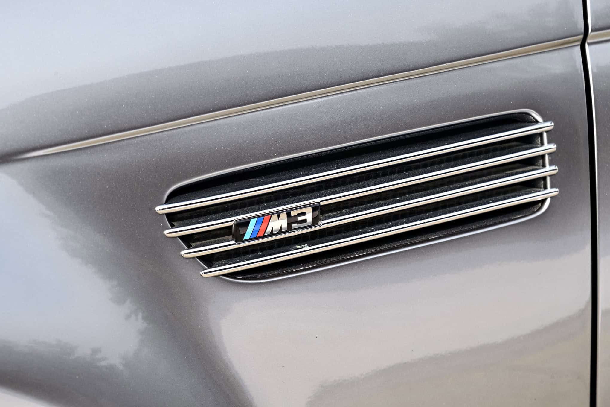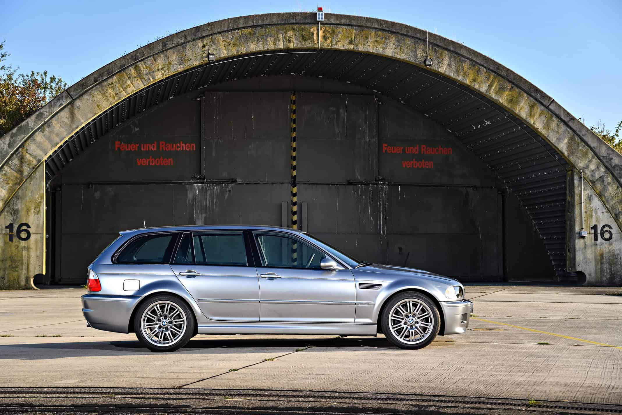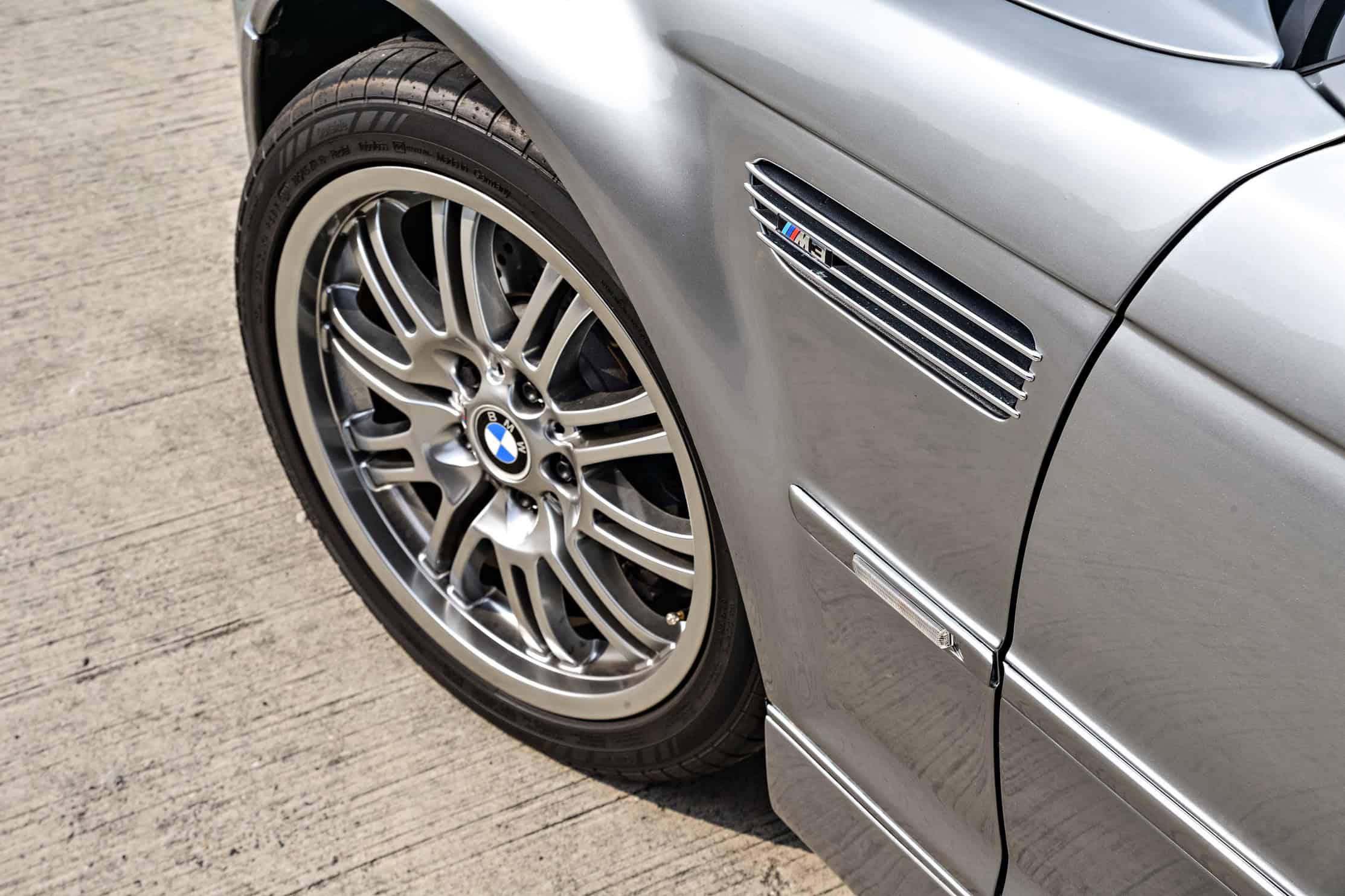 Like the regular M3 E46, the hot wagon inherited the wider wheel arches and bulging ventilated hood. Bigger air intakes and a quad exhaust were also added, along with 19-inch M Styling 67 wheels. BMW chose to paint the car in Chrome Shadow metallic, using glossy black first and then spraying the Touring in bright silver.
