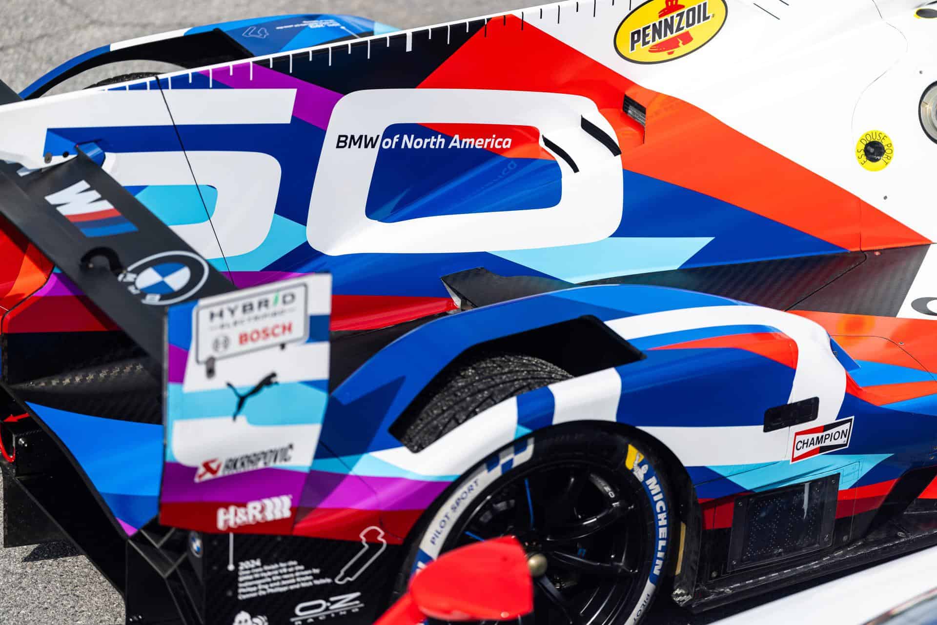 The No. 25 BMW M Hybrid V8, fielded by BMW M Team RLL, will take to the track adorned with a striking commemorative livery. A bold “50” is prominently displayed on the car, while the front end features the outline of the Sebring circuit in the iconic BMW Motorsport colors. Scattered across the livery are references to BMW’s greatest North American racing triumphs,