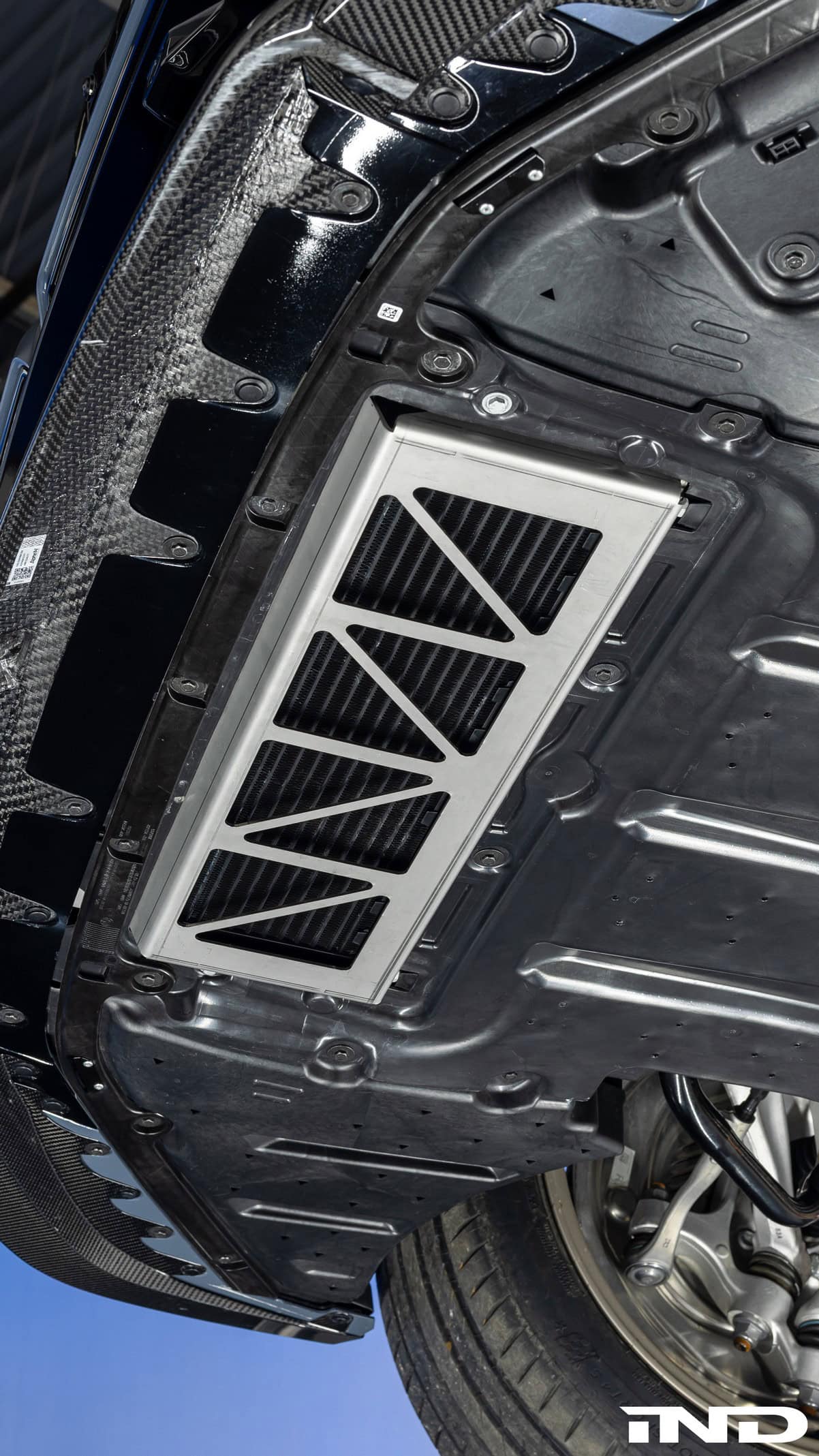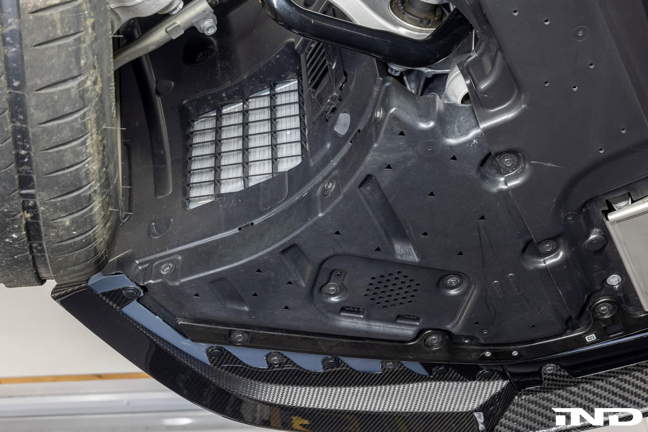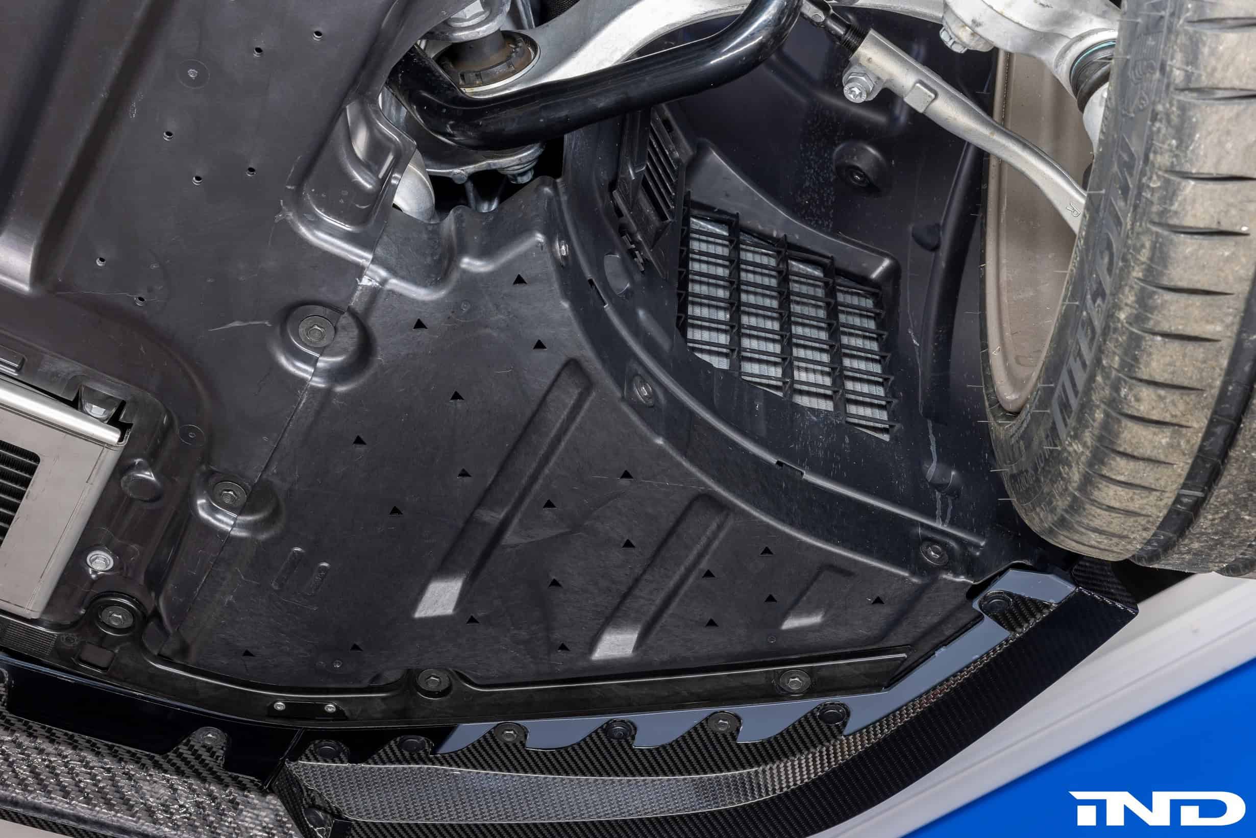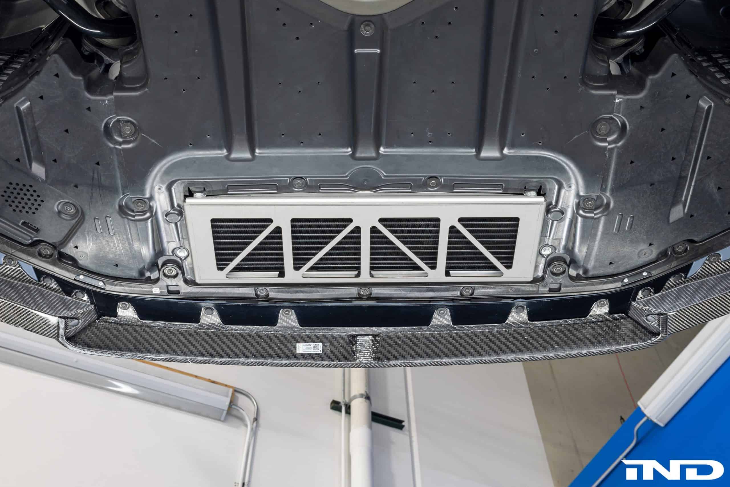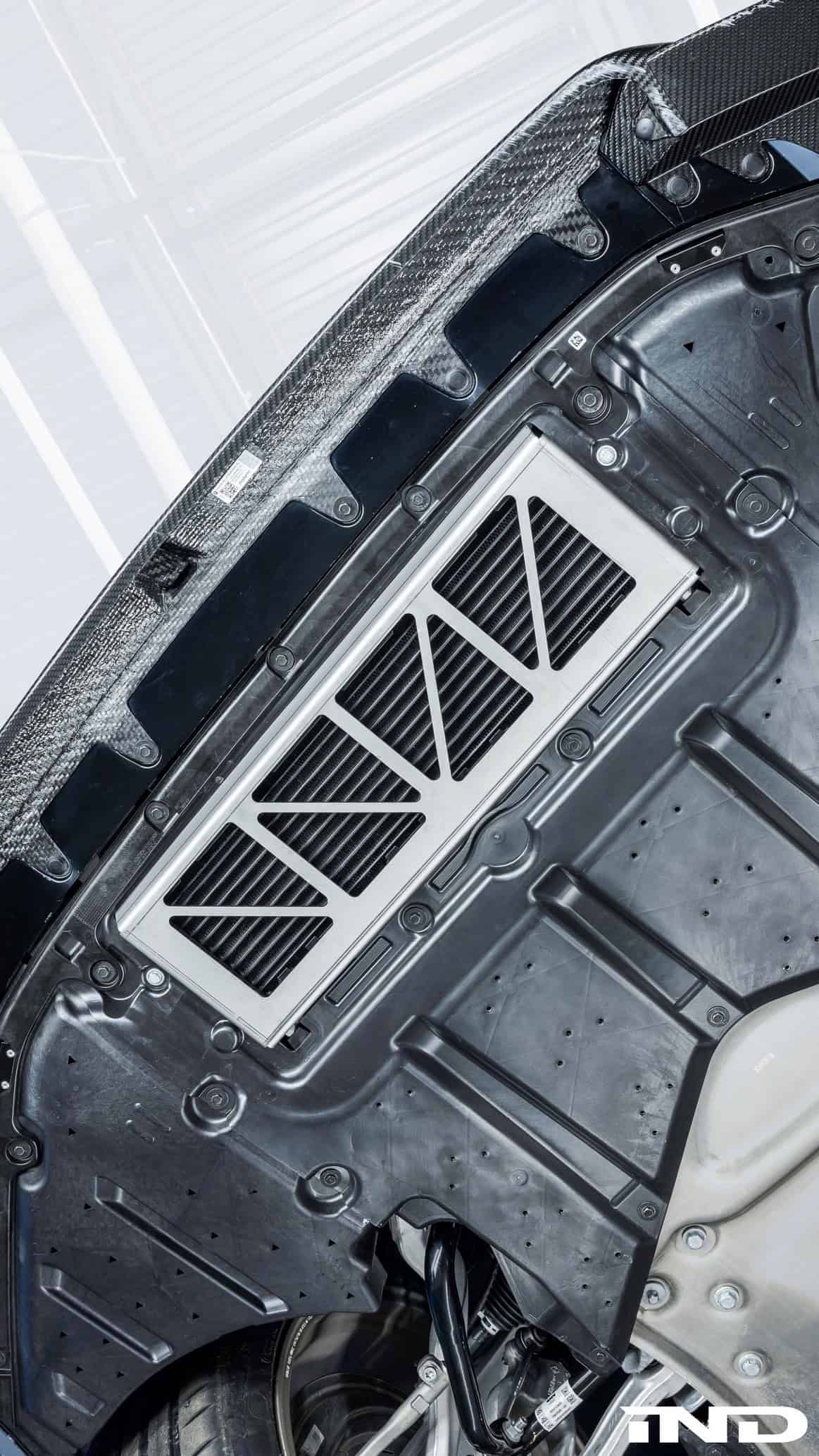 Sitting closer to the road on AST lowering springs, the M5 has lost the original wheels in favor of an HRE set. The custom 21-inch alloys (520M) feature a White Gold finish to contrast the body. Speaking of which, the OEM hood has made way for a vented carbon bonnet from Alpha-N Performance. It’s similar to the tuner’s hood for the M3 and M4, but the air outlets are positioned differently so that the V8 engine can breathe better. IND says the cutouts also help with aerodynamics. Price? $4,495.