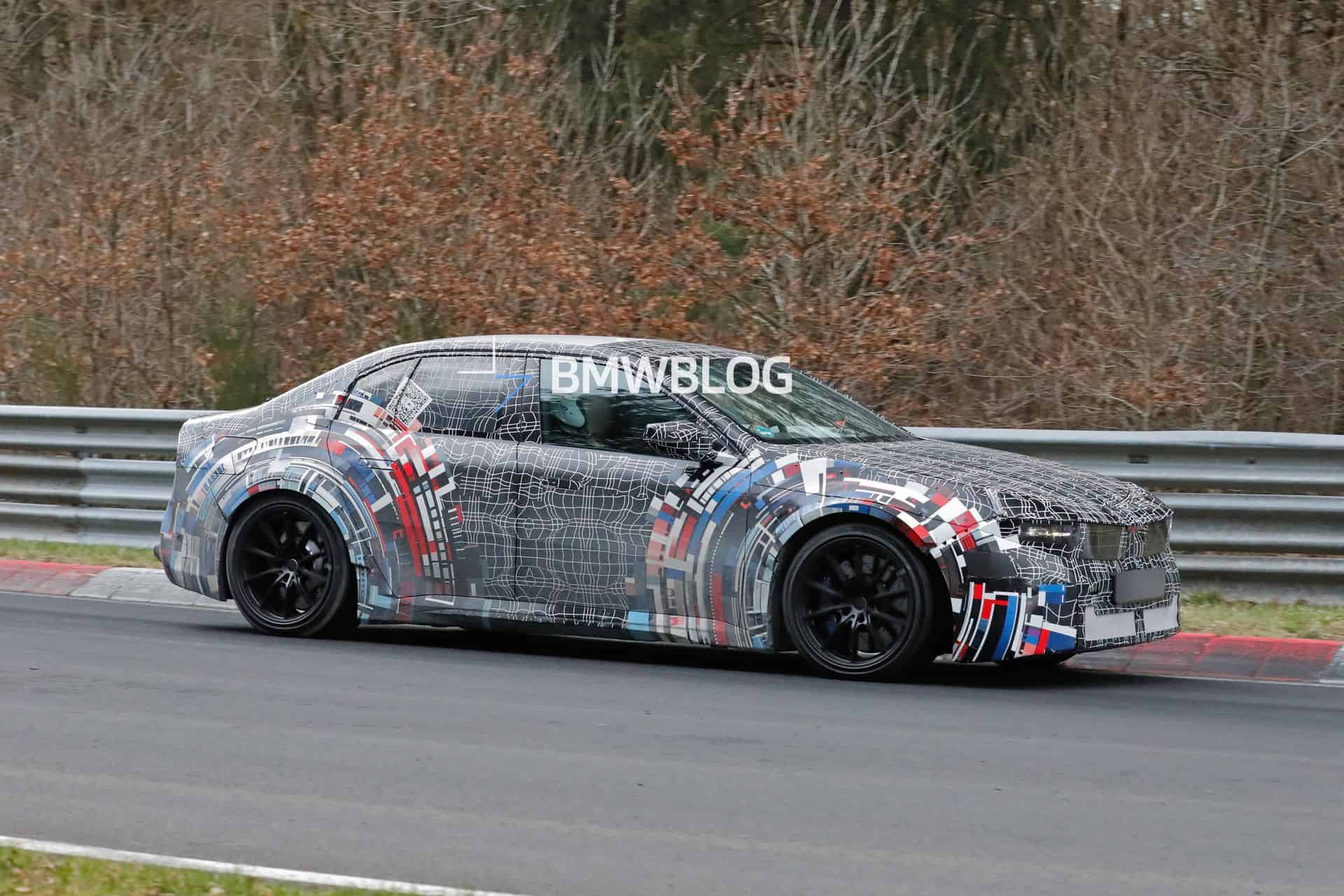 You know the times are changing when “M3” and “electric” are in the same headline. After the paparazzi caught the hot EV sedan in snowy Scandinavia, “ZA0” testing has now moved to Germany. A prototype of the first M3 without a combustion engine has been spotted working out at the ‘Ring gym. It combines the typical BMW black and white swirly camouflage with a colorful M motif around the bulging wheel arches. The M theme also adorns the corners of both bumpers.