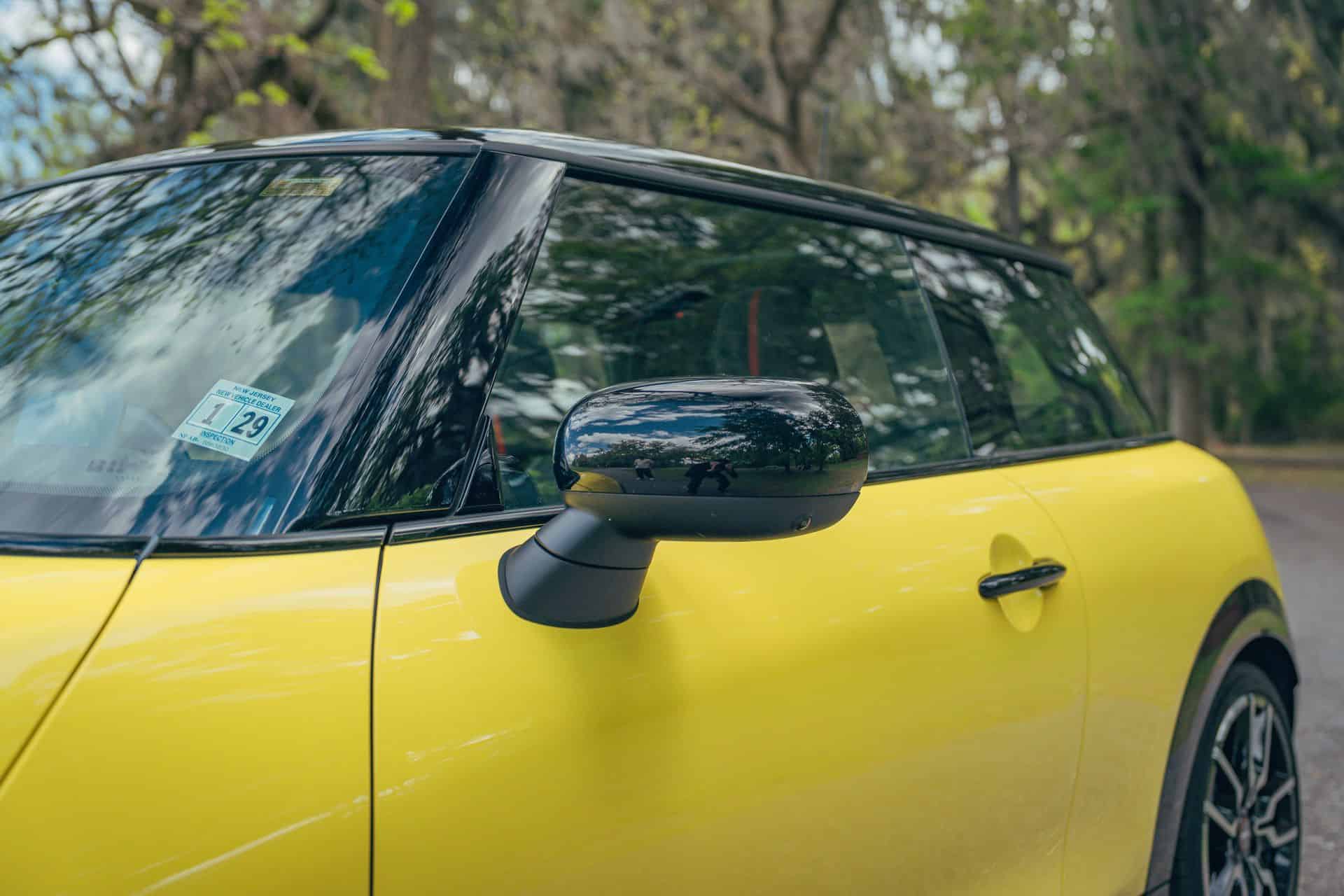 Visually, the new 2025 MINI Cooper JCW has changed but not abandoned its signature flair. The front end features gloss black trim flowing into the wheel arches, blacked out mirror caps, and a matching black roof creating a nice contrast against the Sunny Side Yellow I was driving. The “suit stripes” are still present on the hood, while the new blacked out MINI logos adorned the car front and rear.