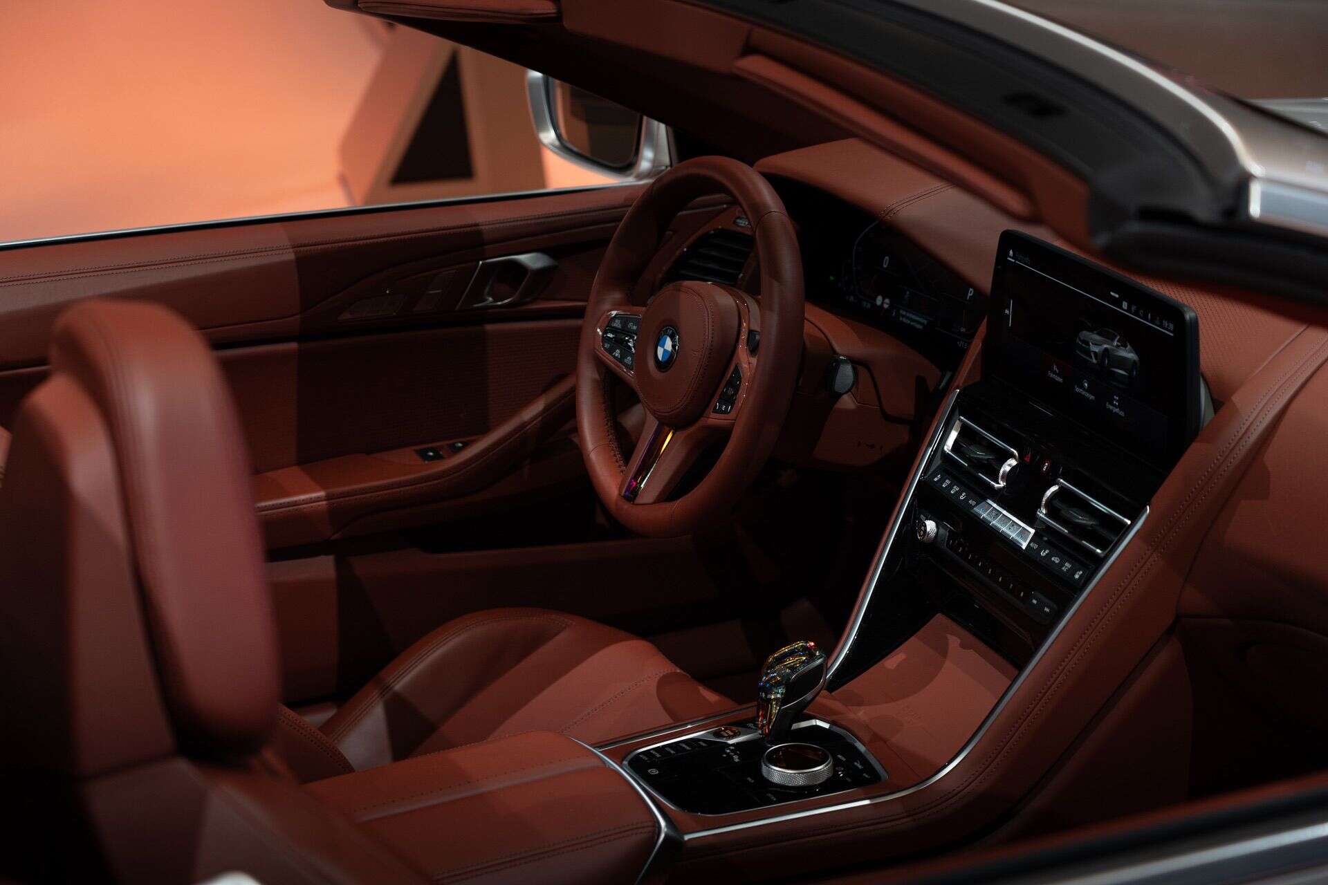 Unlike the M8 Convertible with its rear seats, the Skytop can only accommodate a front passenger. The rest of the cabin is carried over from the donor car, but with reddish-brown leather to match the targa top. To spruce things up, BMW adds crystal accents here and there, though nothing extravagant.