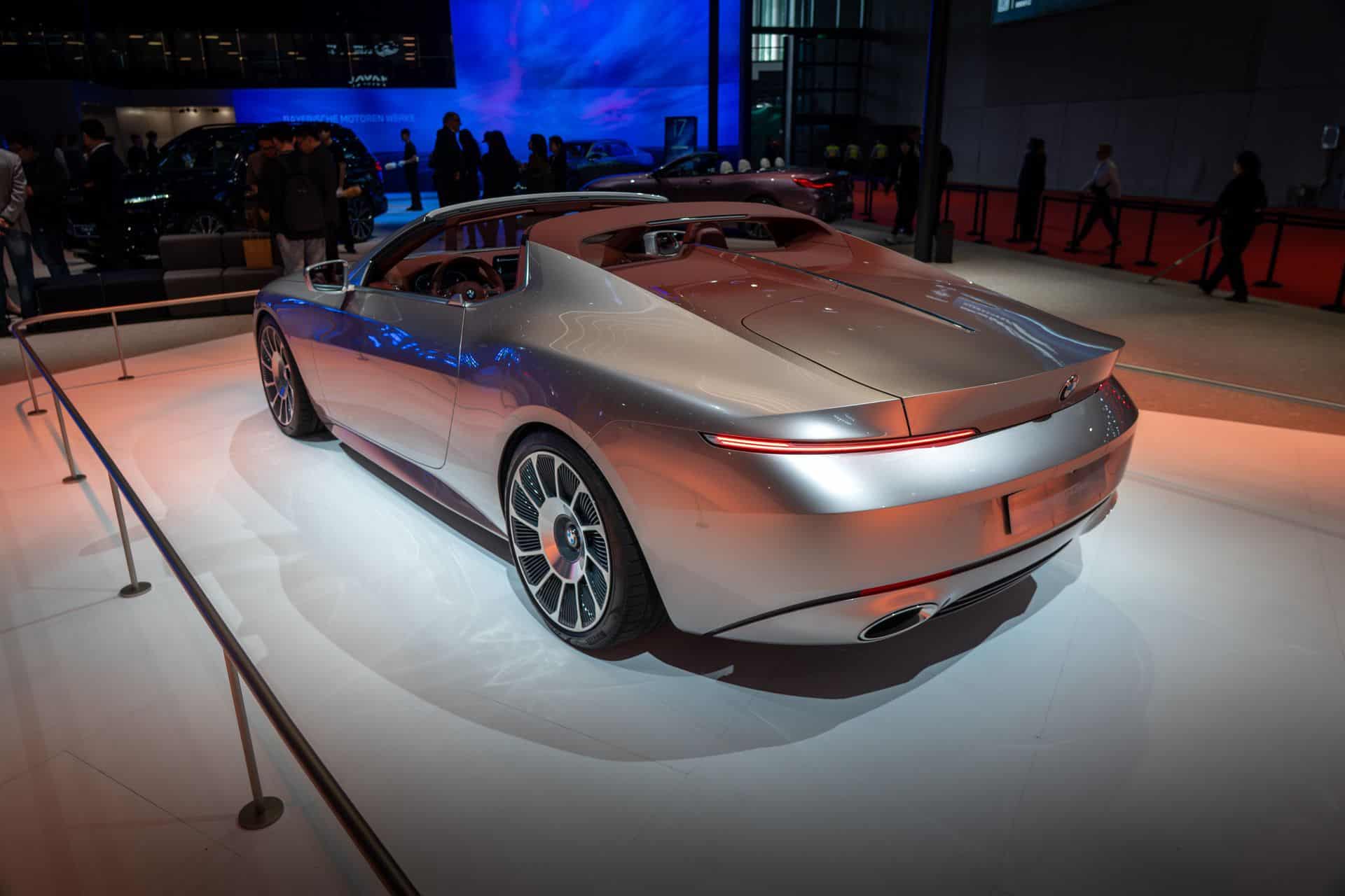 BMW is showcasing the Skytop without the targa top, which features two manually removable panels wrapped in leather. When the reddish-brown roof is removed, the parts are stored in a dedicated area of the cargo compartment. Beyond the special body reminiscent of the Z8 and 507, the car features the thinnest headlights of any model the Bavarian marque makes today. It also features a unique set of wheels styled to resemble turbines.