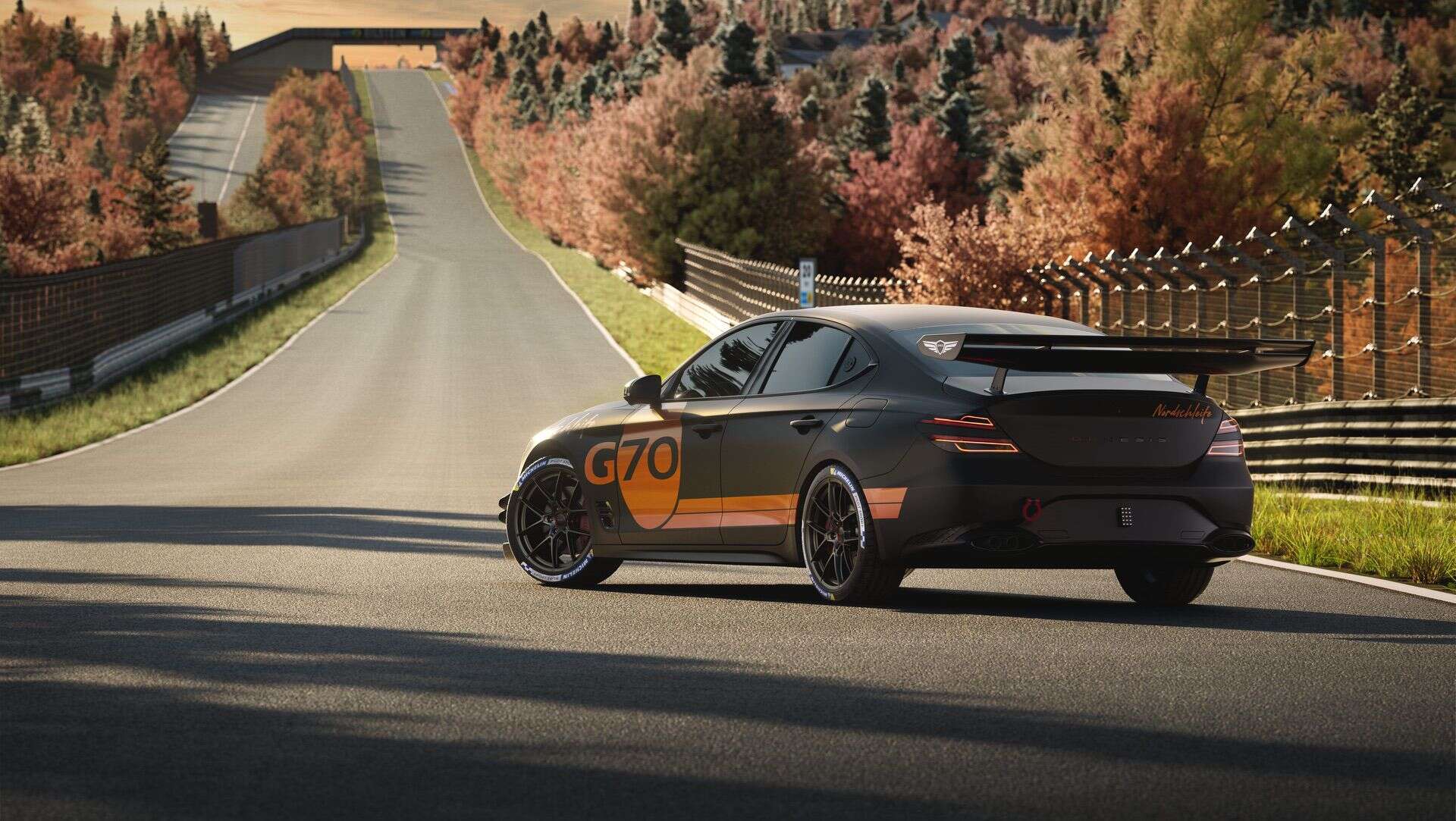 The car wears a motorsport-style livery, complete with a bold G70 roundel on the doors, Genesis script across the windshield and rear wing, and “Nordschleife” stamped proudly on the fenders. A subtle Nürburgring track map just behind the front wheels seals the deal.