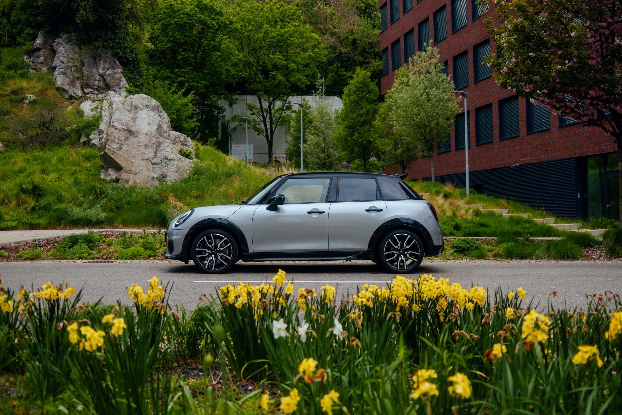 MINI highlights the sporty city car in Melting Silver with a black roof. Alternatively, you can opt for a roof painted the same color as the body. However, the racing stripes on the hood are only available if you choose the contrasting roof. While black 17-inch wheels come standard, the car shown here wears optional 18-inch alloys with a two-tone finish.