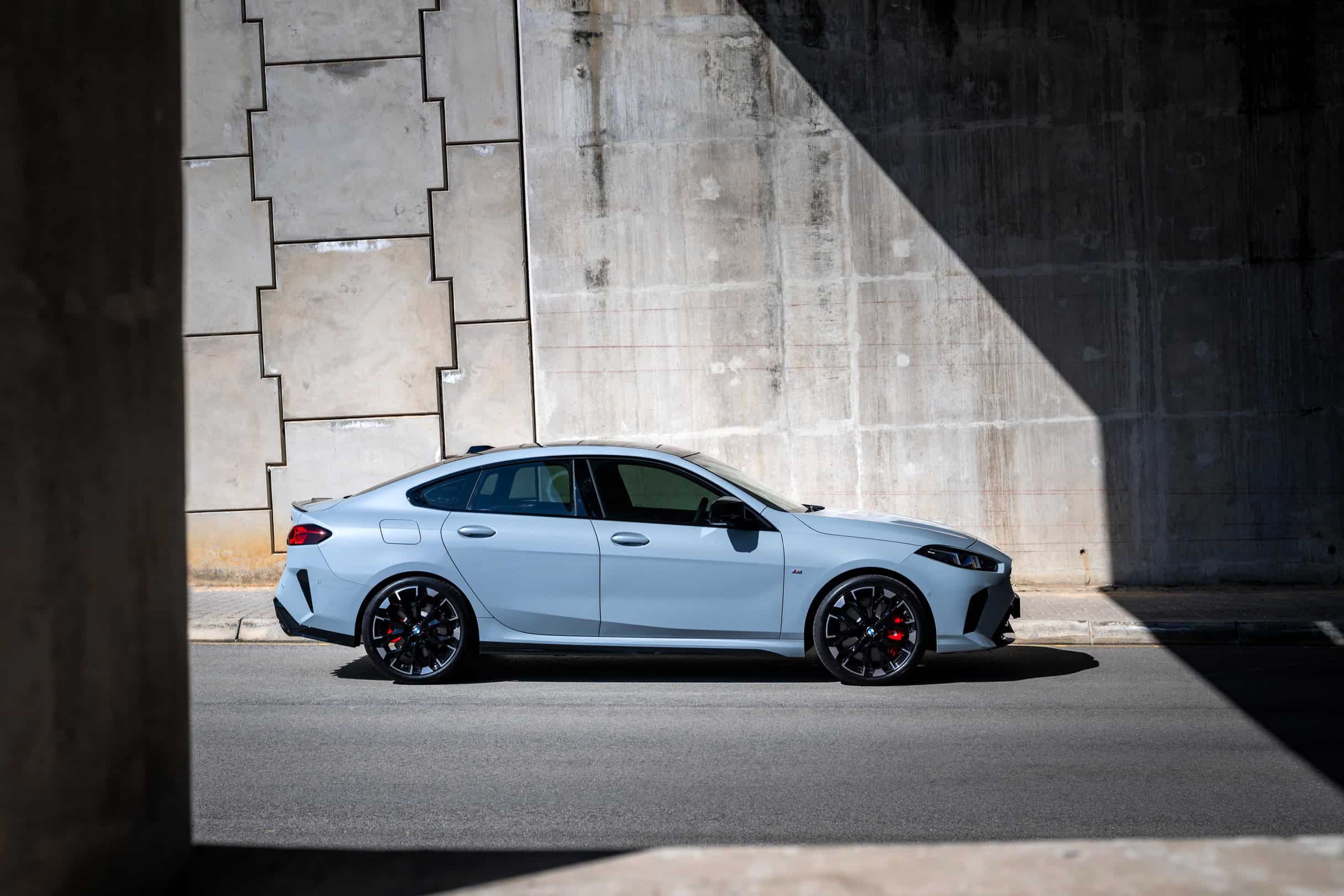 This isn’t the most expensive M235 Gran Coupe money can buy, as the car shown lacks M Compound brakes. The upgraded setup is also available on other mechanically related models like the M135, X1 M35i, and X2 M35i. All of them share large 385-mm drilled front discs and 330-mm rear discs, paired with gray calipers.
