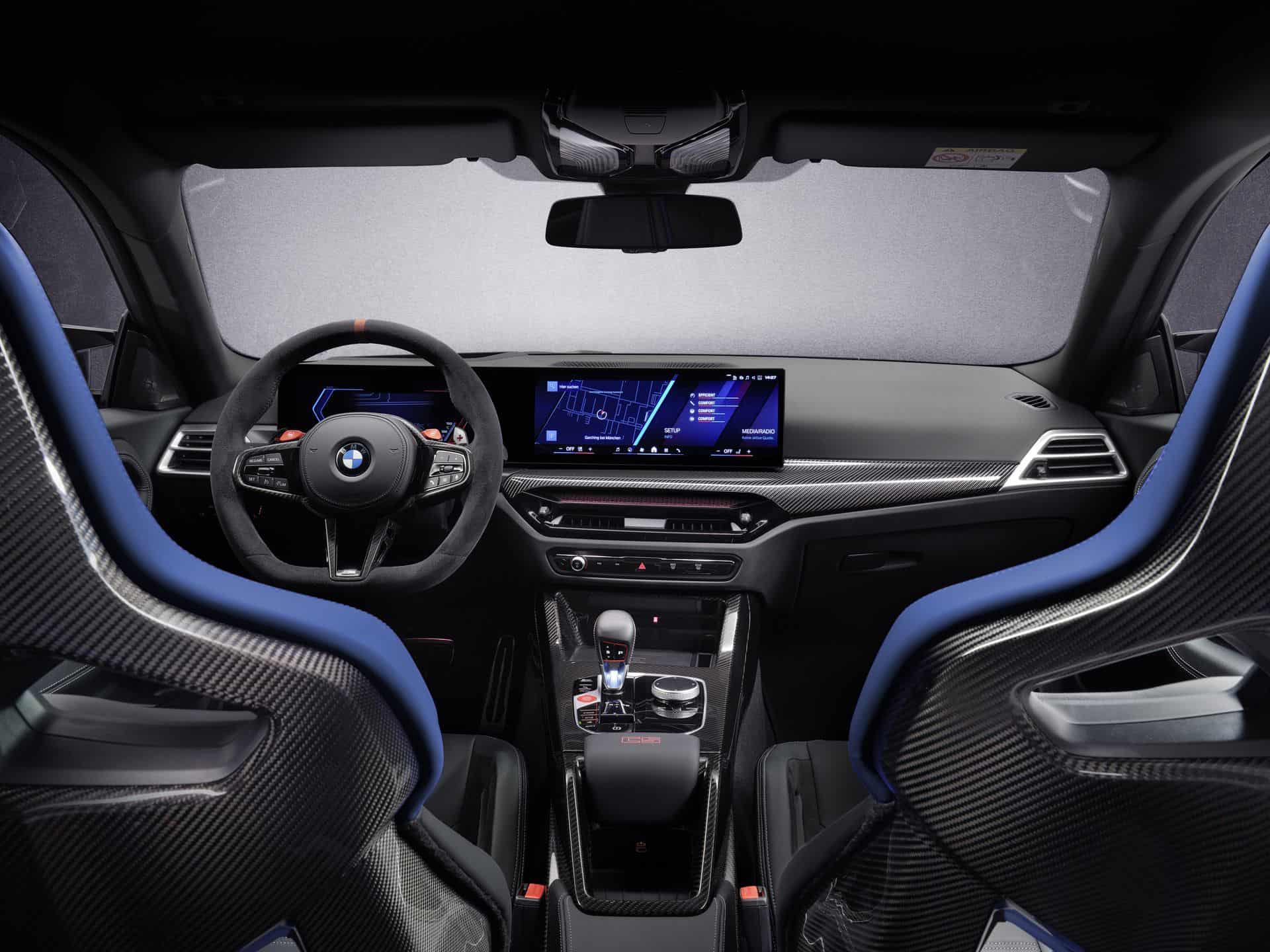 The M2 CS’s interior is built around performance and lightweight design. The driver and passenger sit in heated M Carbon bucket seats that combine Alcantara and Black Merino leather with M Color stitching. These seats are lighter than standard buckets, have removable head restraints for helmet use, and can be fitted with multi-point harnesses for track work.