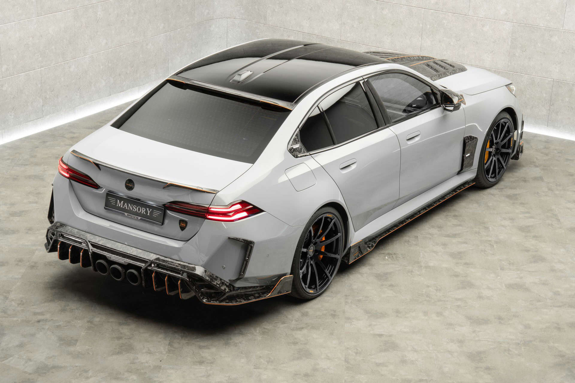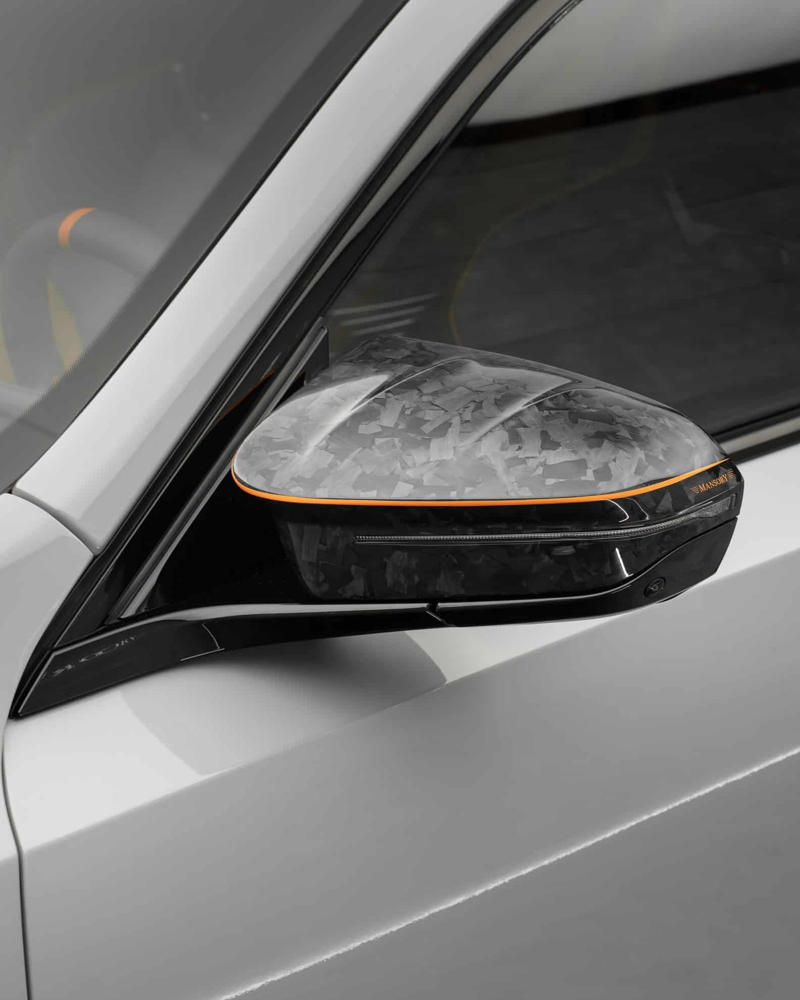 The vented hood, featuring a carbon fiber bulge, is undoubtedly the most eye-catching piece of the body kit. We also can’t help but notice the illuminated Mansory badges on the front fenders and kidney grille. The logo also appears on the Hofmeister kink, and as if that weren’t enough, the tuner’s crest sits proudly on the trunk lid and above the charging port.