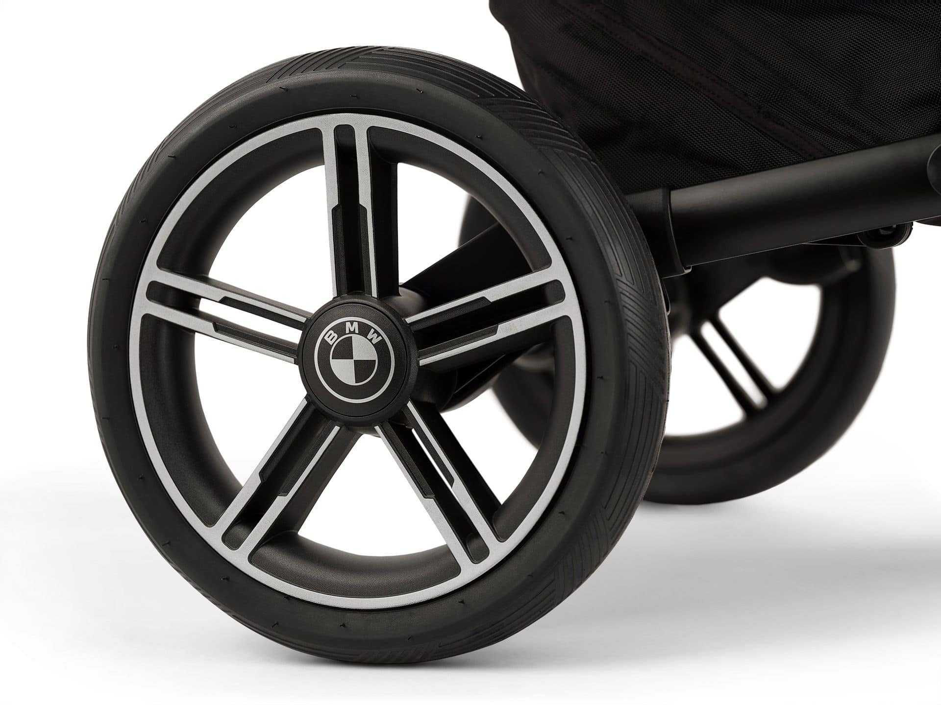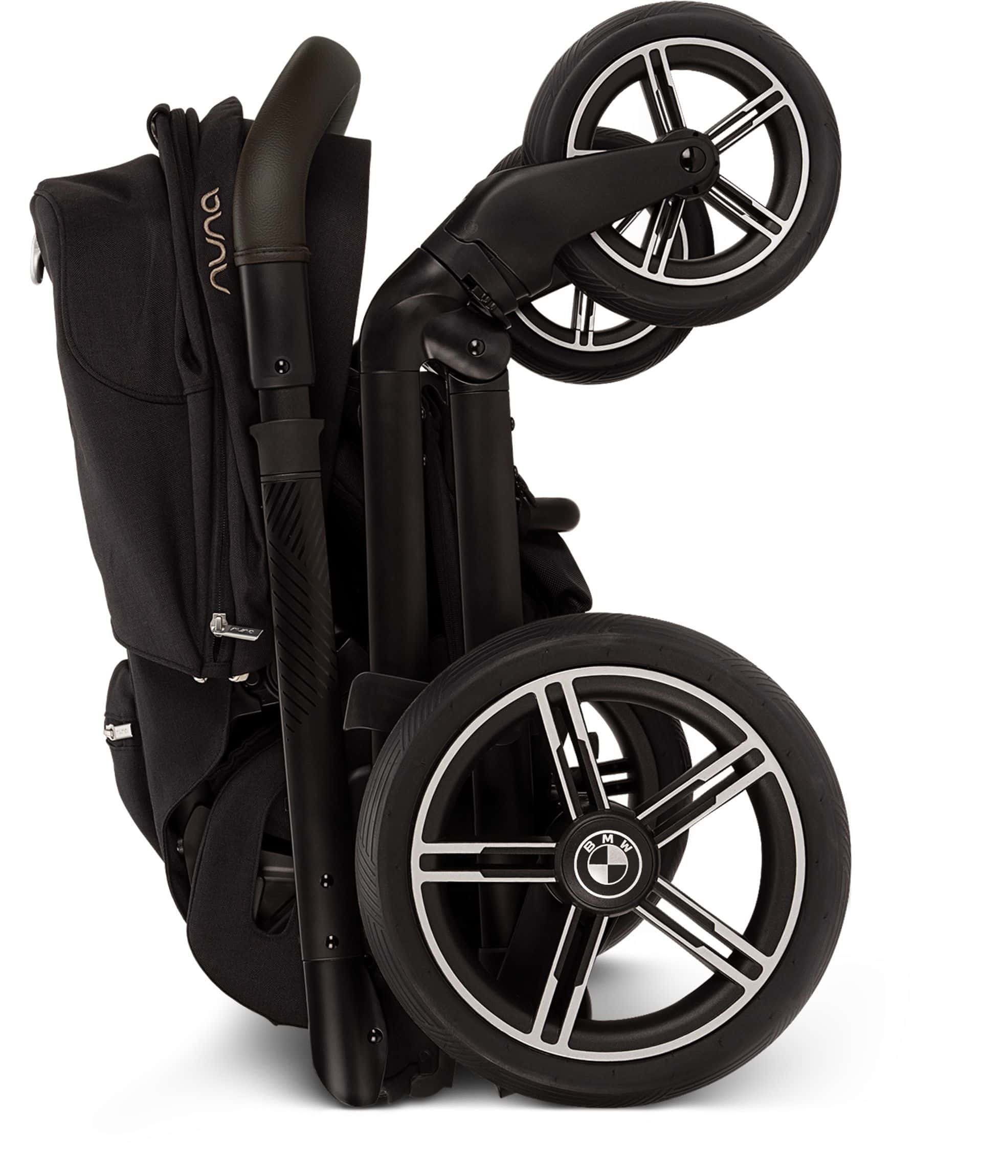 What makes this version different from the standard MIXX Next comes down to design details—and whether those matter to you. The Trinity-pattern wheels, leatherette touchpoints, and BMW badging give it a more refined look. It has a compact fold-away axle that makes the whole stroller surprisingly manageable when collapsed—about 30 x 23.5 x 16.5 inches (76 x 60 x 42 cm) folded. It can even stand upright on its own and be pulled along like a suitcase. The stroller weighs about 24.5 pounds (11.1 kg).