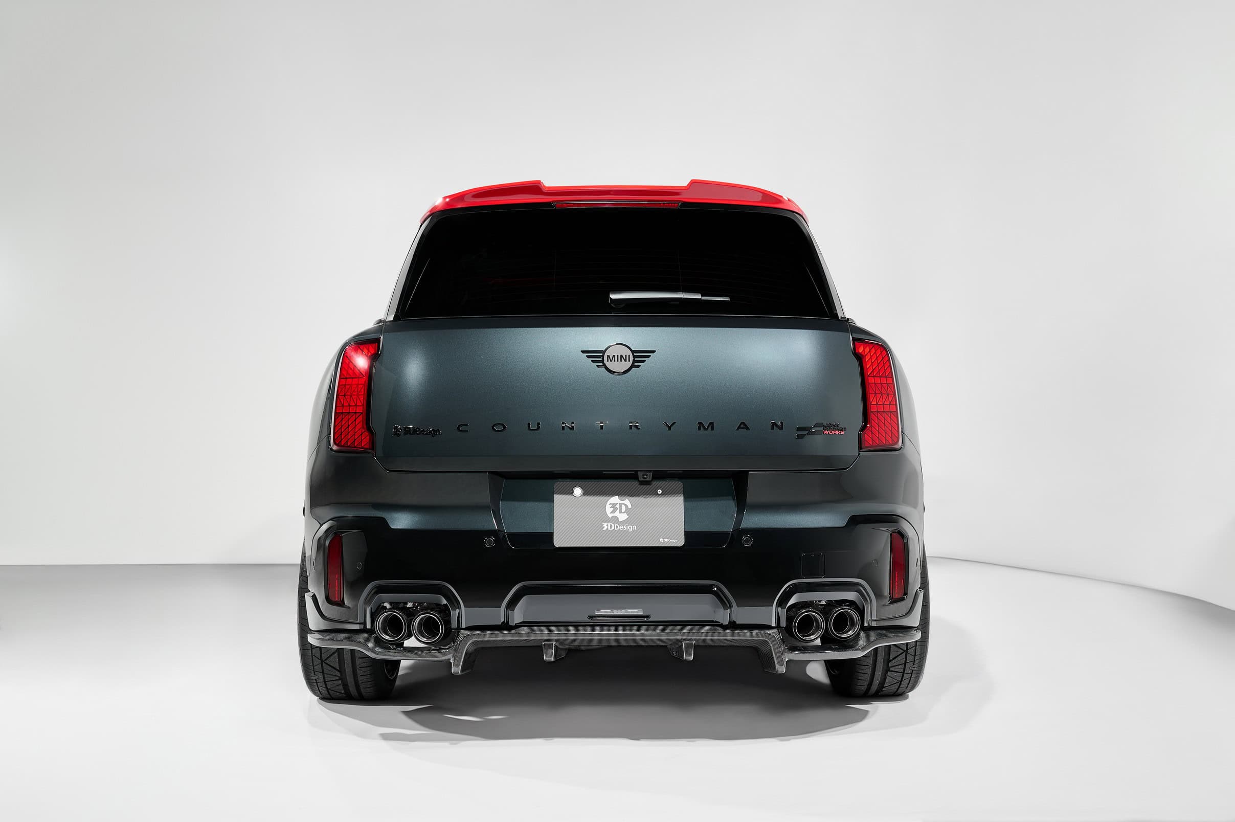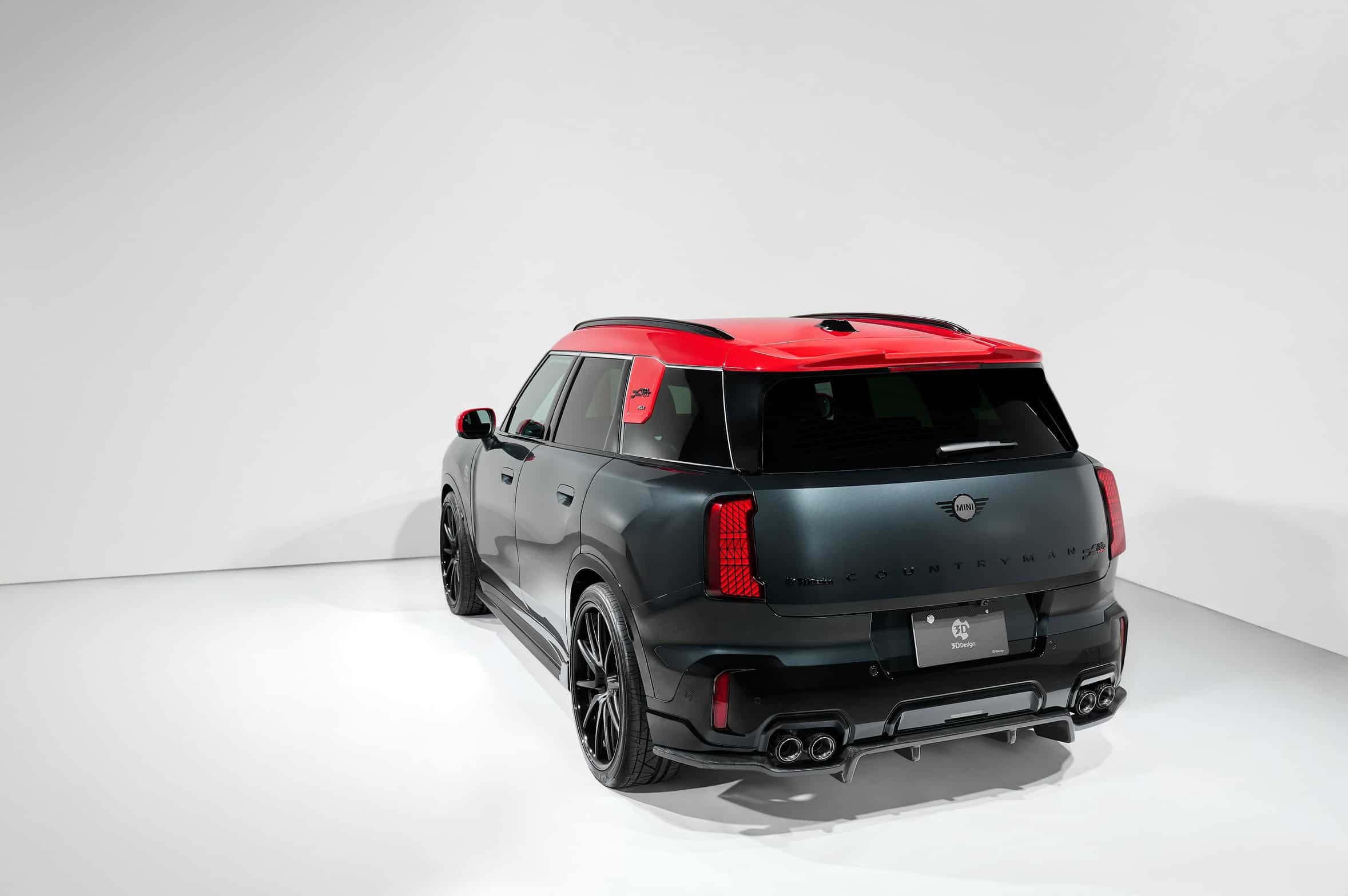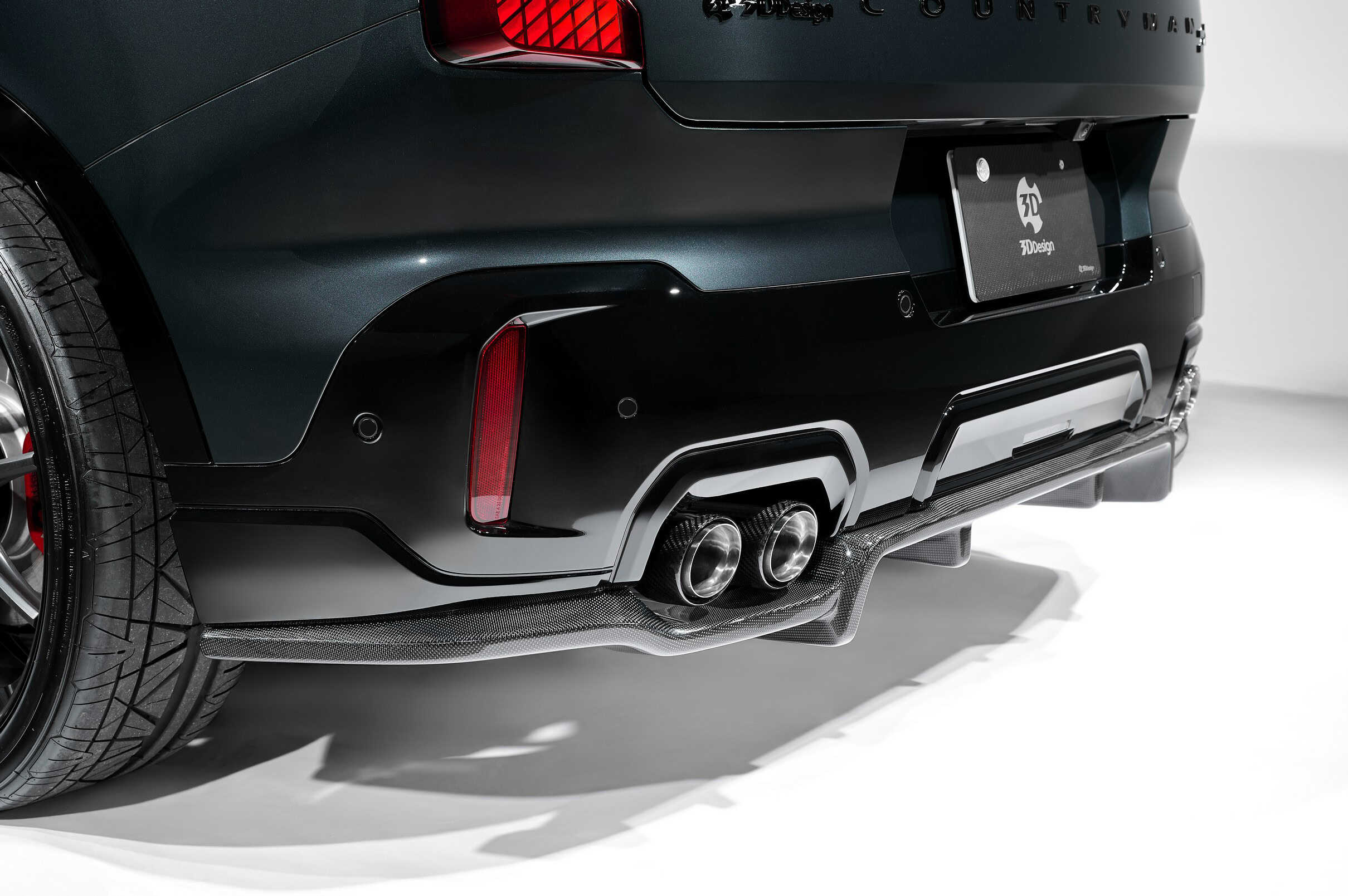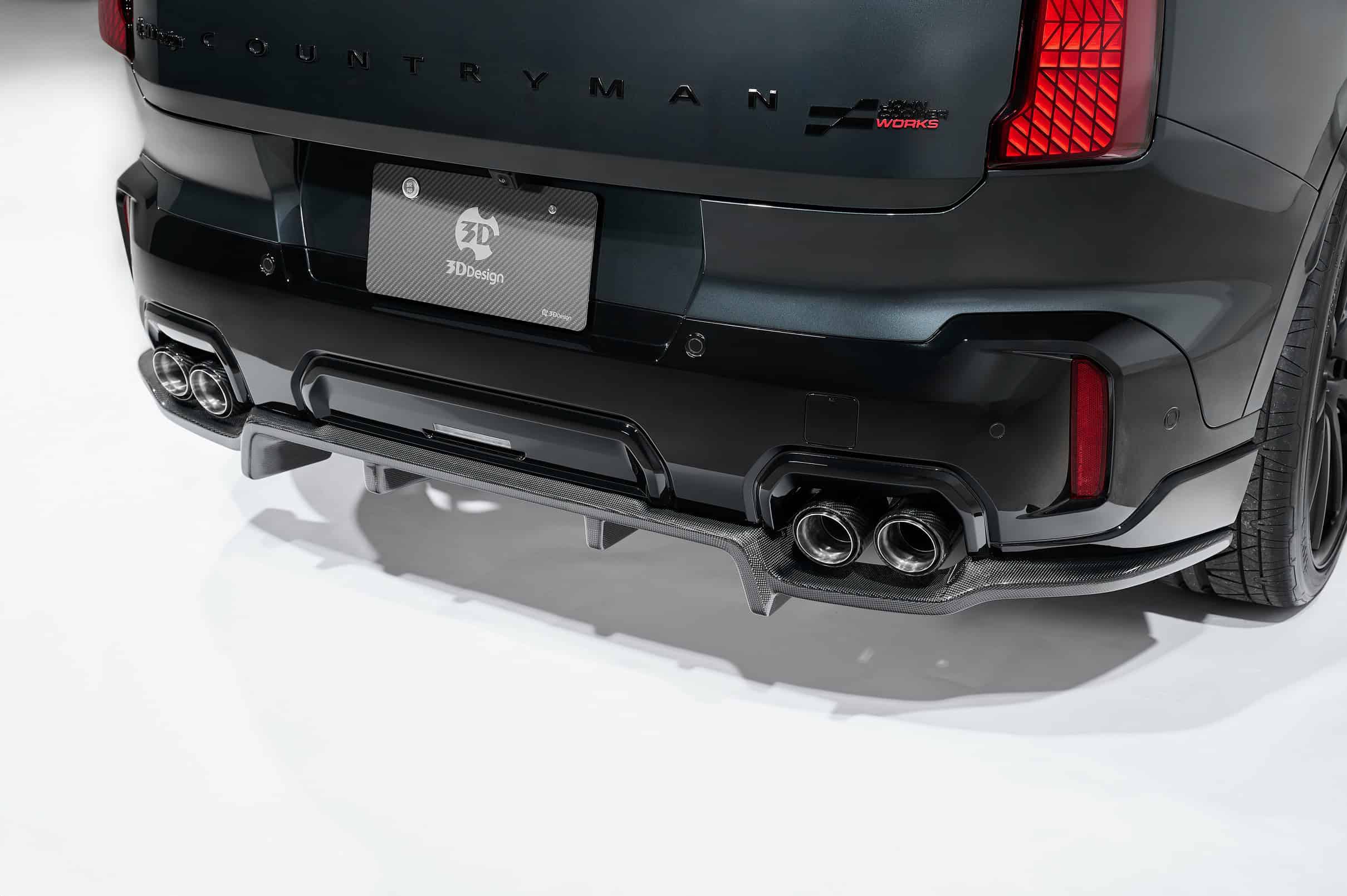 So, what’s changed? 3D Design has crafted a new carbon fiber front spoiler lip to give the Countryman a meaner face. It mounts directly to the original bumper, enhancing the JCW’s presence from the front. Along the sides, carbon fiber side skirts emphasize the widebody stance of the largest MINI to date. Around back, a new carbon diffuser juts out beneath the quad exhaust tips.