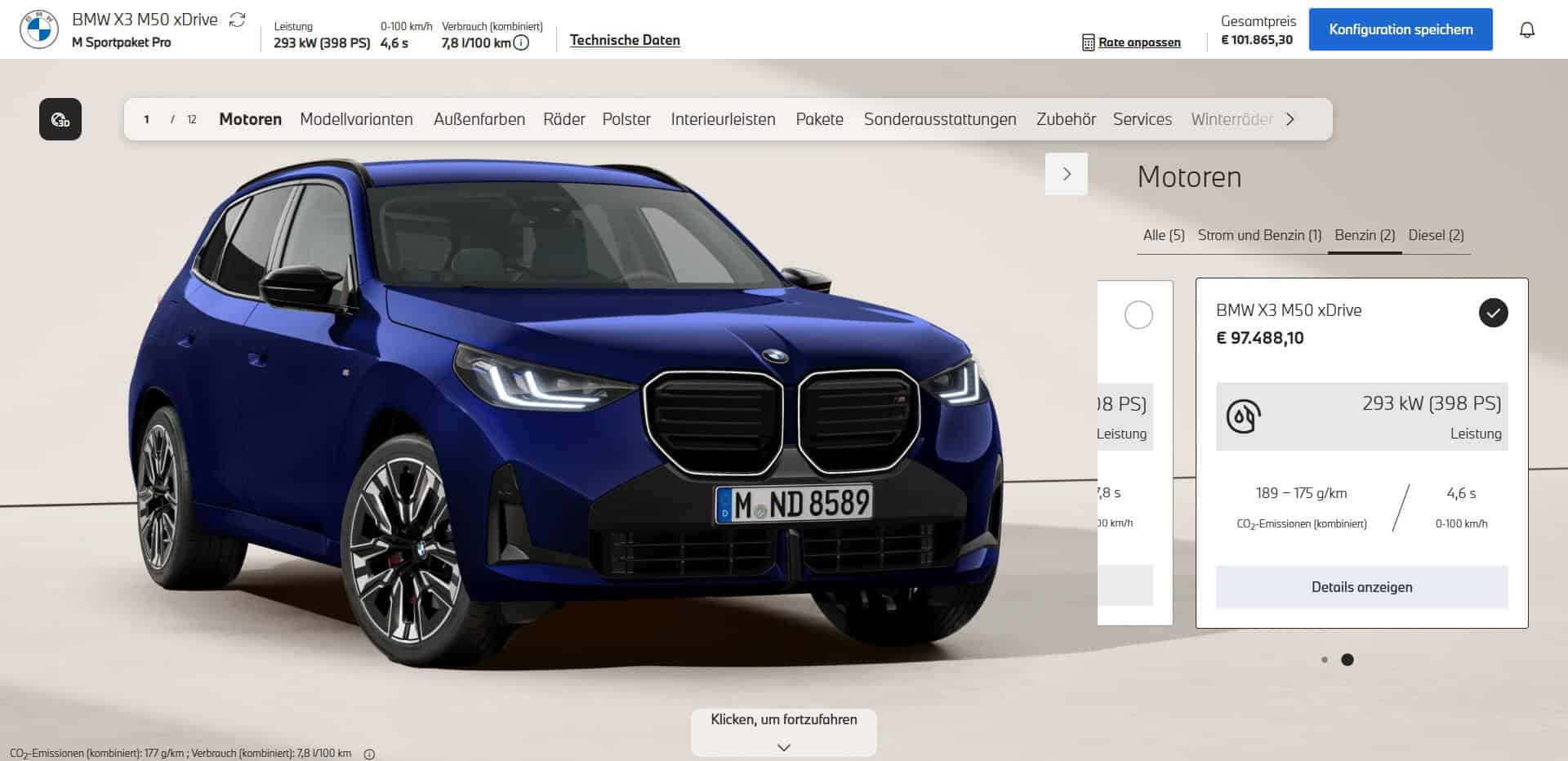 The 360-degree view continues inside, where you can zoom in and out without a noticeable drop in image quality. Additionally, you can do the same on the exterior to get an up-close look at the vehicle you’re customizing. Our build is based on the range-topping M50 xDrive in Individual Tanzanite Blue with 21-inch two-tone wheels (901 I). This configuration costs over €100,000, and we didn’t even check all the boxes on the options list.