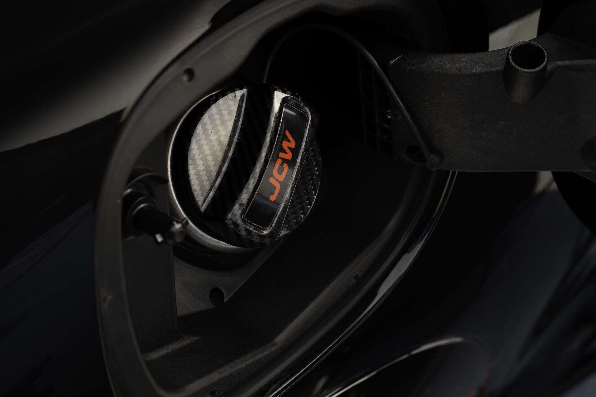 Inside the cabin, available upgrades include JCW-branded floor mats, door pins, and a red-edged tow strap designed for both aesthetic appeal and utility. For those seeking premium materials, MINI is also offering a carbon fiber fuel filler cap and carbon tailpipe trim.