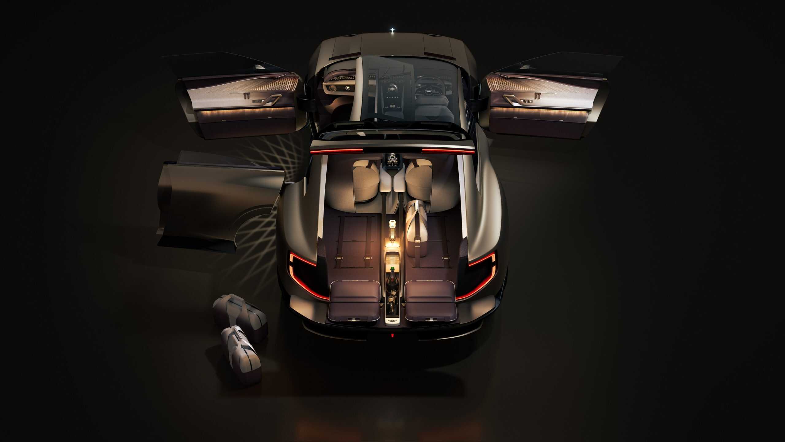 The interior is equally special, featuring only three seats despite the EXP 15’s large footprint. The front passenger seat swivels 45 degrees outward to facilitate easy access to the spacious cabin. While it has just three full-size seats, the cargo area can accommodate a pair of small seats once the tailgate is opened, similar to the Rolls-Royce Cullinan’s Viewing Suite.