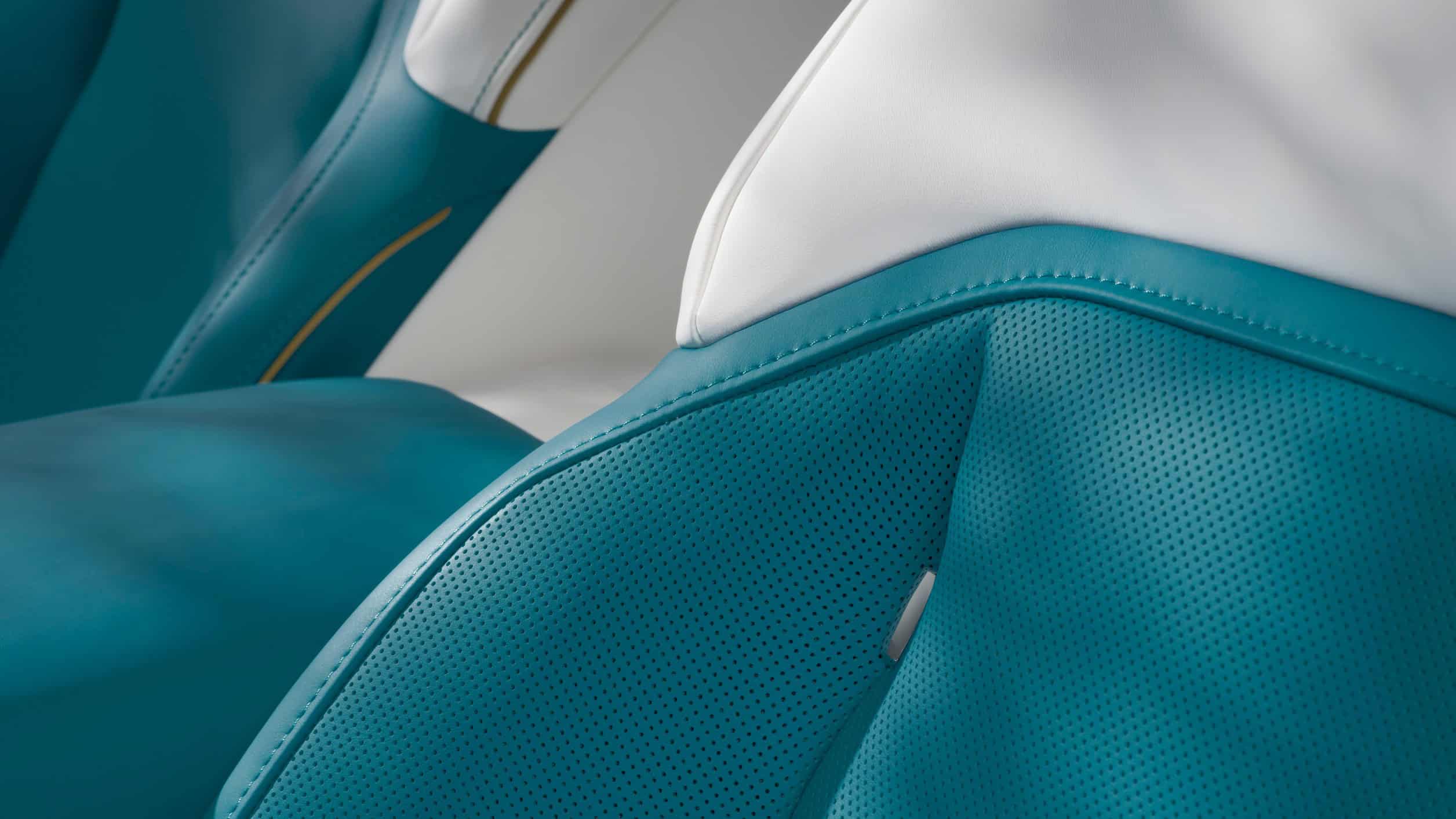Interior finishes vary by body color. Evanescent pairs an Arctic White exterior with Grace White leather. Reverie comes in Duck Egg Blue, matched with Grace White and Charles Blue leather. Blossom wears Velvet Orchid Metallic, with Grace White leather accented by Peony Pink. Naturally, the coachline color differs for each version as well.