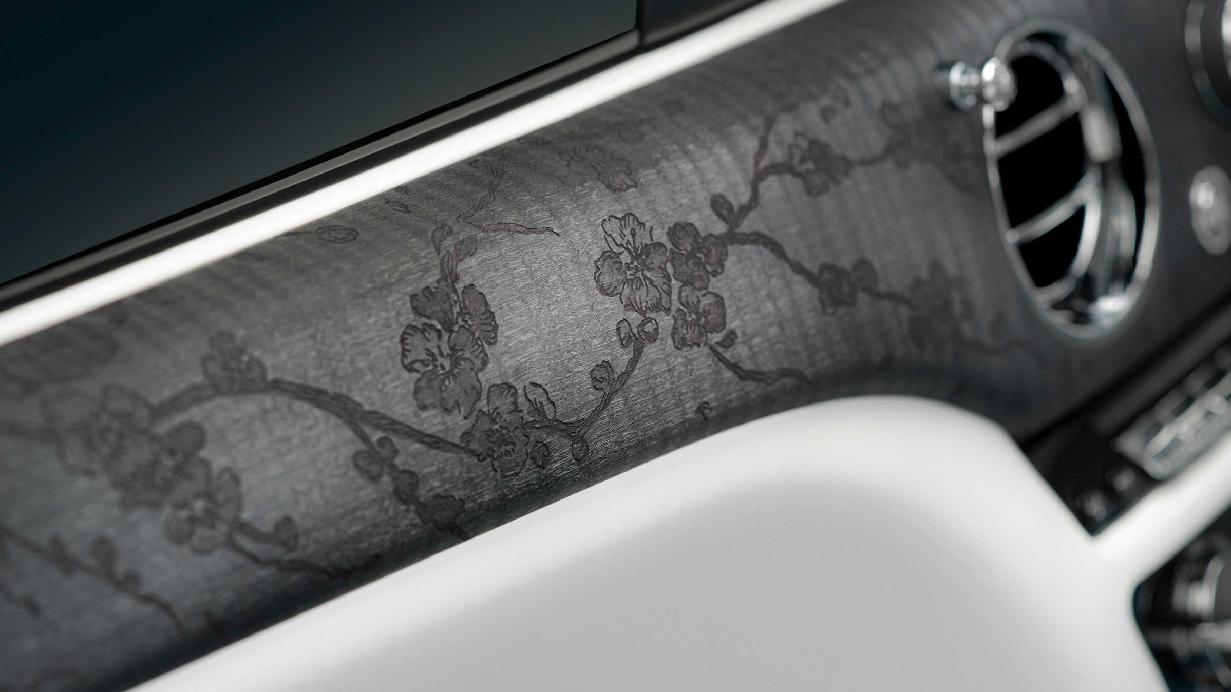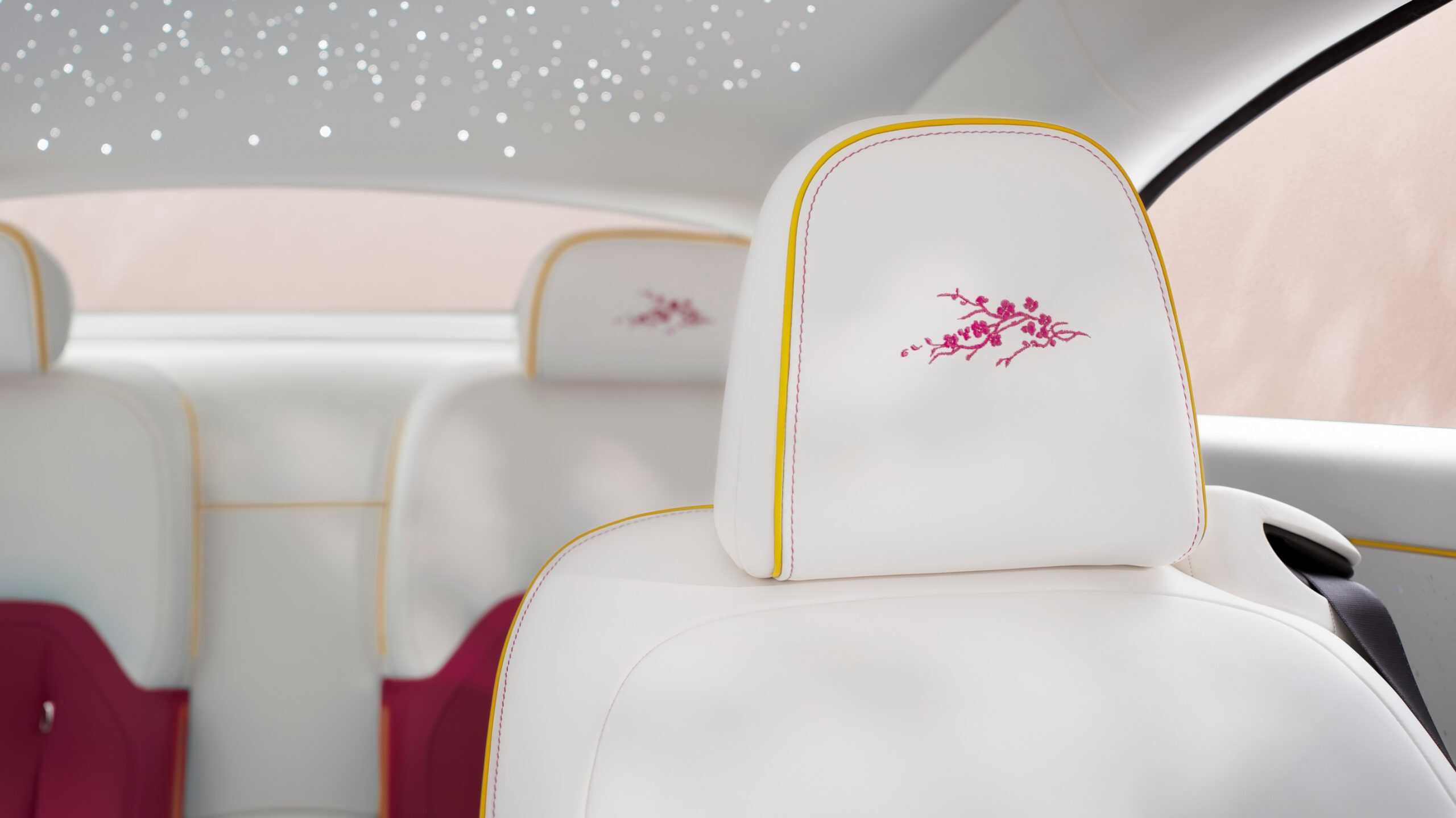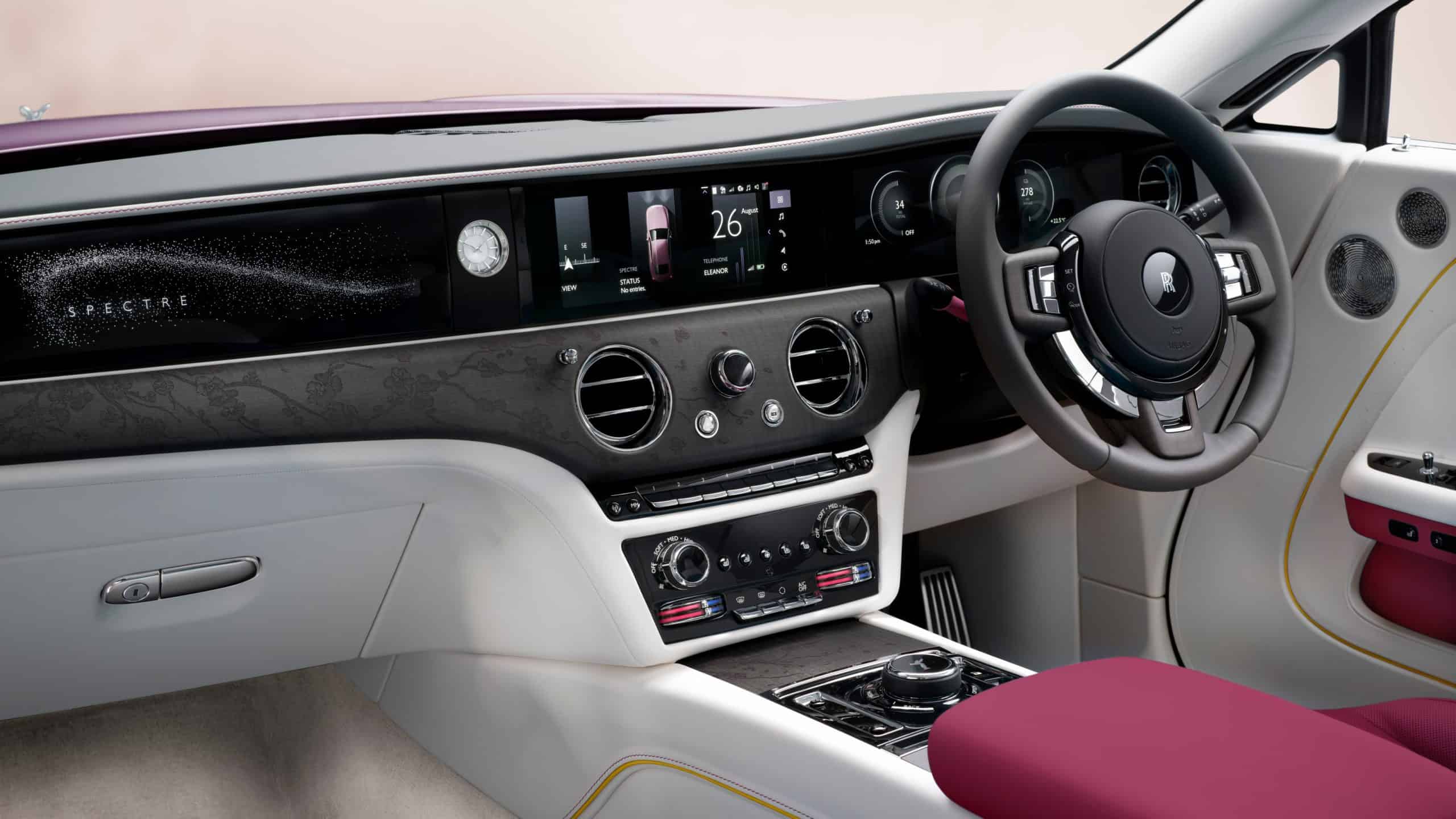 Whichever version you choose, all share a hand-painted coachline depicting a cherry branch in bloom. The motif continues inside, appearing on the illuminated side sills, the headrests, and the center console. Elsewhere, the upper dashboard wears an elegant dark finish called “Blackwood.”