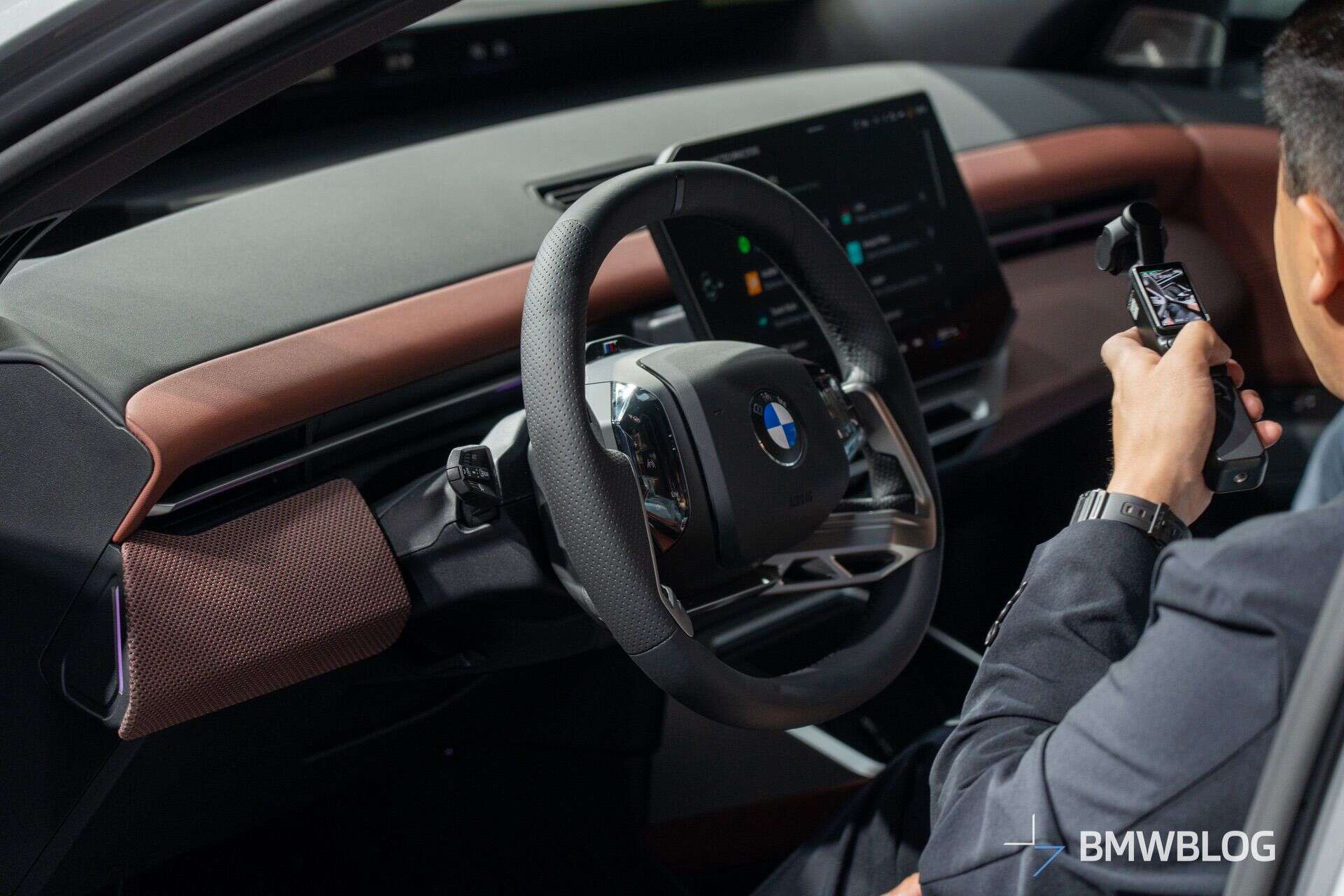 The exterior’s Space Silver paint, or Spacesilber metallic as it’s called on BMW Germany’s iX3 configurator, ultimately pairs well with the M Sport bodywork and large wheels. These bi-color 22-inch wheels are dubbed Style 1054, and they’re the largest you can get on the new iX3. They’re also for M Sport cars only — although there is another 22-inch wheel offering open to all iX3 models. Blue brakes proudly wear M branding behind the huge alloys, further clueing you in that it’s an M Sport model. But things get even more interesting when you open the door.