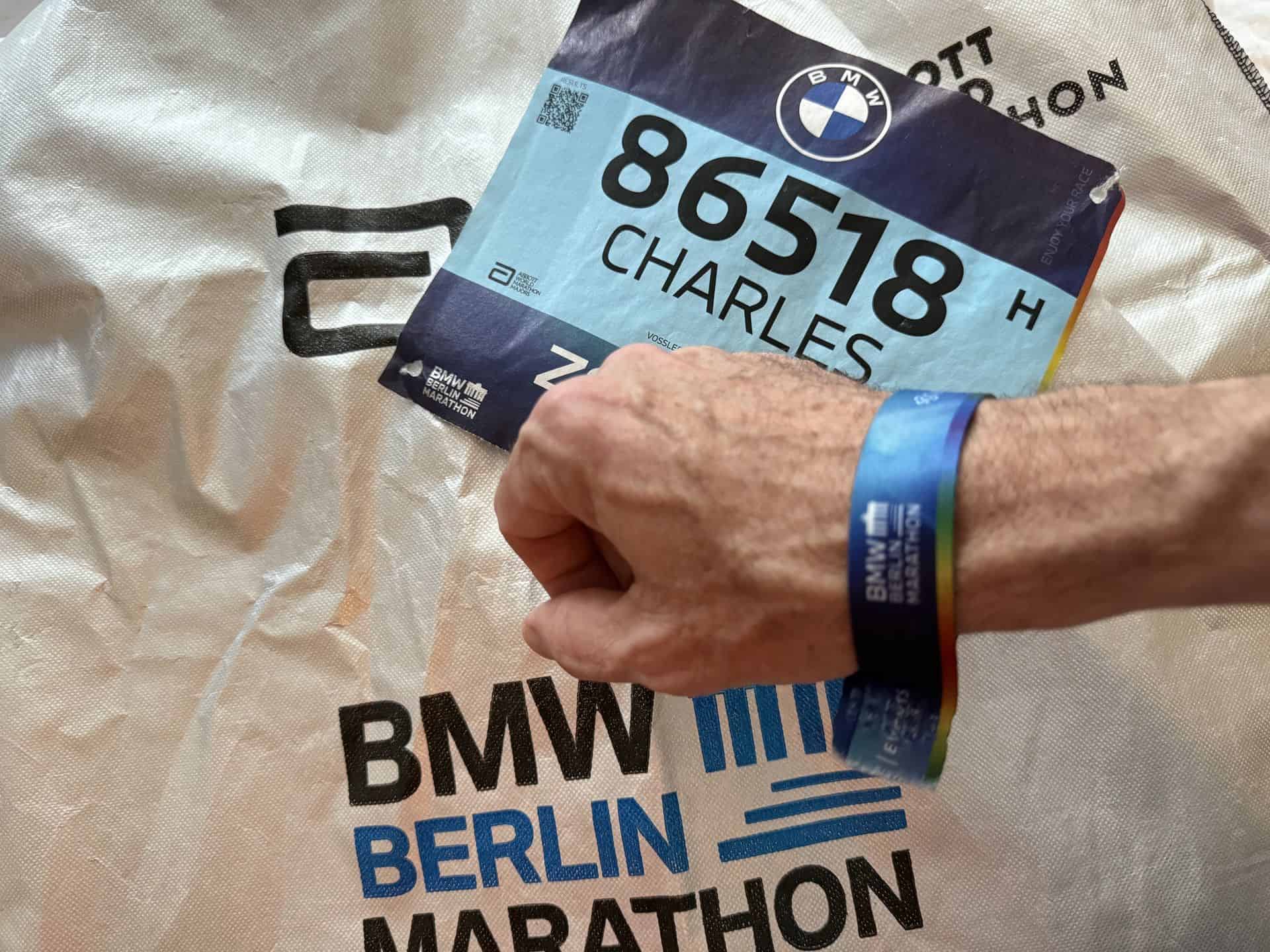 An email weeks earlier recommended booking an appointment for bib pickup. The expo ran Thursday through Saturday, with a separate lane for walk-ins, but the appointment line was quick and efficient. The athlete wristband was surprisingly interesting: about one centimeter wide, made from sturdy yet slick fabric, cut to size, and heat-sealed. In the days leading up to the race, these distinct BMW Berlin Marathon wristbands made it easy to spot fellow runners around our hotel.