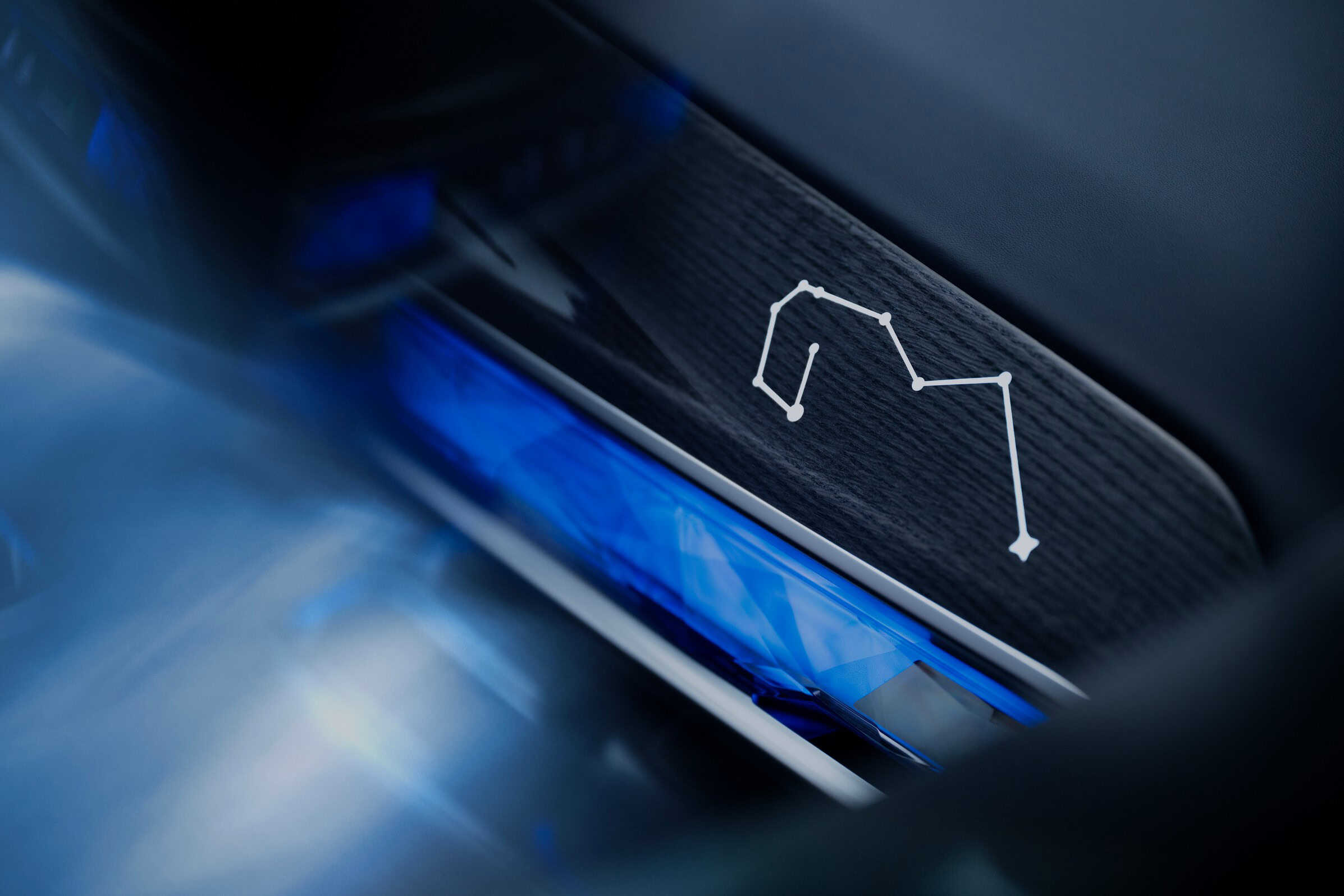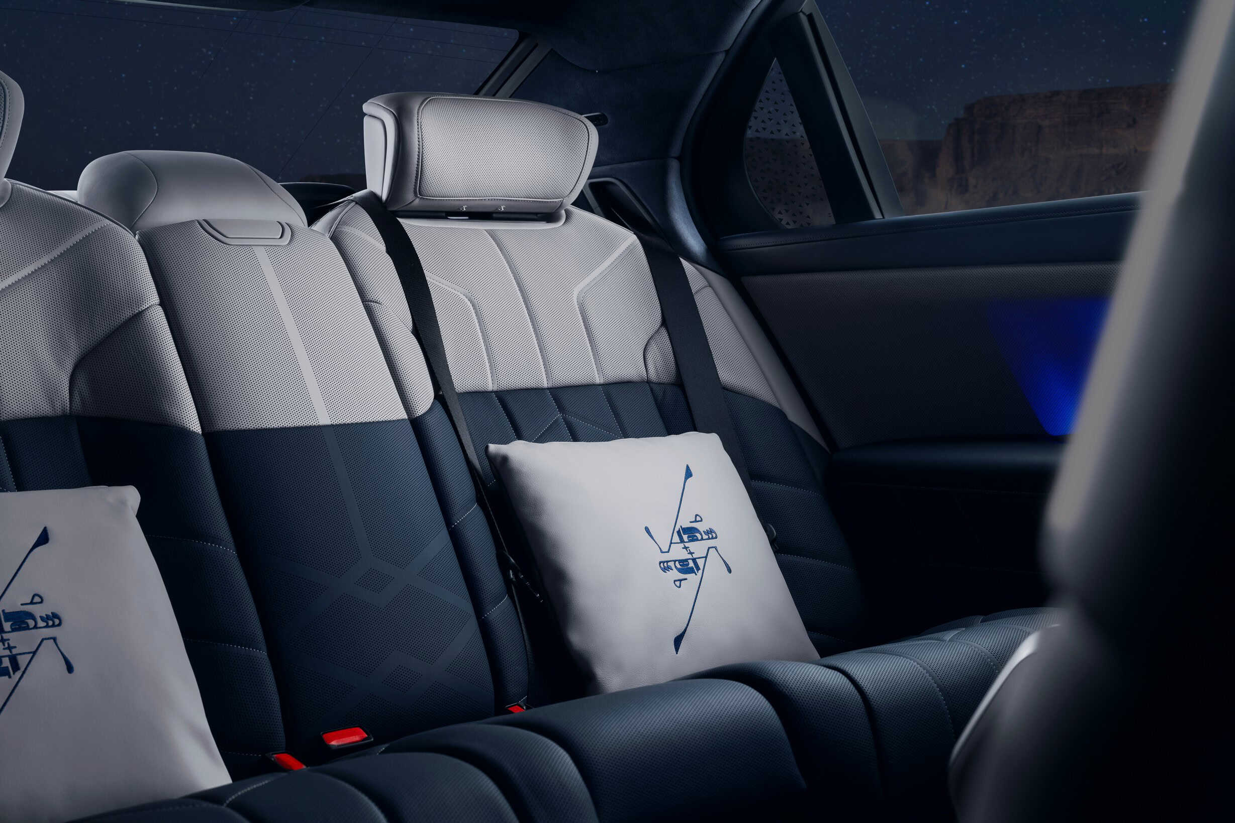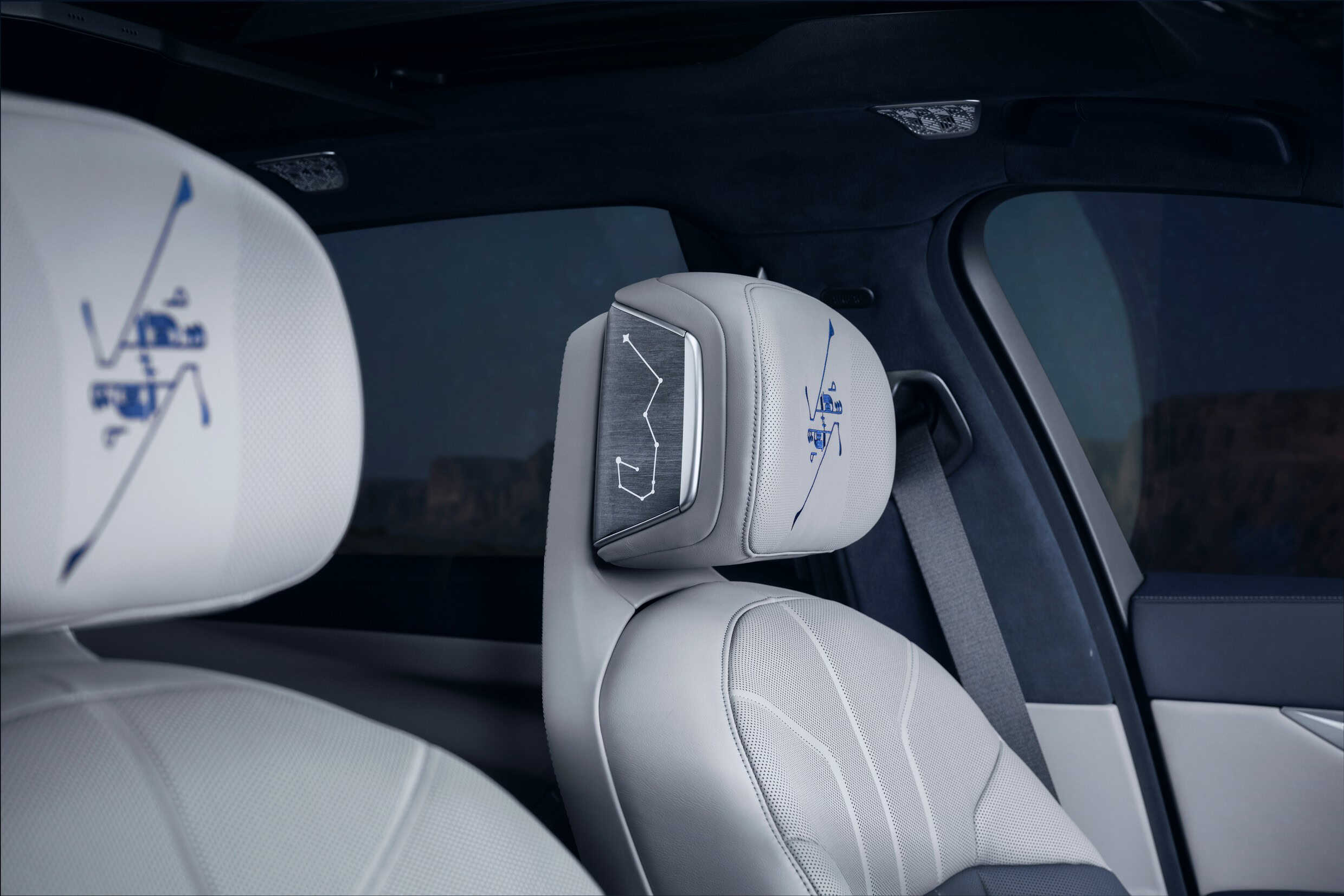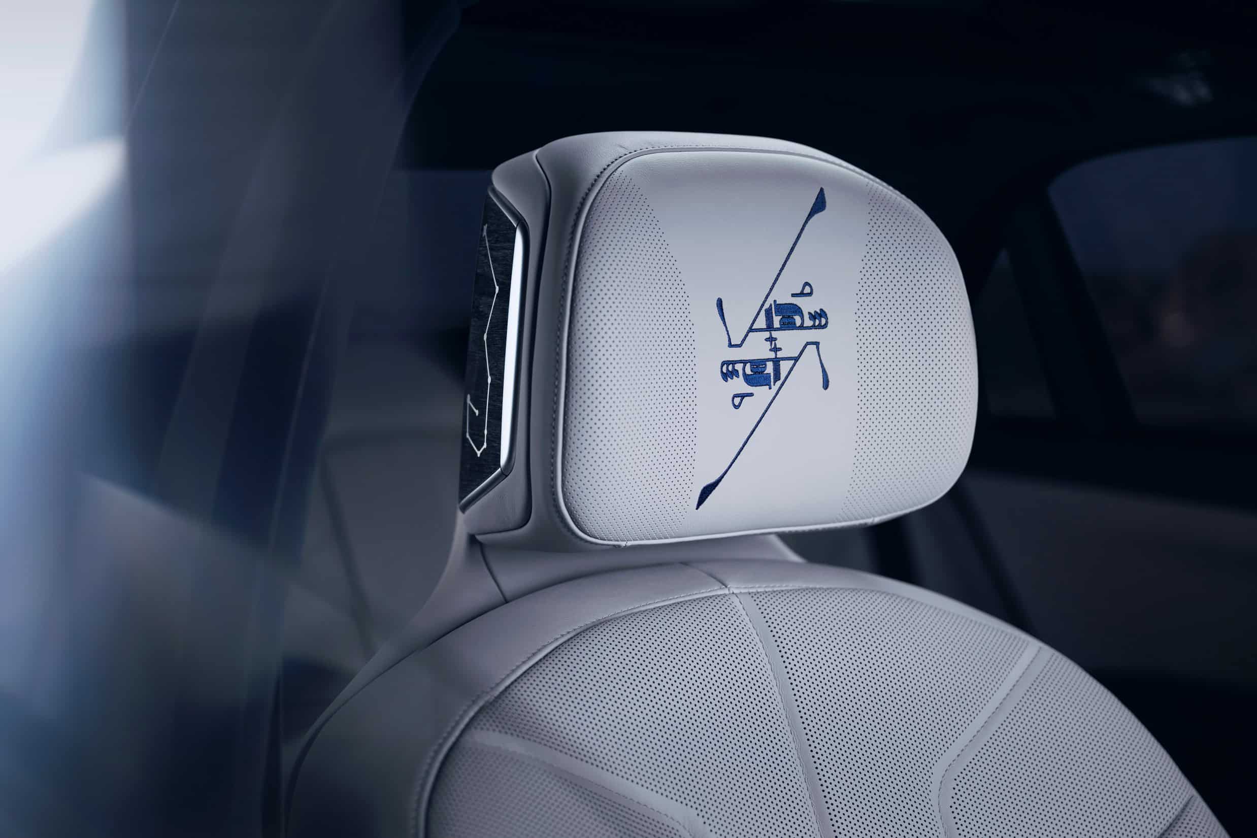 The 760i wears a sophisticated Individual finish that blends Oxid Grey metallic with Night Blue metallic. You’ll also notice the Suhail constellation motif on the rear pillars, front headrests, dashboard, and even the rear pillows. Inside, the seats are trimmed in Individual Taupe Grey/Night Blue leather, complemented by oak mirror-finish wood trim and grey-metallic high-gloss accents.