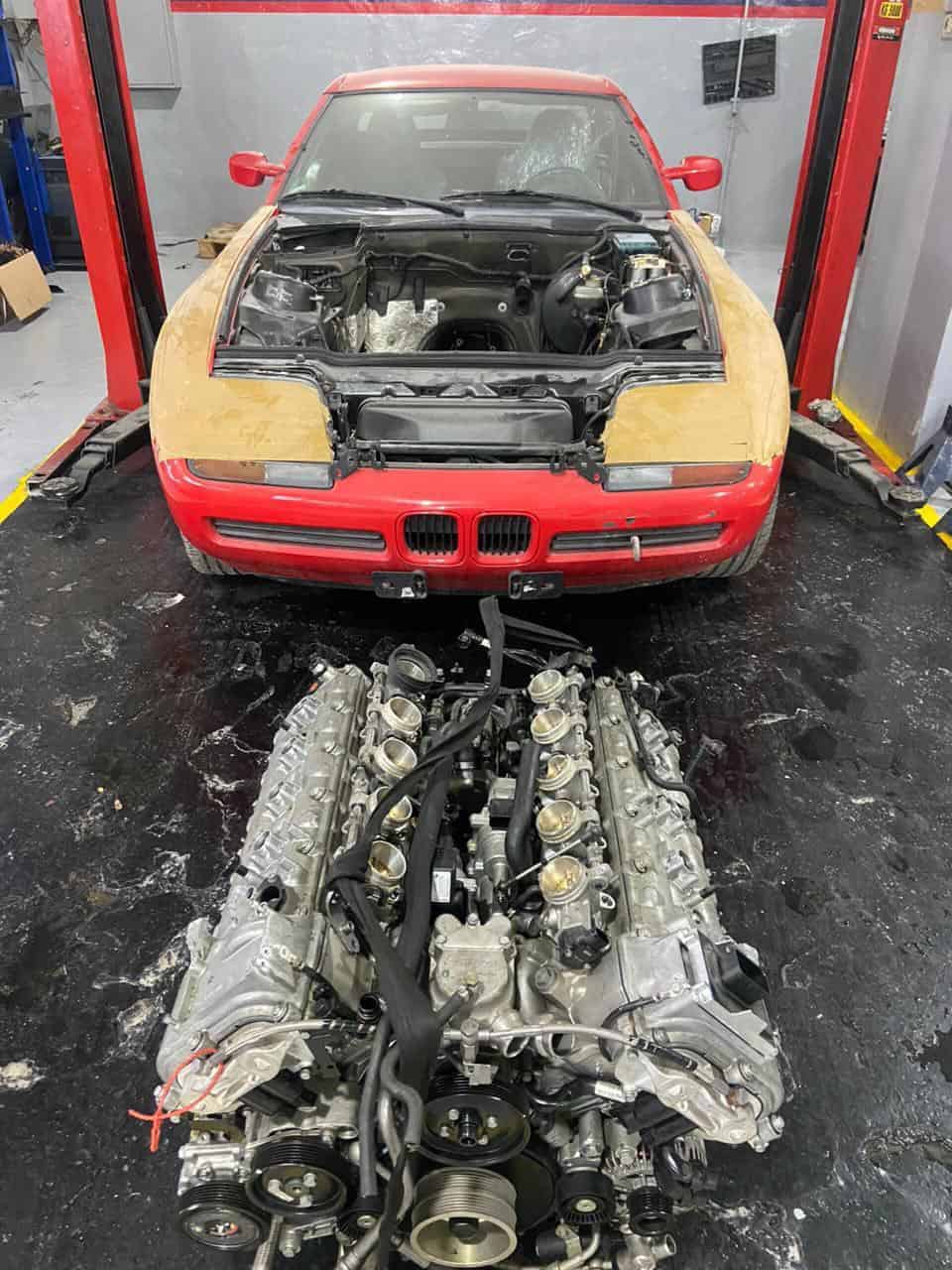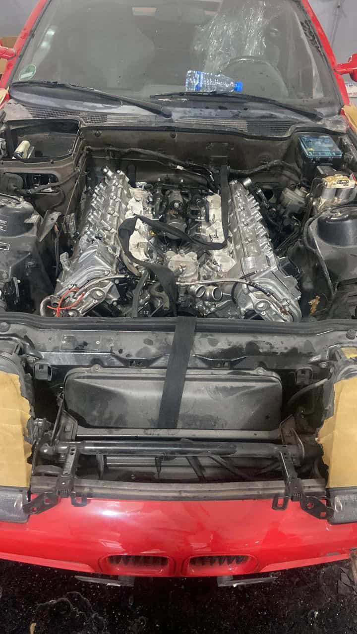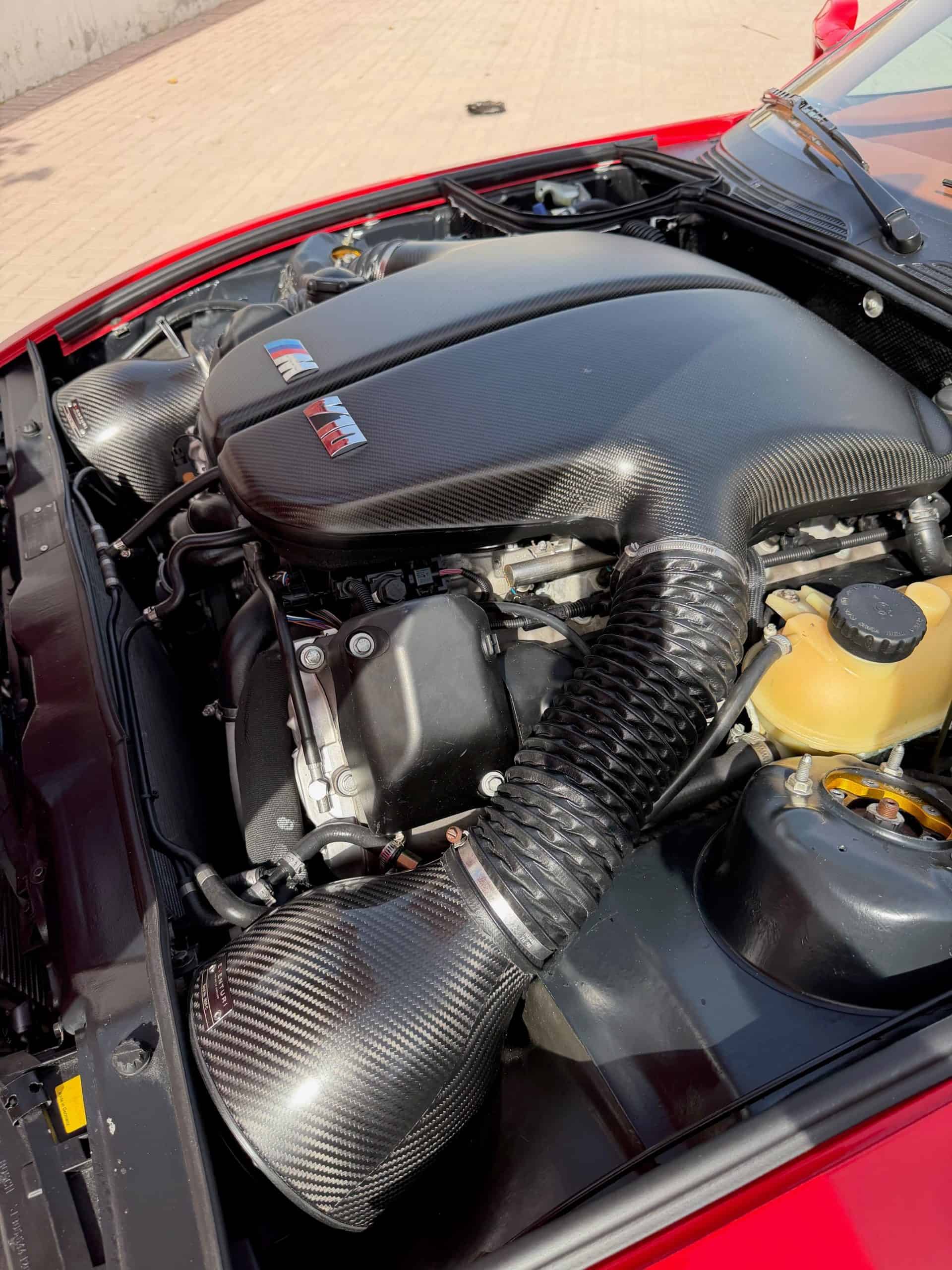 It was also the company’s first model with a multi-link rear suspension and had an almost ideal weight distribution of 49/51 front to rear. This car, however, is certainly more nose-heavy. Gone is the original inline-six M20 from the 3 Series E30 325i, replaced by a much bigger heart with four extra cylinders. Under the hood sits a V10 crate engine with a custom carbon-fiber cover styled to resemble the S85.