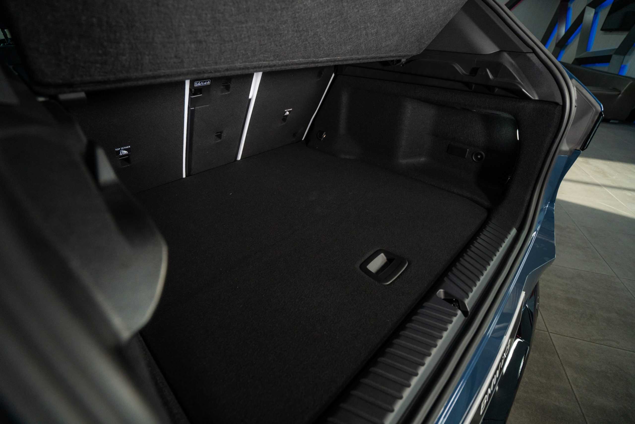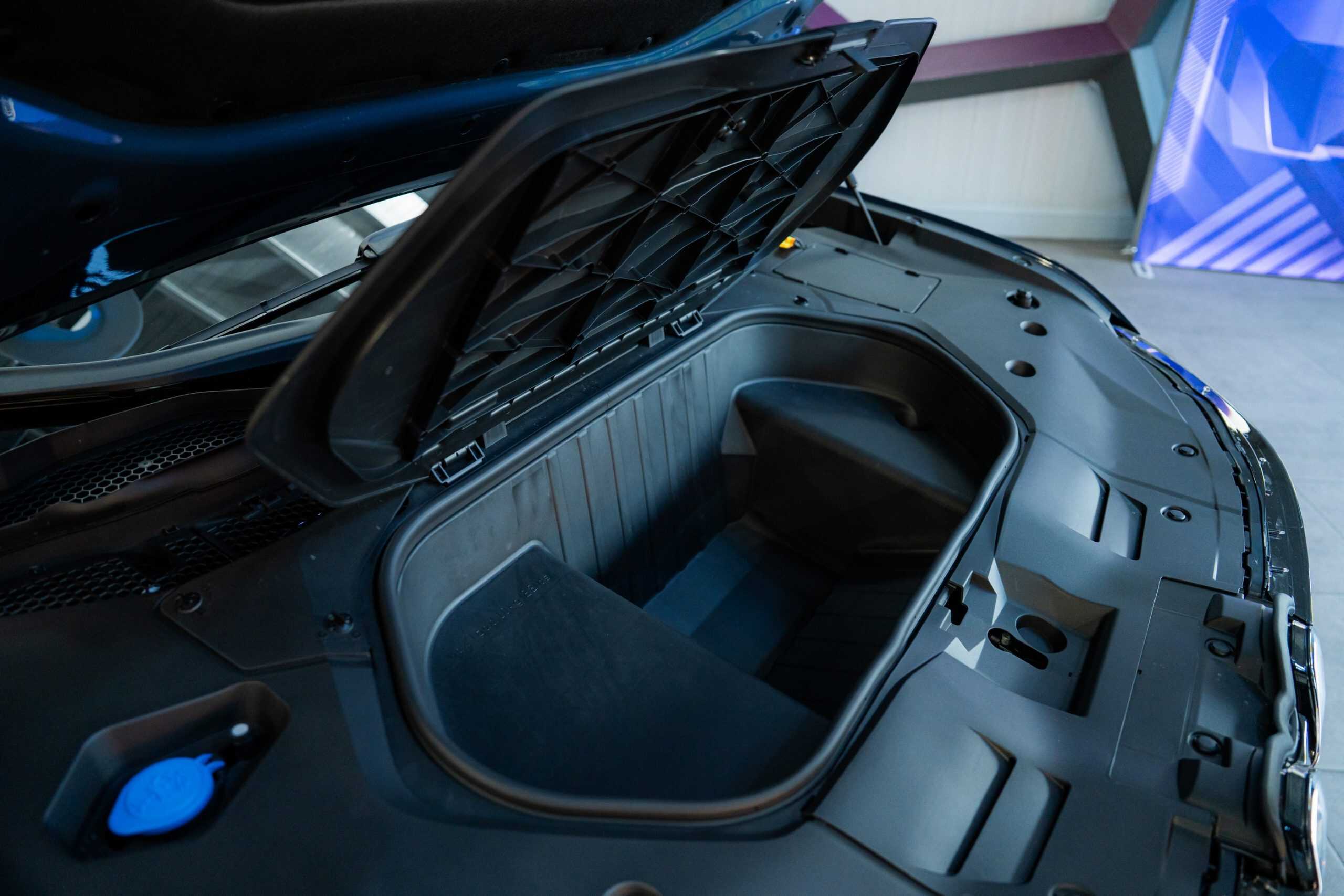 BMW’s subtly updated logo adorns not only the new steering wheel and other familiar locations but also the front trunk’s storage lid. Lift the cover, and you’ll spot an interesting detail: the maximum payload capacity is printed inside: 10 kilograms (22 pounds). The frunk volume is 58 liters. We recently learned it has drain plugs, meaning you can fill it with ice to keep drinks cold and then remove the plug to drain the water.