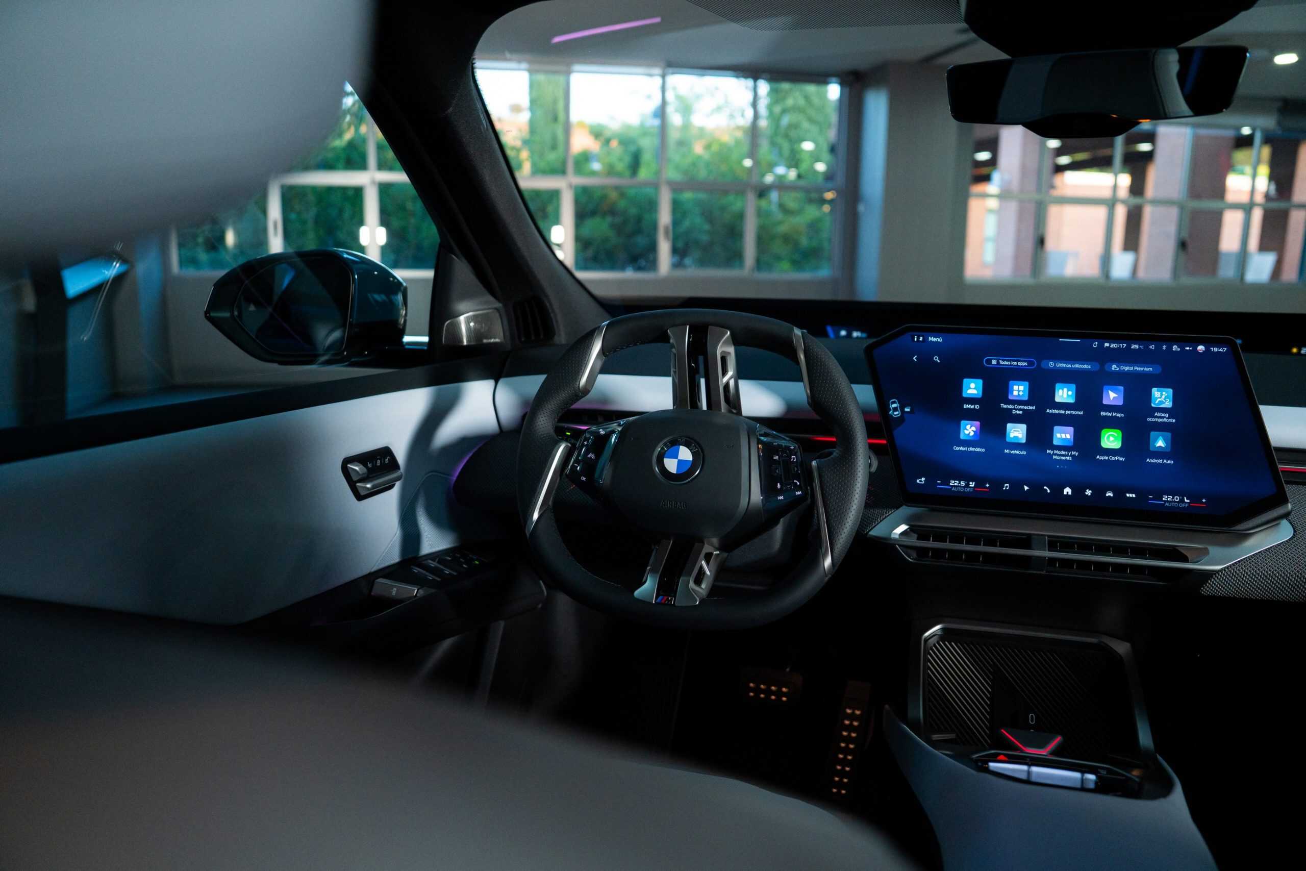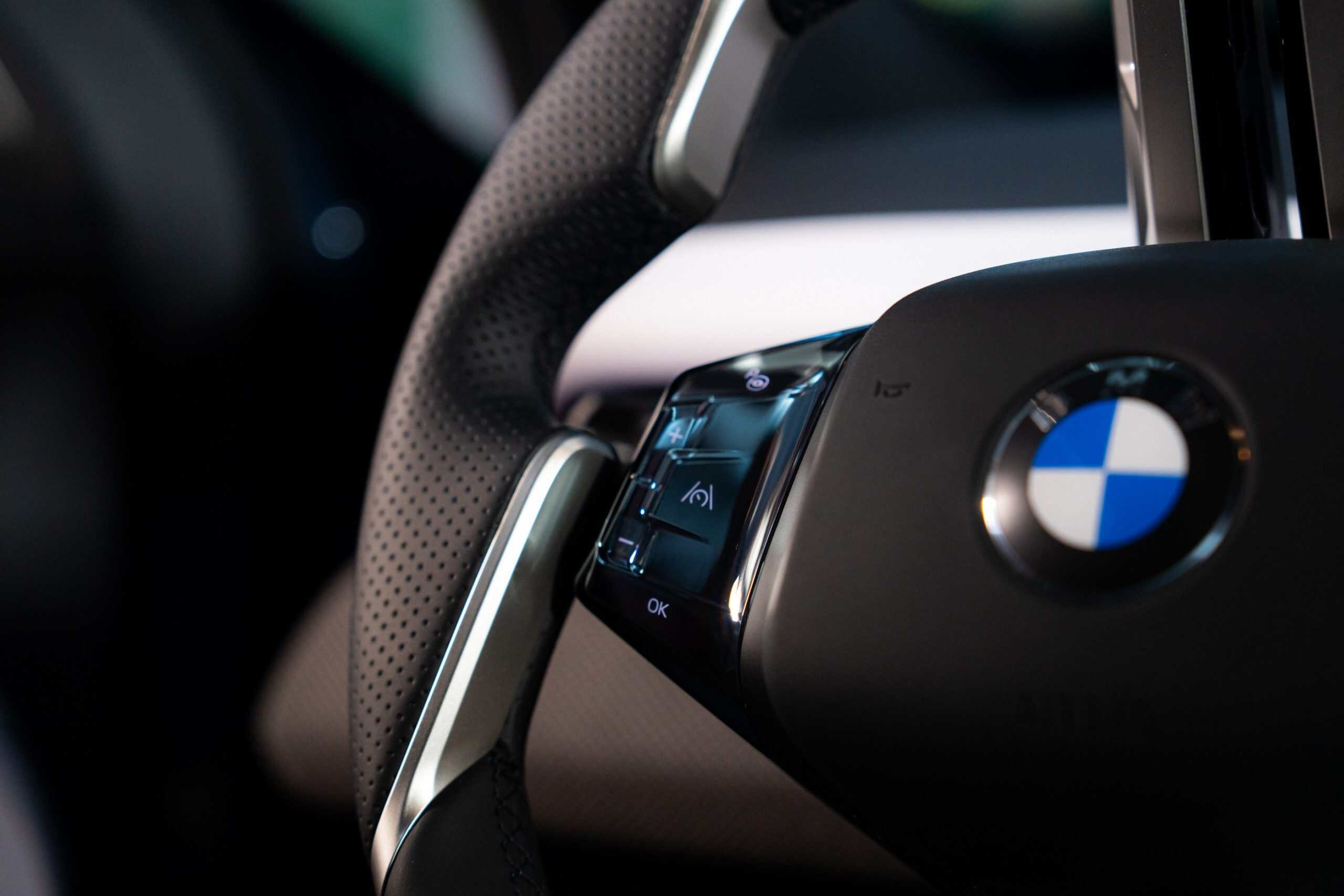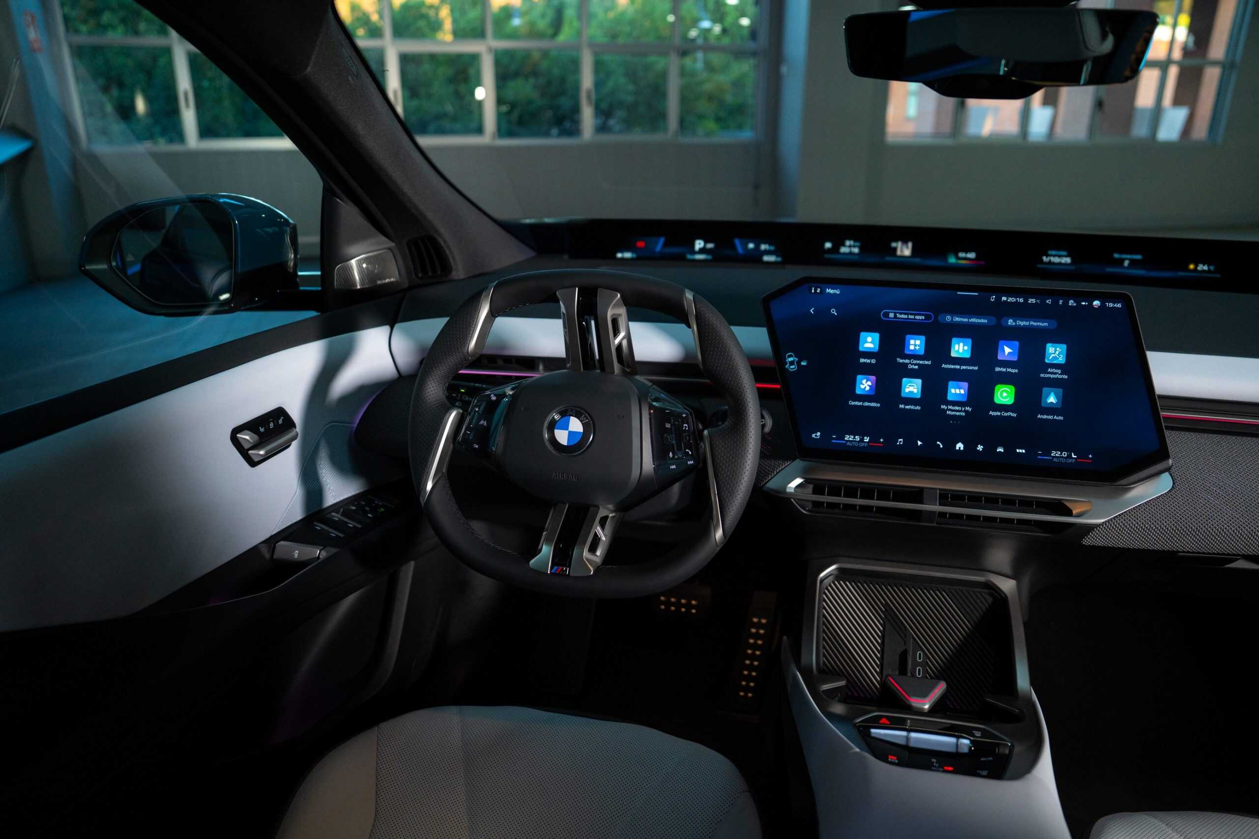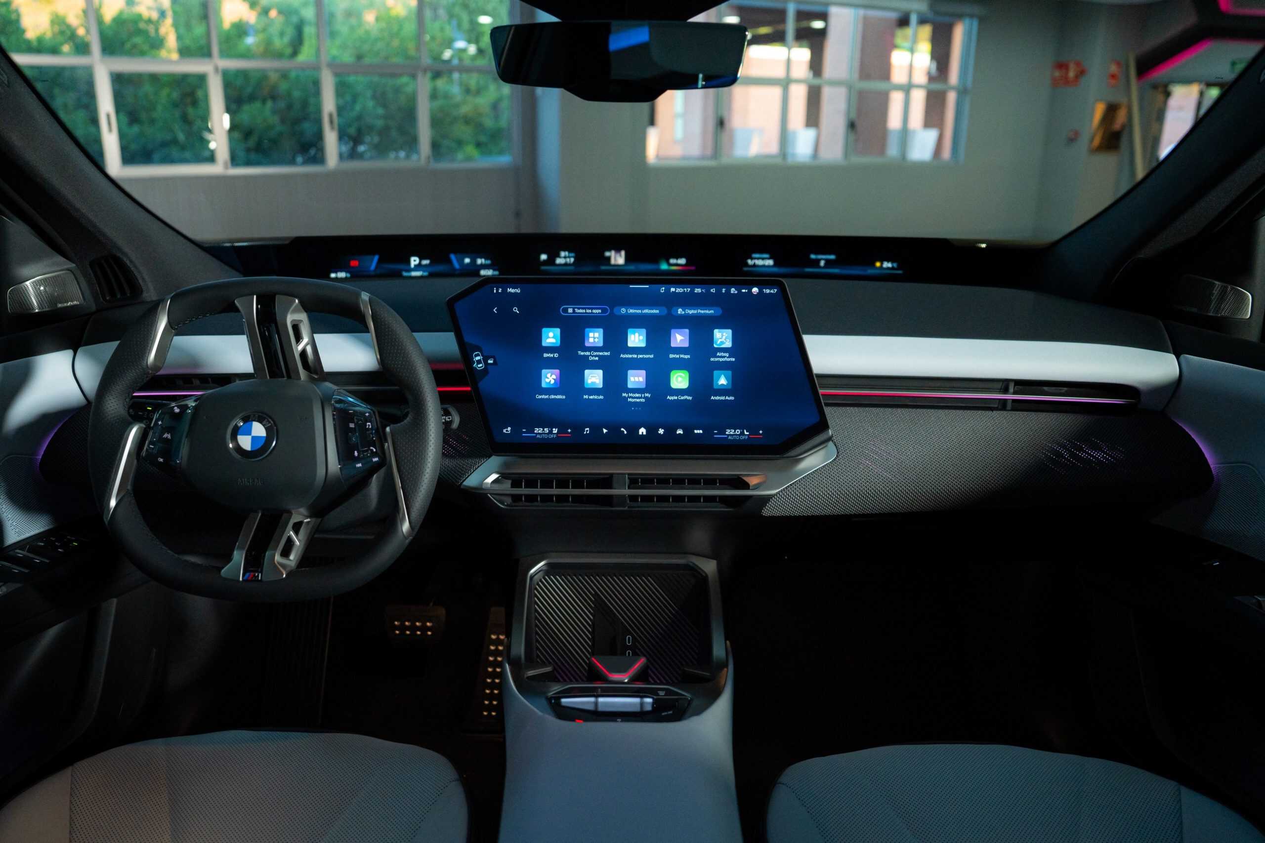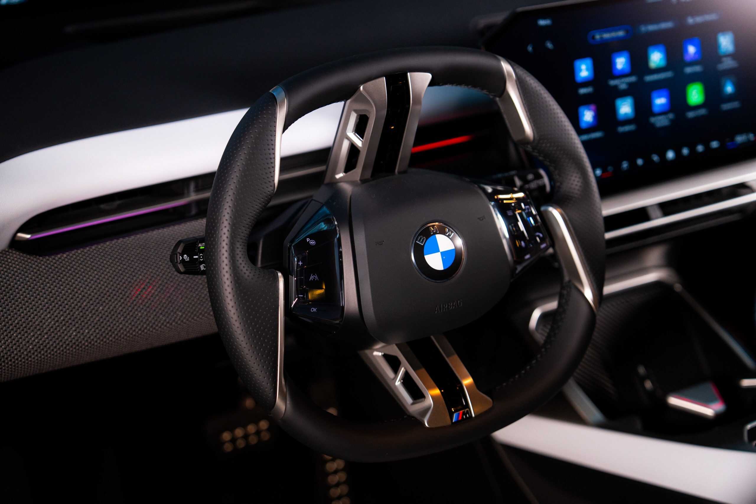 The real highlight, however, is the cabin, where the iX3 is finished in Digital White. It’s an artificial leather (Veganza) upholstery, but without the white steering wheel shown in press images. Why? It won’t be available to order until January 2026. For now, the first modern Neue Klasse is shown with the standard sports steering wheel included with the M Sport Package. A different M-branded steering wheel is offered at an additional cost.