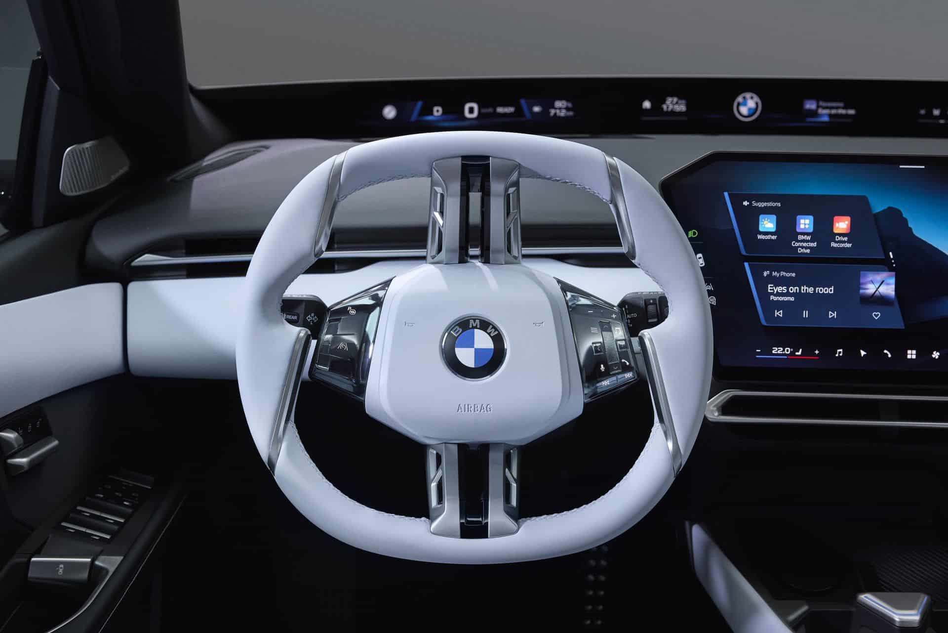 And here’s the detail most people have missed: there’s a physical gap where you’d expect the button cluster to connect to the center hub. “There is actually a hole through there,” van Hooydonk noted, “so there’s no connection to the center where the buttons are.” The controls sit on what BMW calls “satellites” — floating pods on the outer rim, architecturally separate from the spokes themselves. It looks unusual. It is unusual. But it’s also a considered ergonomic choice rather than a styling exercise.