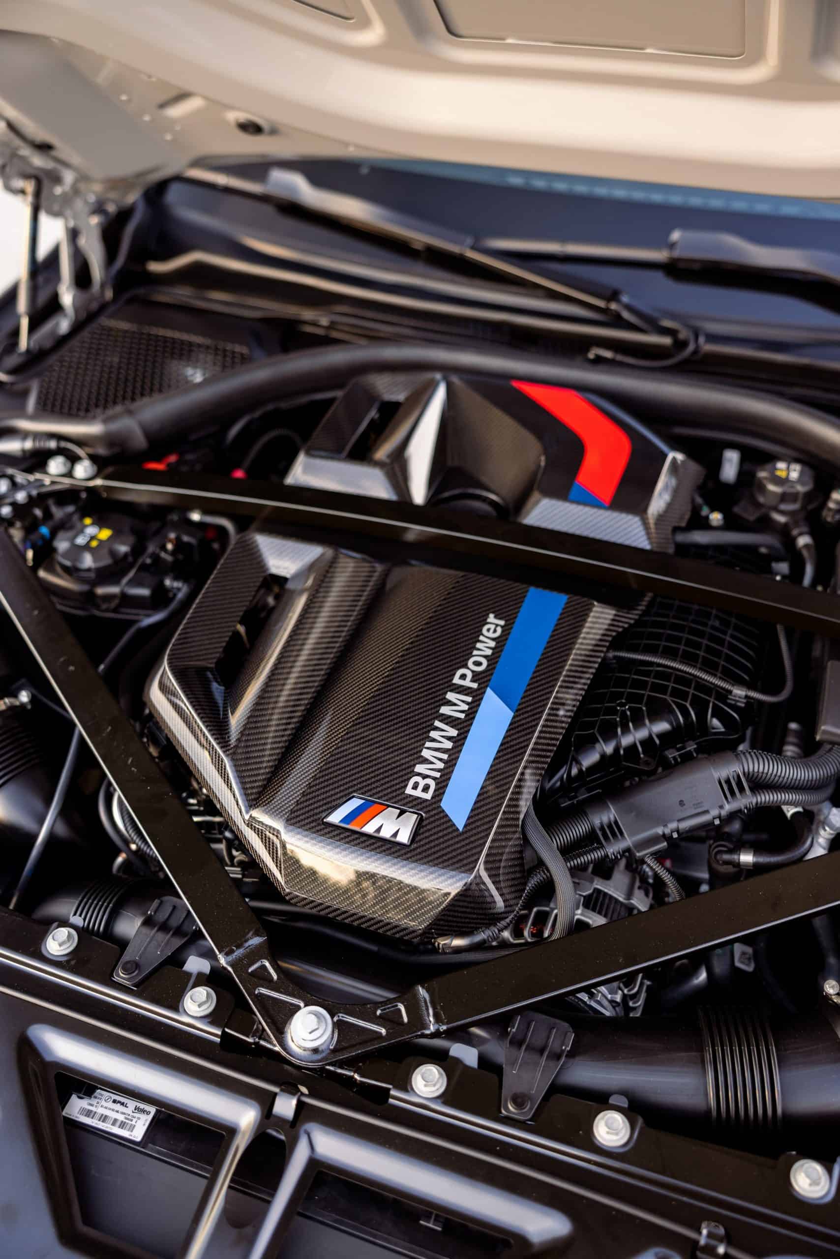 Carbon fiber is extensively used since it covers the shark fin antenna, fuel filler cap, side gills, and front canards. Rounding off the changes on the outside is the red tow strap with M branding, of course. Pop the hood and there’s a carbon engine cover with prominent BMW M Power badging like in the old days. As if that wasn’t enough, a large M logo is proudly displayed as well.